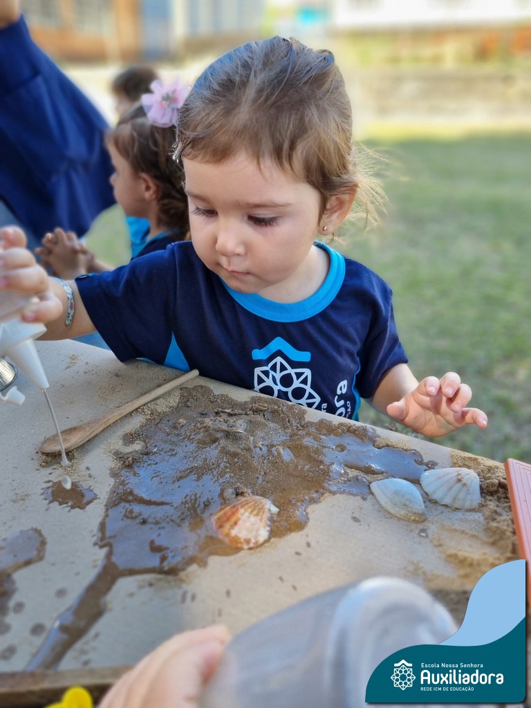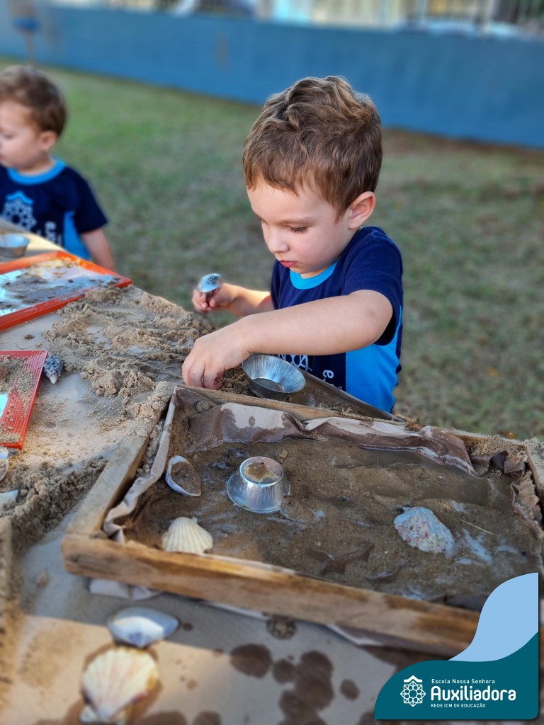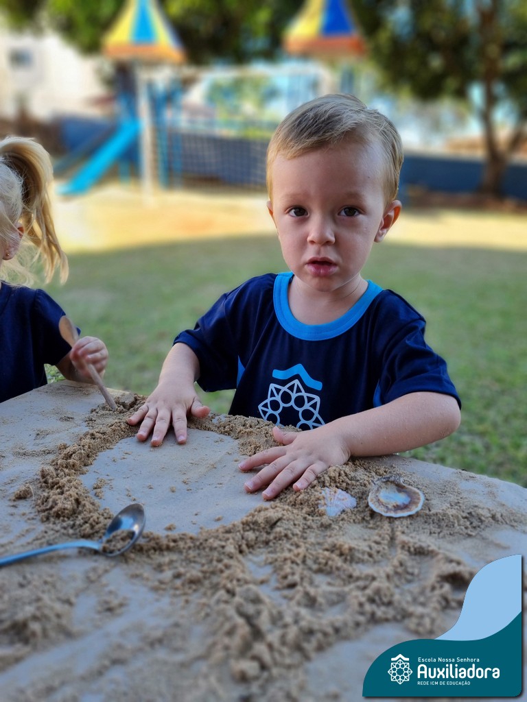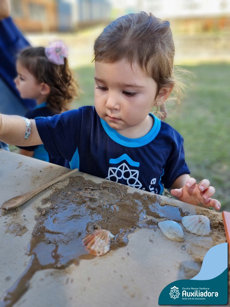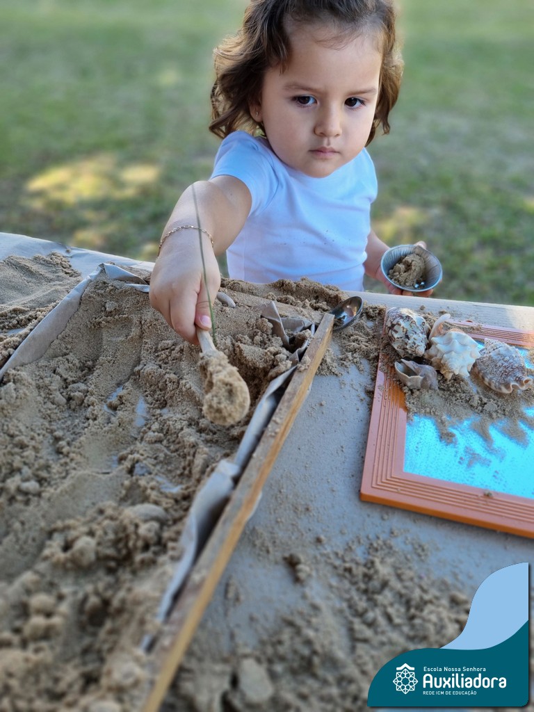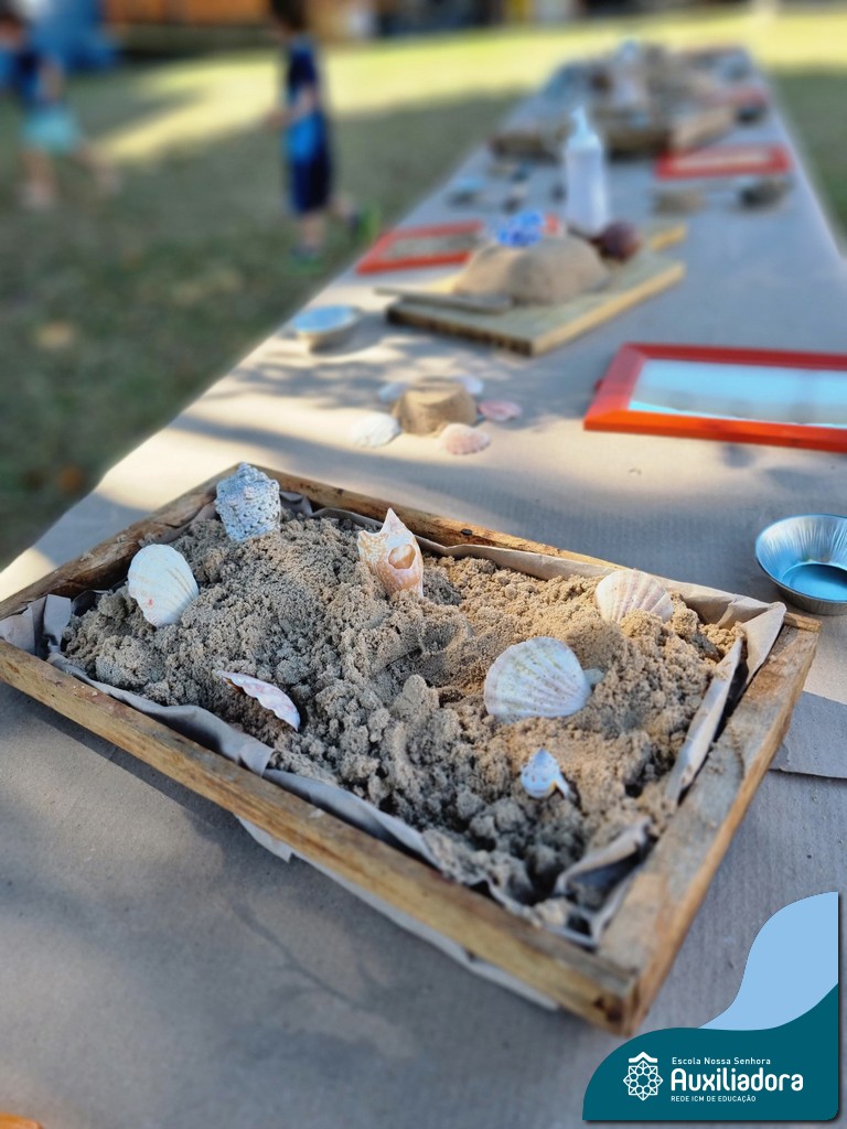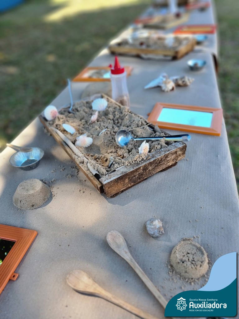 Nossa turma mergulhou em uma experiência sensorial incrível! Com areia, conchas, espelhos e diferentes ferramentas, exploramos texturas, formas e possibilidades de criação. O contato com elementos naturais desperta a curiosidade e amplia as descobertas.