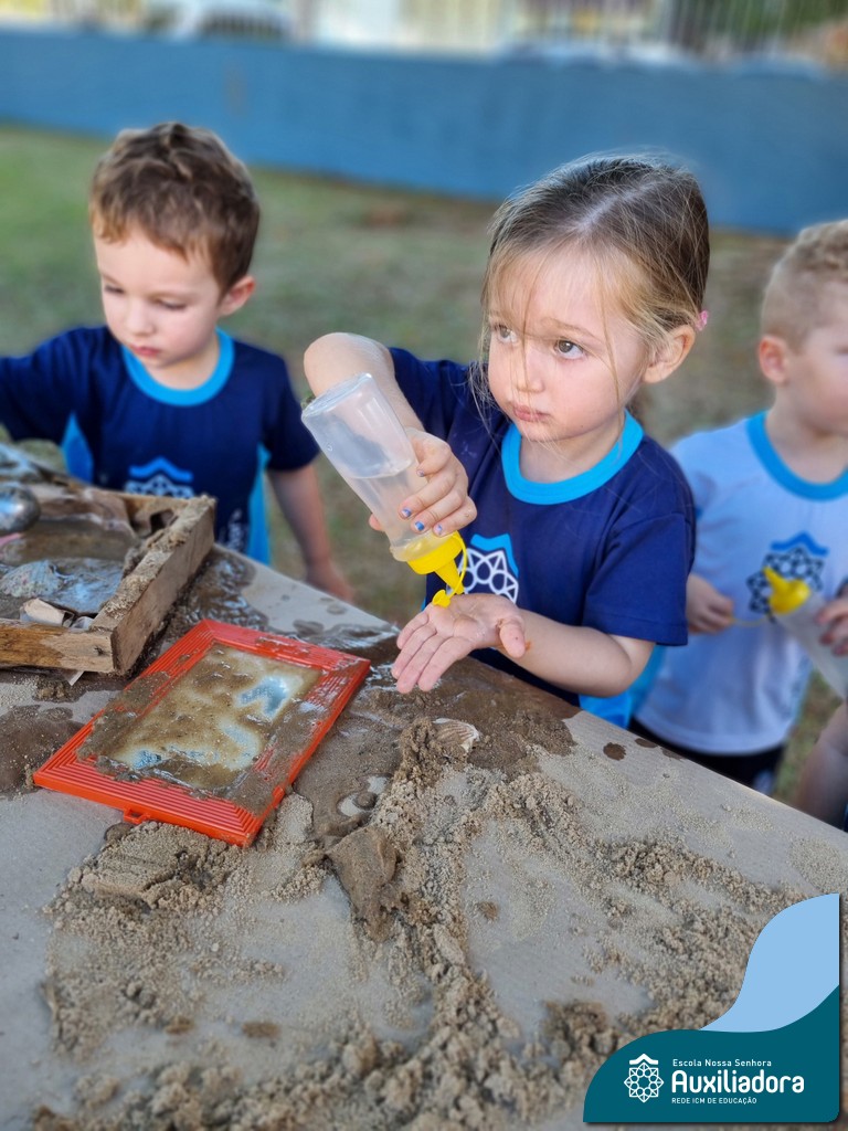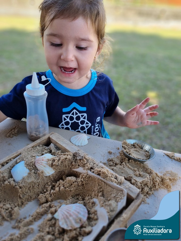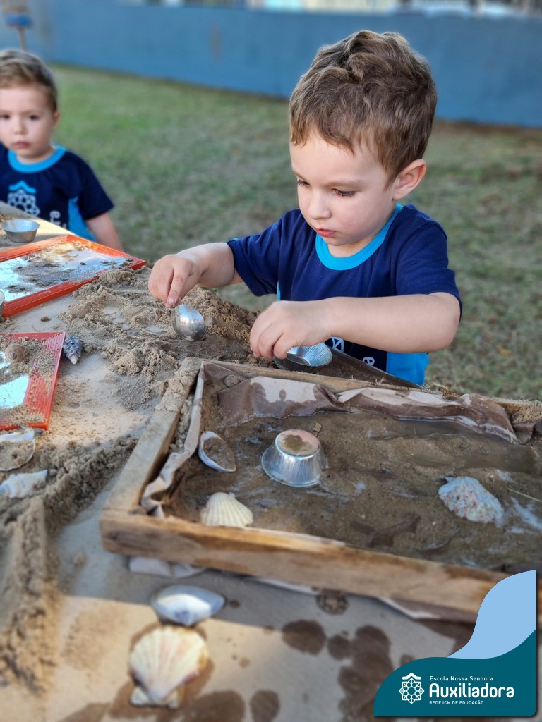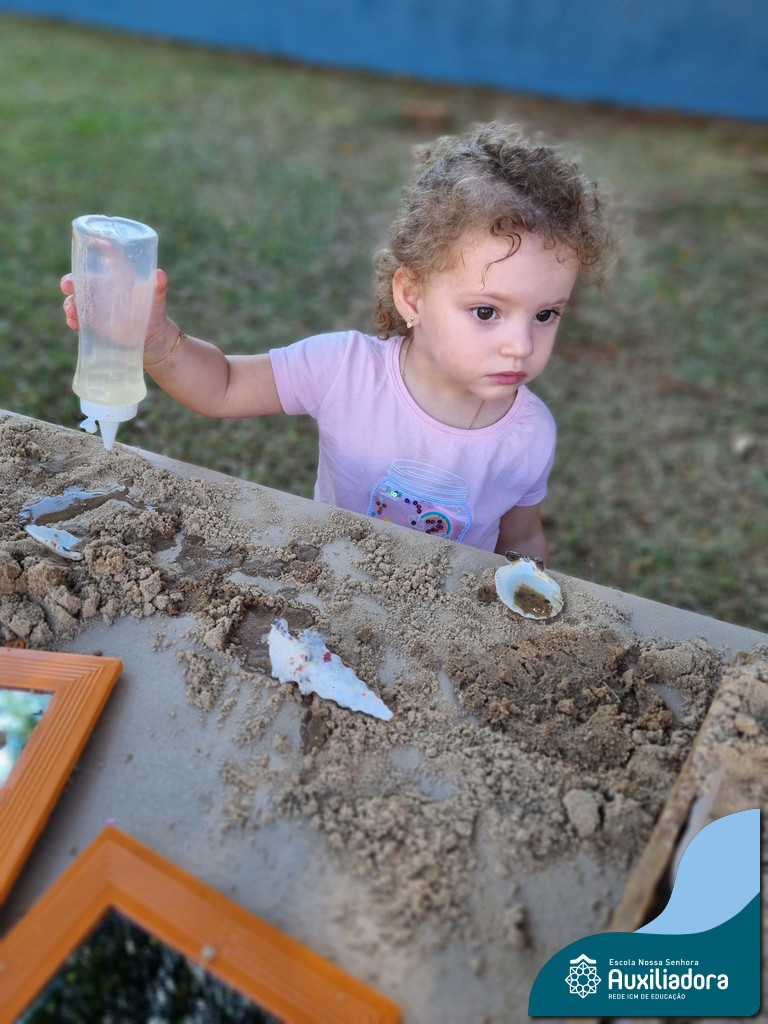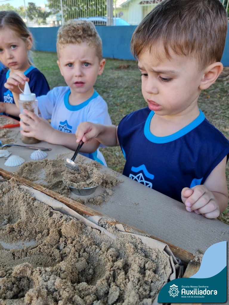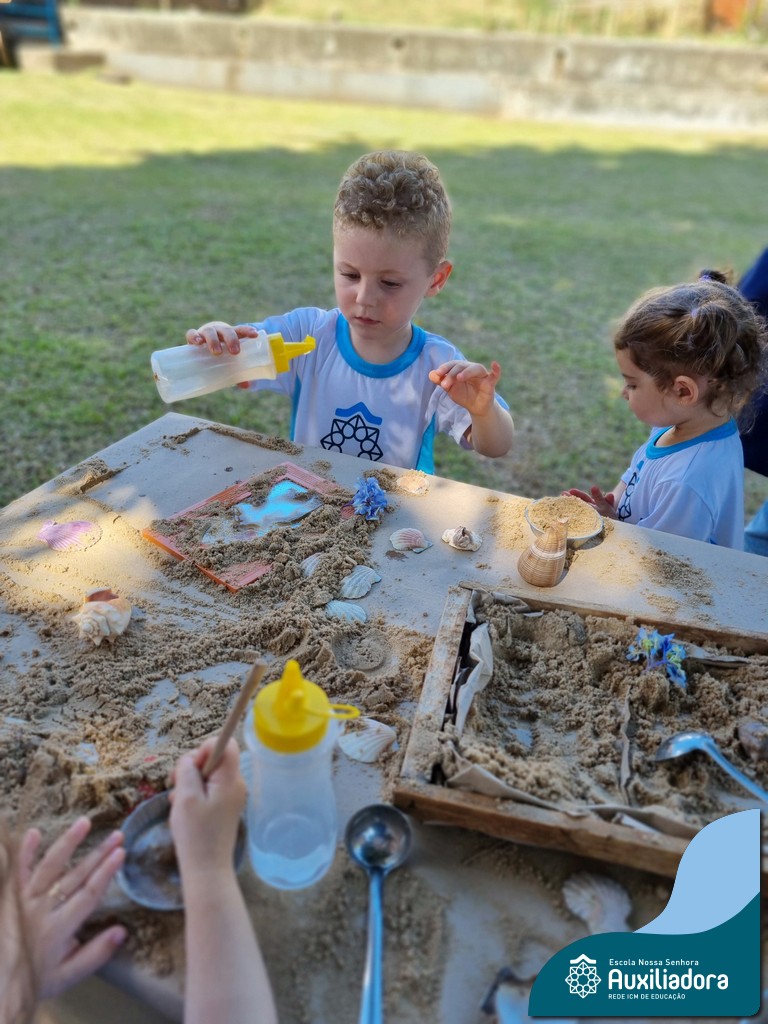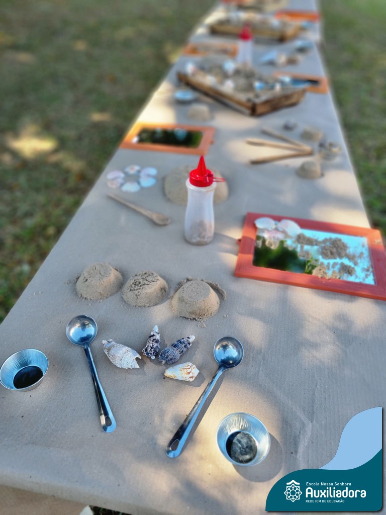 Nossa turma mergulhou em uma experiência sensorial incrível! Com areia, conchas, espelhos e diferentes ferramentas, exploramos texturas, formas e possibilidades de criação. O contato com elementos naturais desperta a curiosidade e amplia as descobertas.