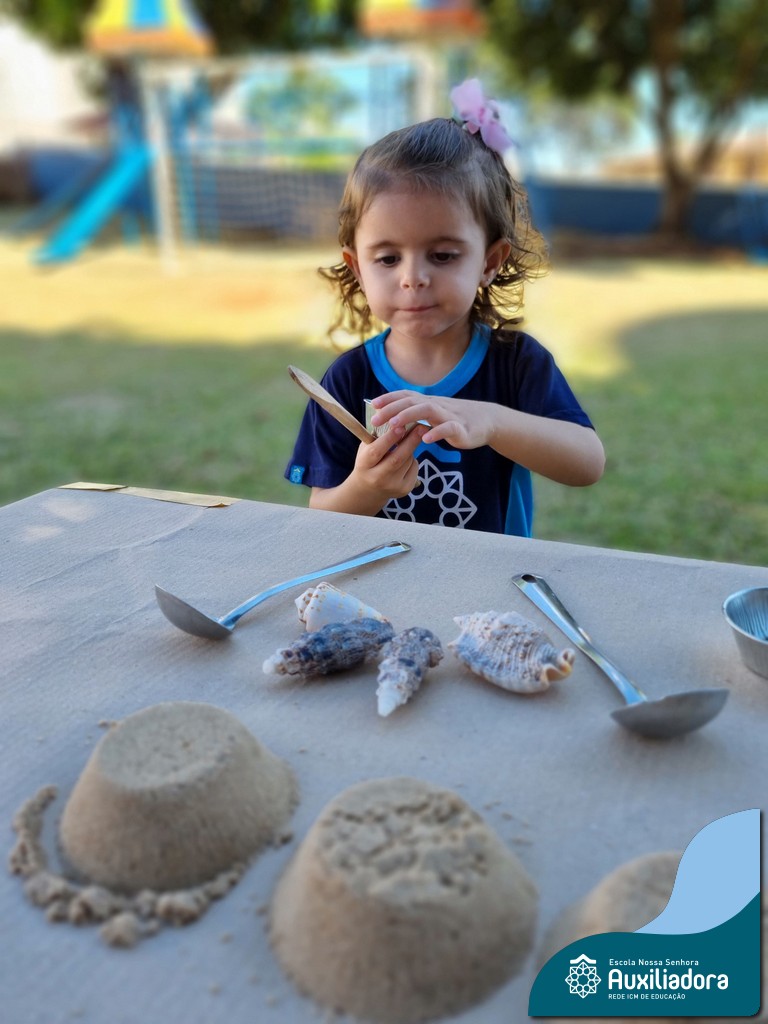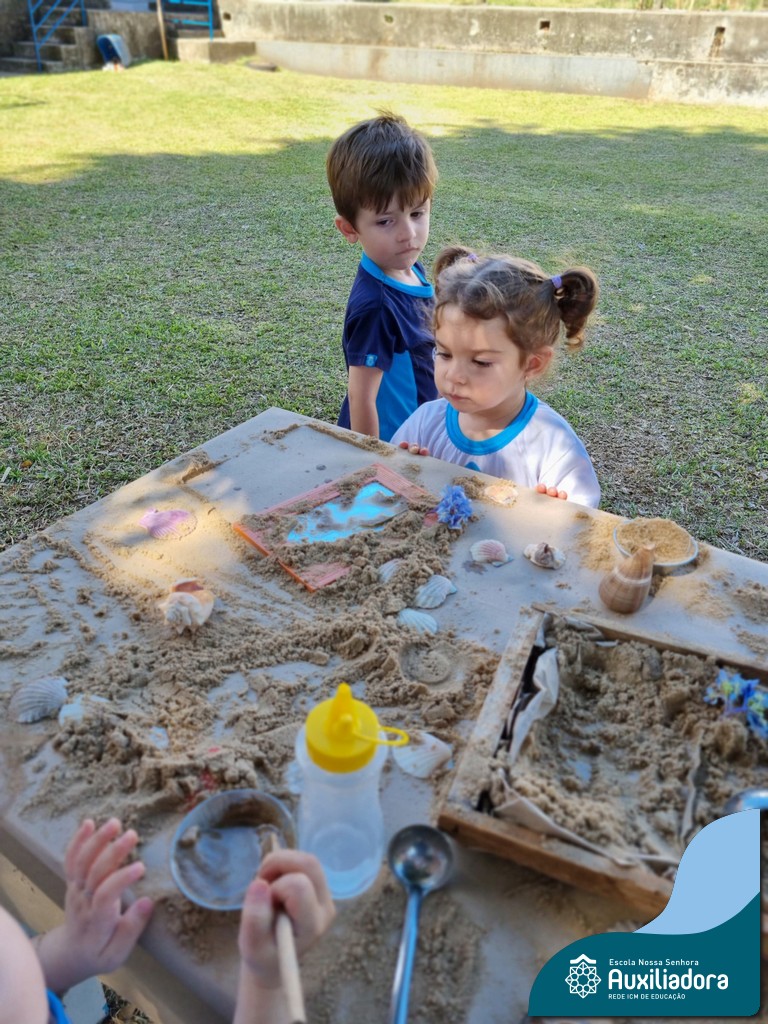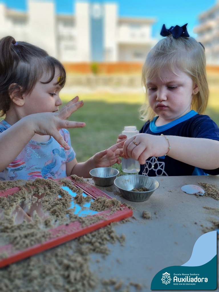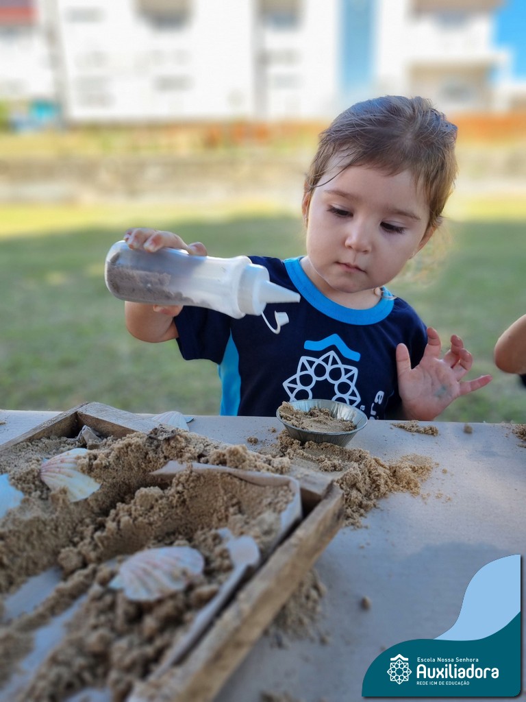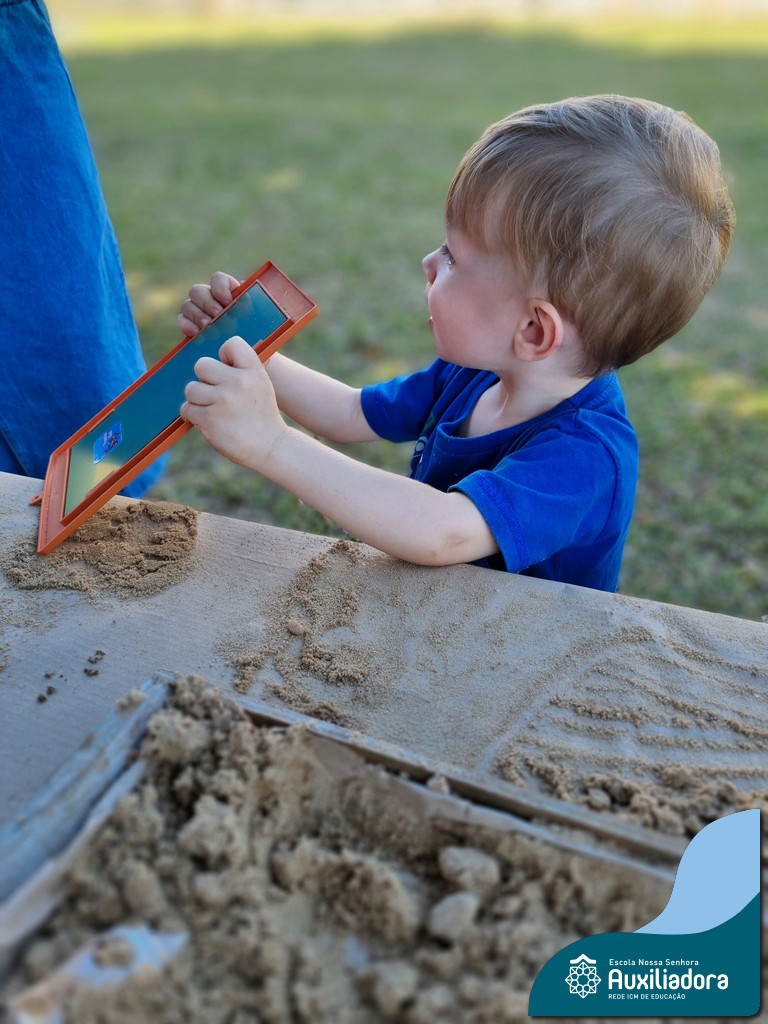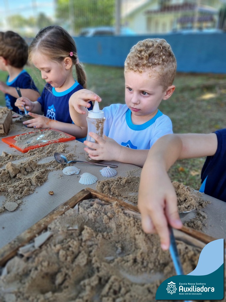 Nossa turma mergulhou em uma experiência sensorial incrível! Com areia, conchas, espelhos e diferentes ferramentas, exploramos texturas, formas e possibilidades de criação. O contato com elementos naturais desperta a curiosidade e amplia as descobertas.