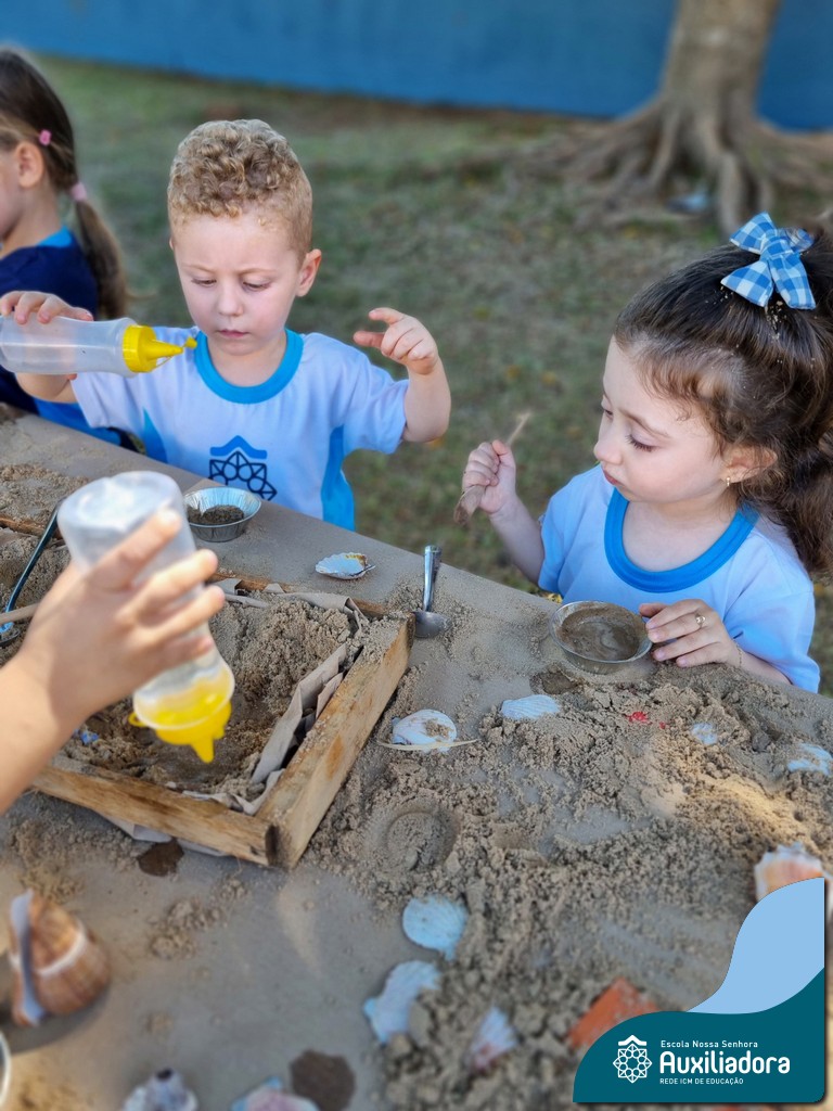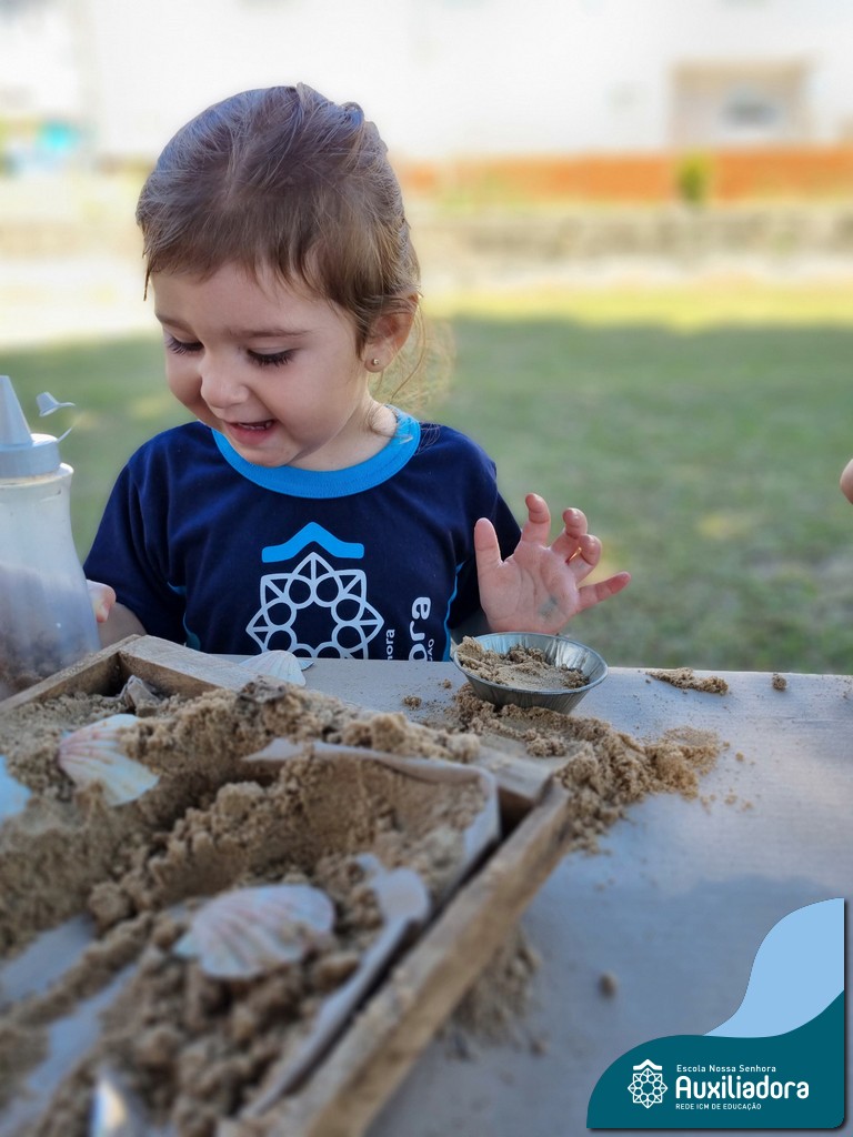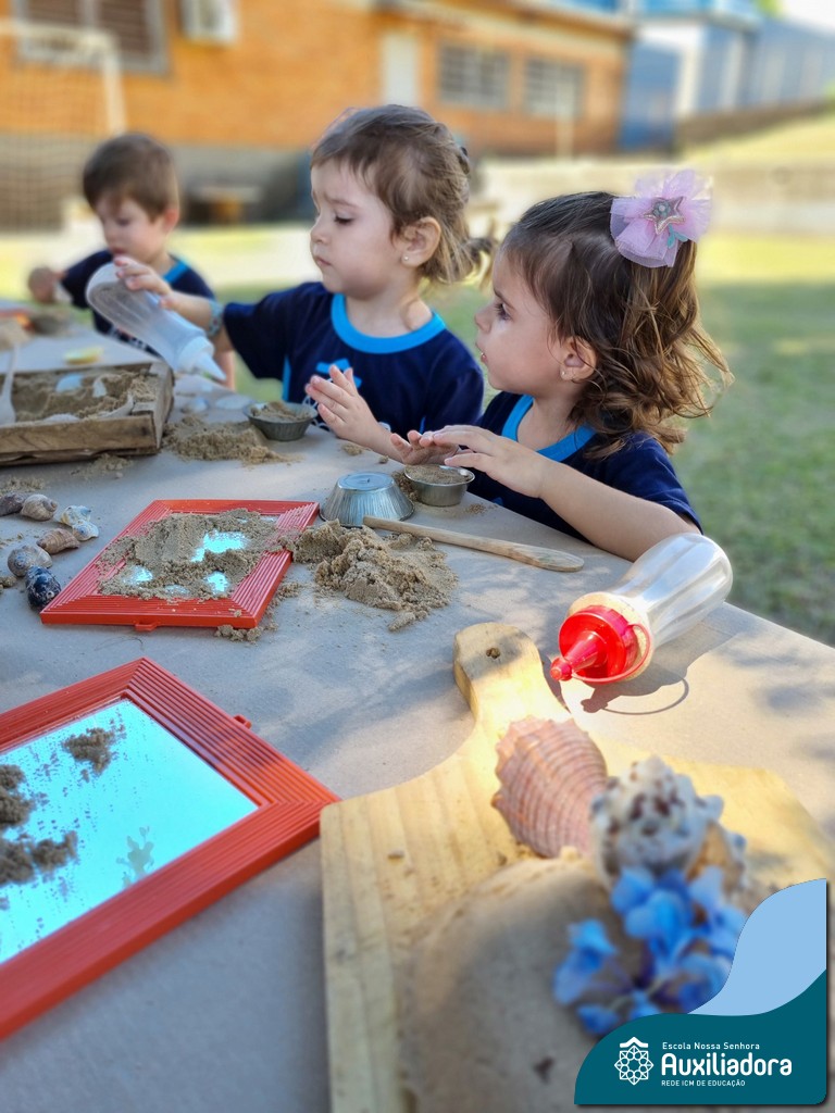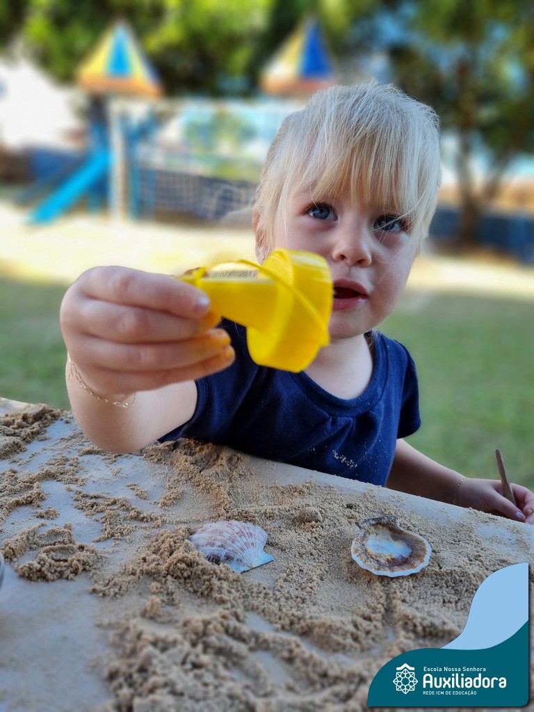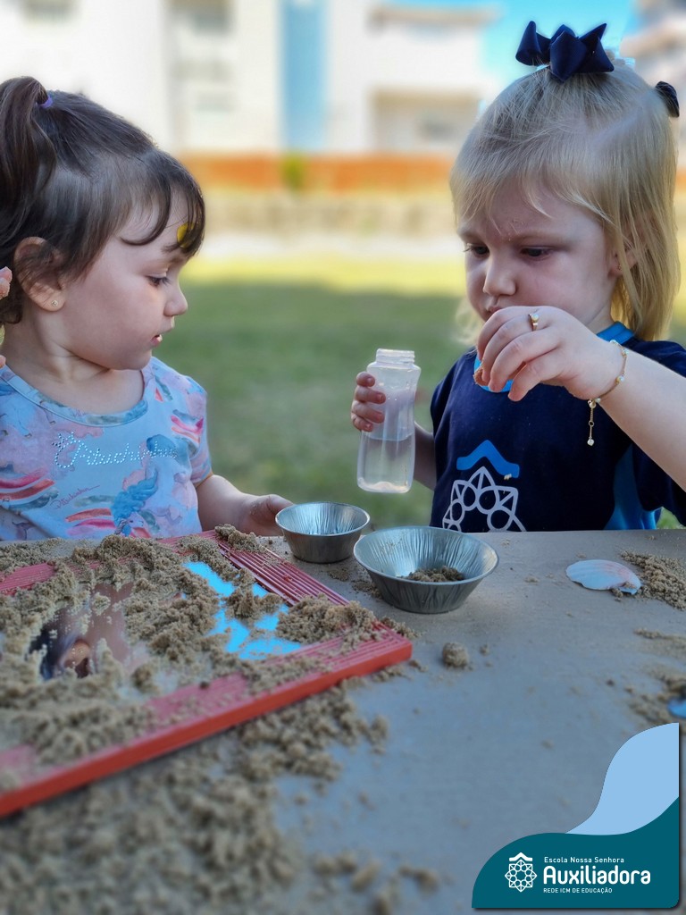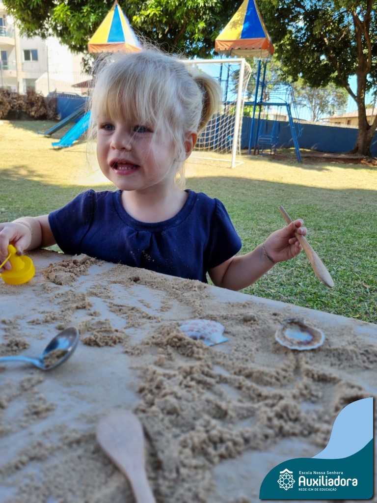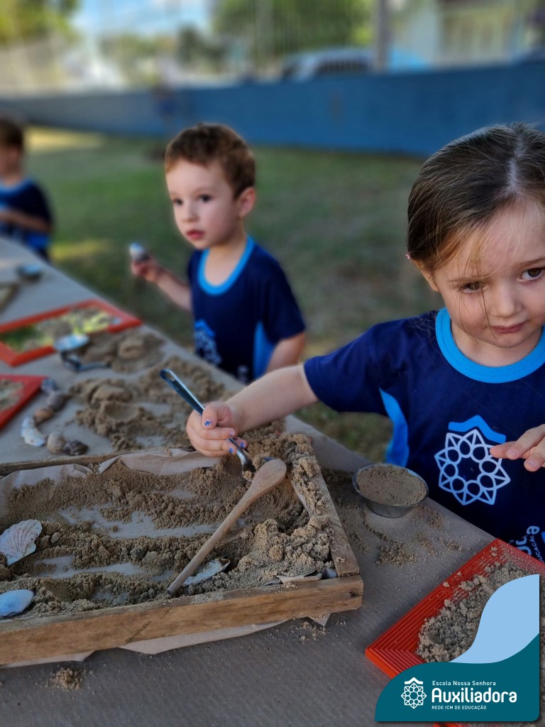 Nossa turma mergulhou em uma experiência sensorial incrível! Com areia, conchas, espelhos e diferentes ferramentas, exploramos texturas, formas e possibilidades de criação. O contato com elementos naturais desperta a curiosidade e amplia as descobertas.