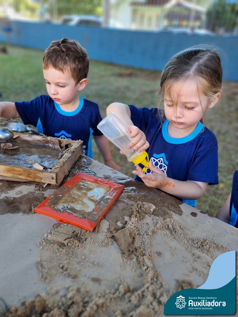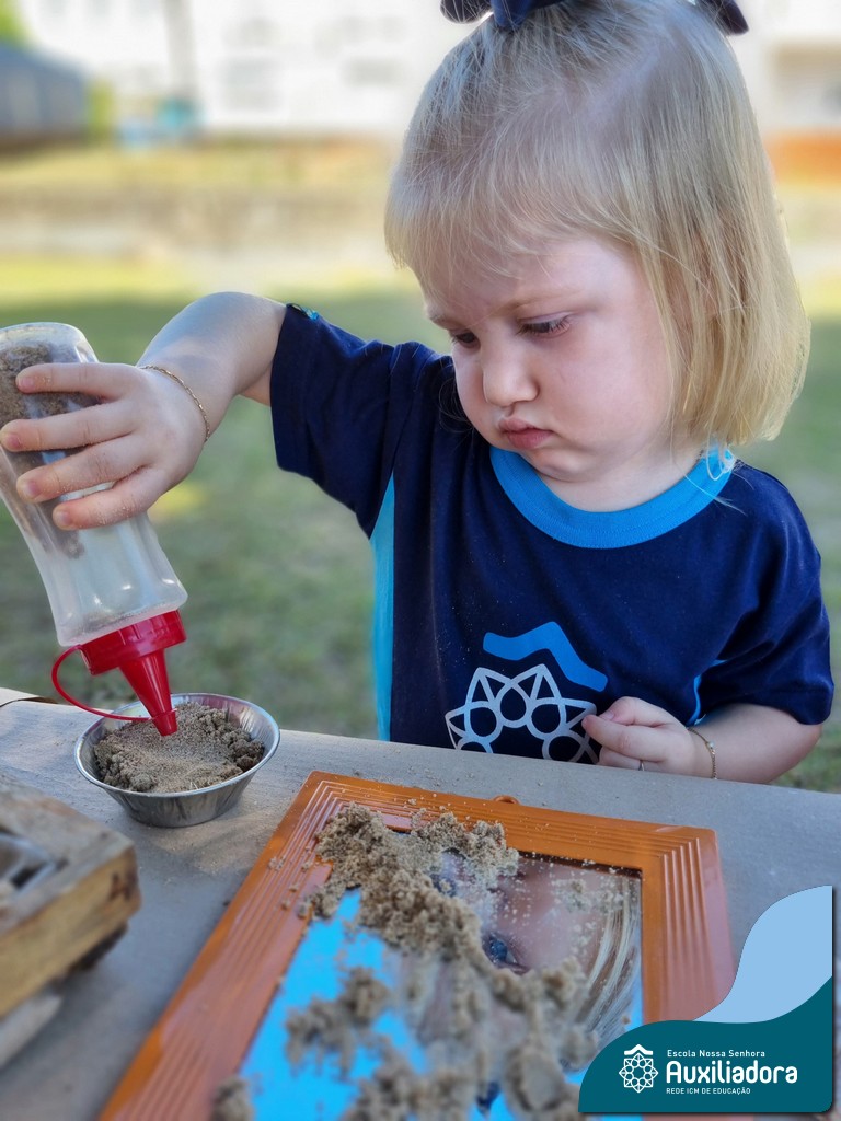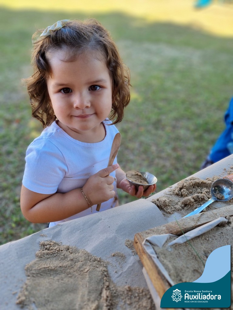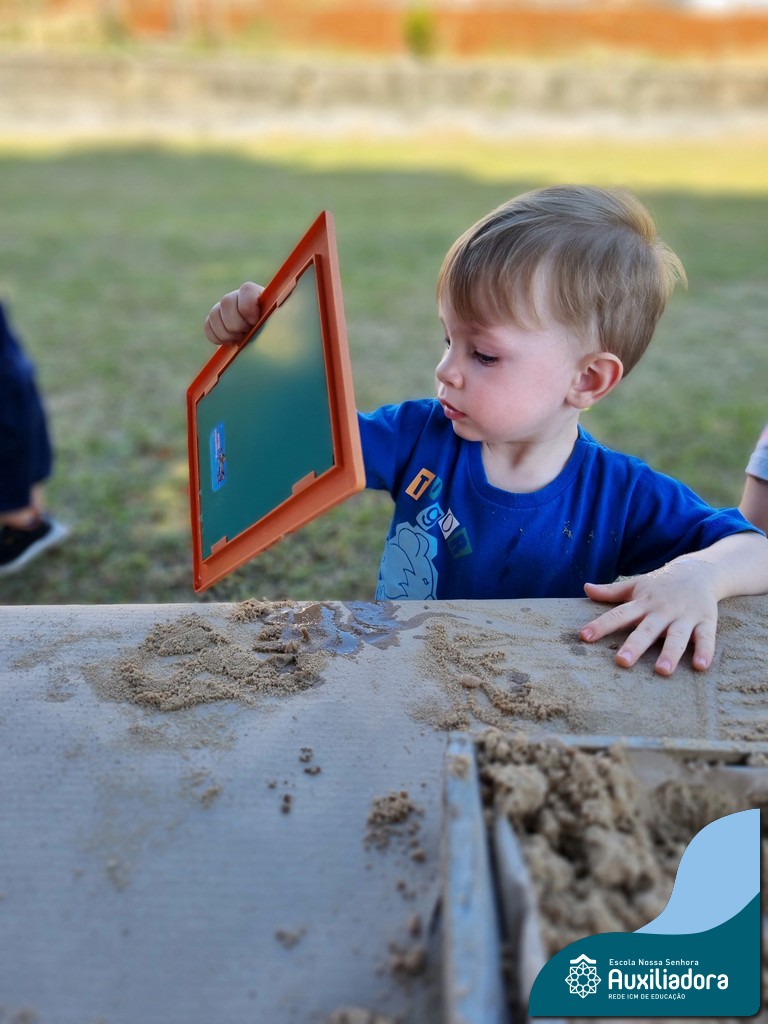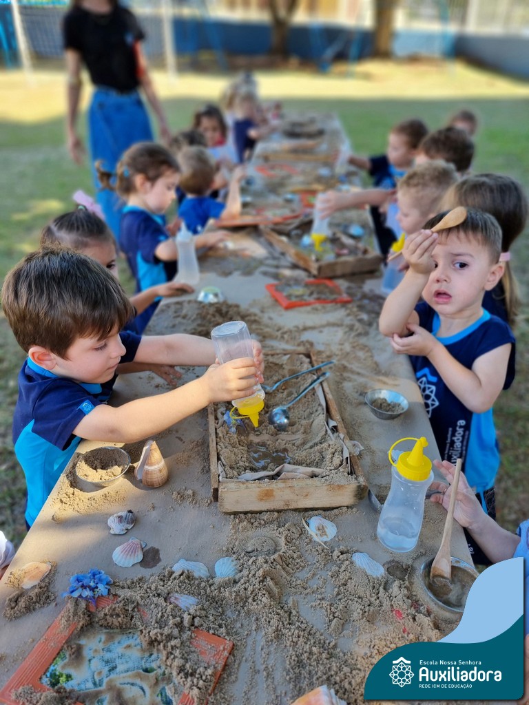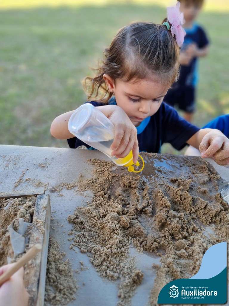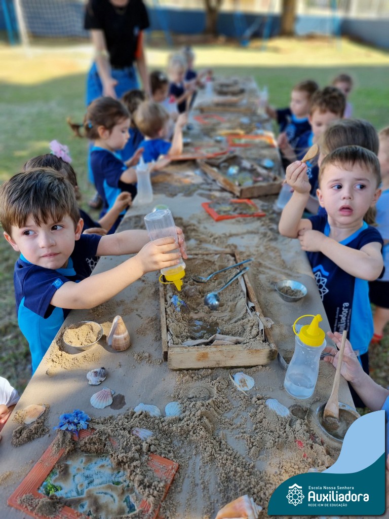 Nossa turma mergulhou em uma experiência sensorial incrível! Com areia, conchas, espelhos e diferentes ferramentas, exploramos texturas, formas e possibilidades de criação. O contato com elementos naturais desperta a curiosidade e amplia as descobertas.