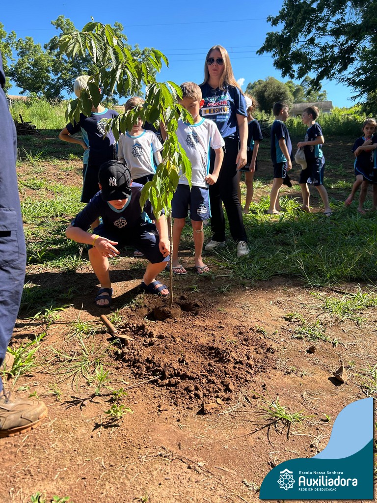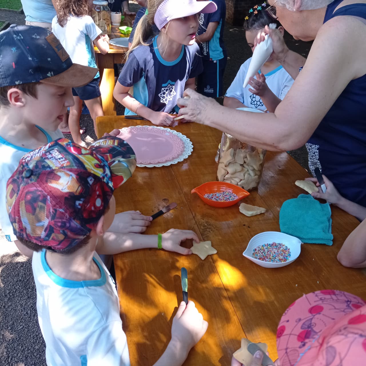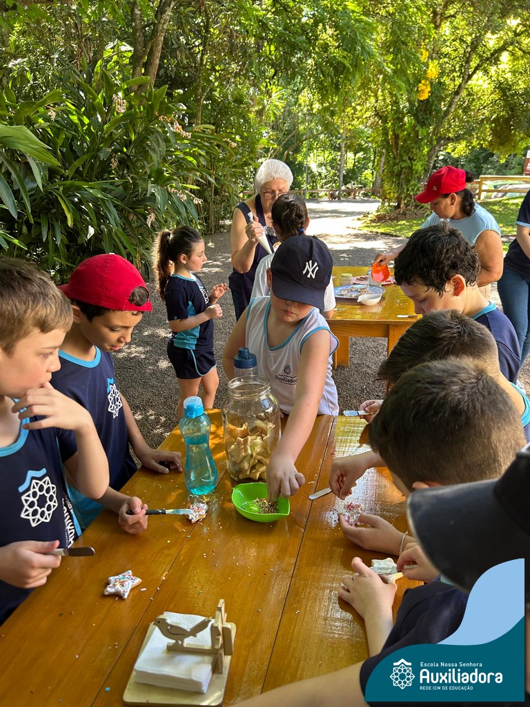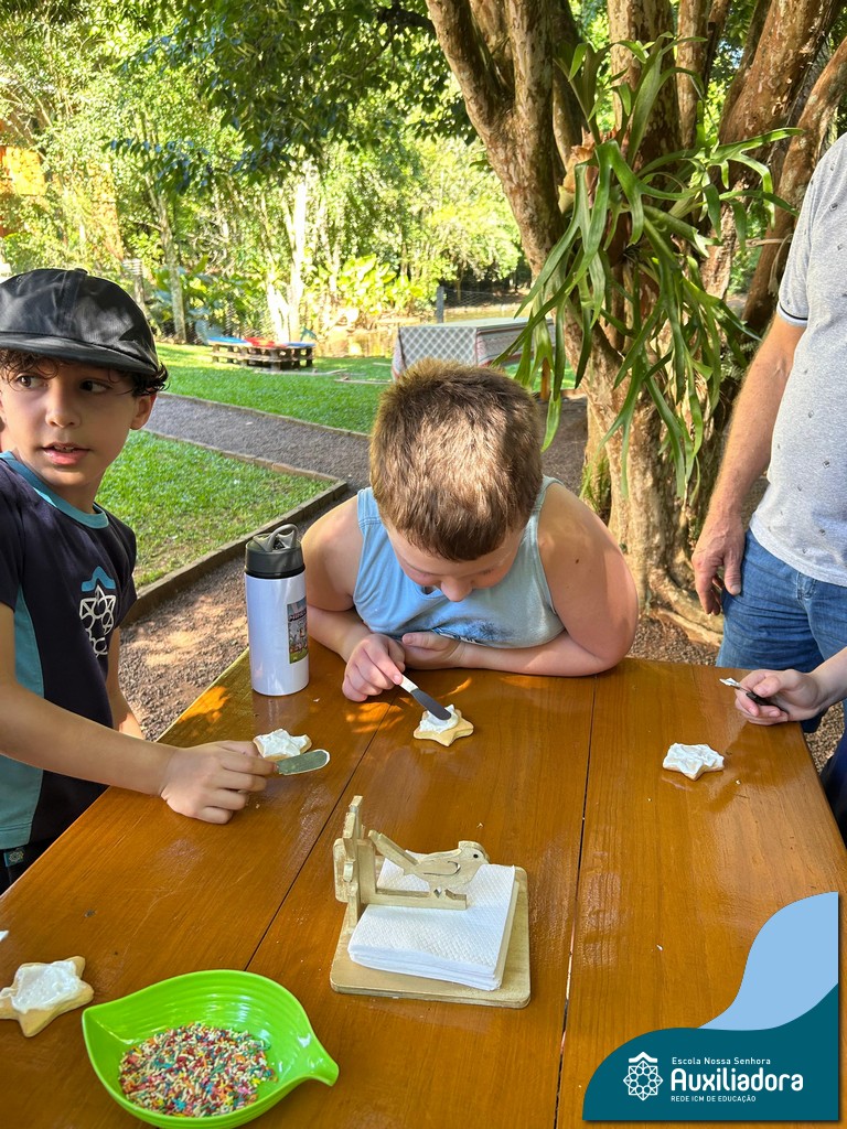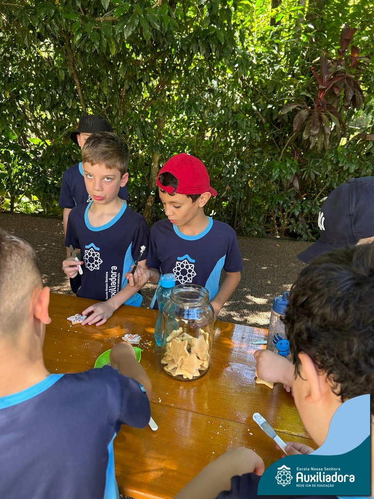 Teve também passeio de pedalinho no açude, pintura de bolachas de Natal, momentos de brincadeira, muita risada e animação e alegria que só as crianças têm. As turmas ainda mantiveram a tradição de plantar a árvore da turma, que fica registrada na propriedade como memória desse dia tão especial. 🌱✨