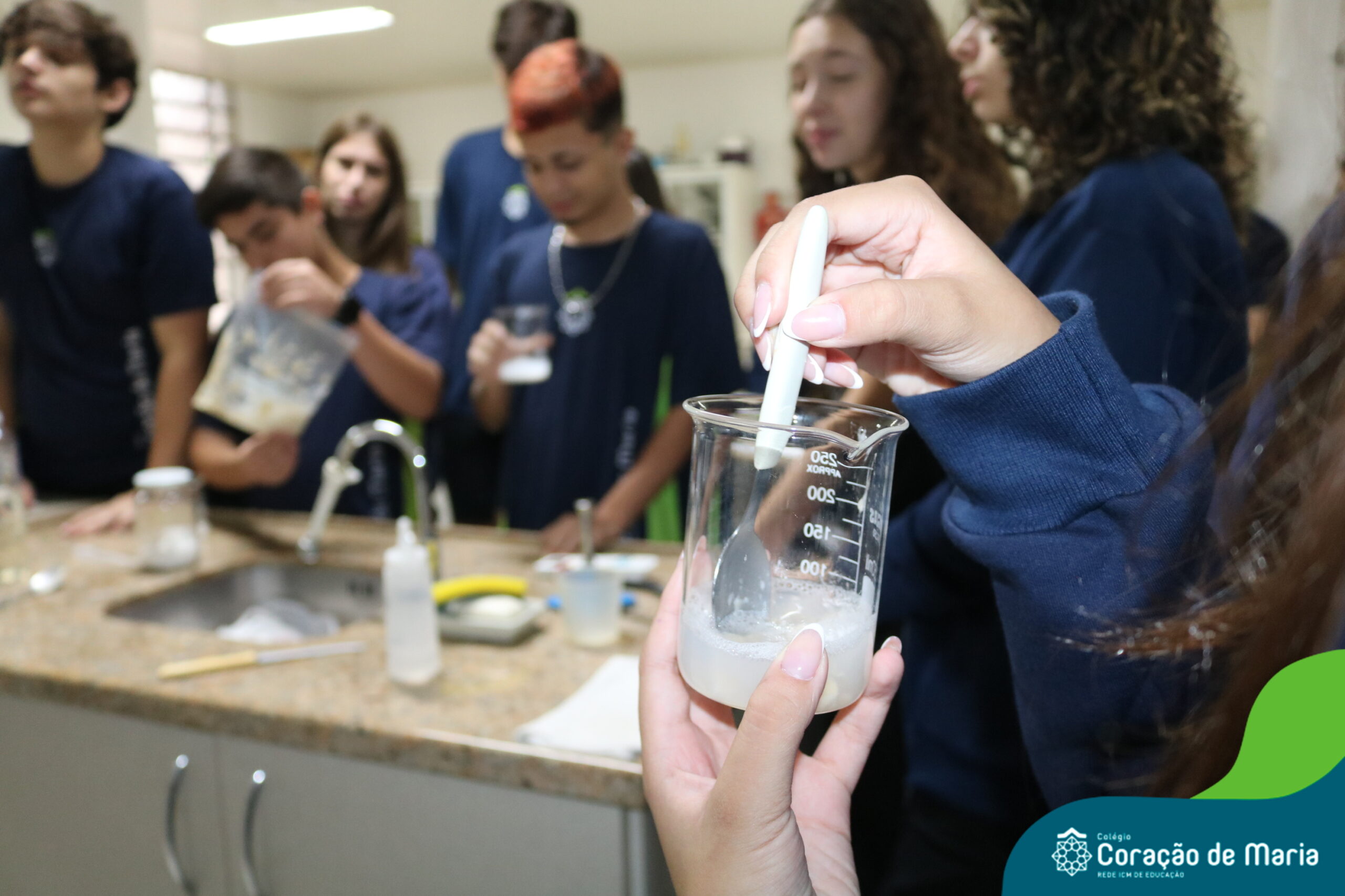 Na primeira série do Ensino Médio, os alunos mergulharam de cabeça na ciência da vida! Sob a orientação do educador Fábio, da disciplina de Biologia, os alunos desvendaram a extração de DNA de uma banana. Com o objetivo de visualizar e contextualizar a molécula de DNA, equipados com curiosidade e alguns materiais especiais e substâncias, testemunharam o surgimento das moléculas nos tubos de ensaio, revelando a formação de um amontoado de moléculas de DNA.