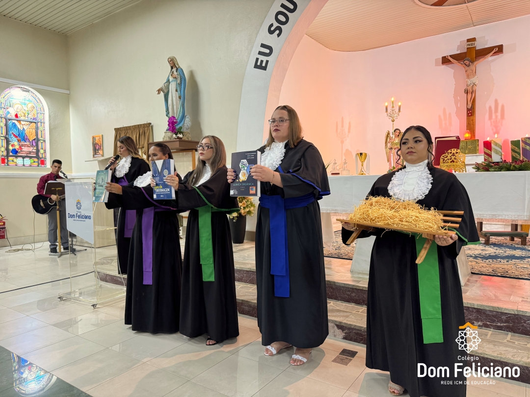 Na noite de 19 de dezembro, o Colégio Dom Feliciano viveu um momento especial marcado por fé, emoção e gratidão. Em um ambiente de espiritualidade e acolhimento, os estudantes dos Cursos Profissionalizantes — Técnico em Química, Técnico em Enfermagem e Curso Normal Pós-Médio — reuniram-se na capela do colégio para celebrar suas conquistas em uma significativa Celebração de Ação de Graças.