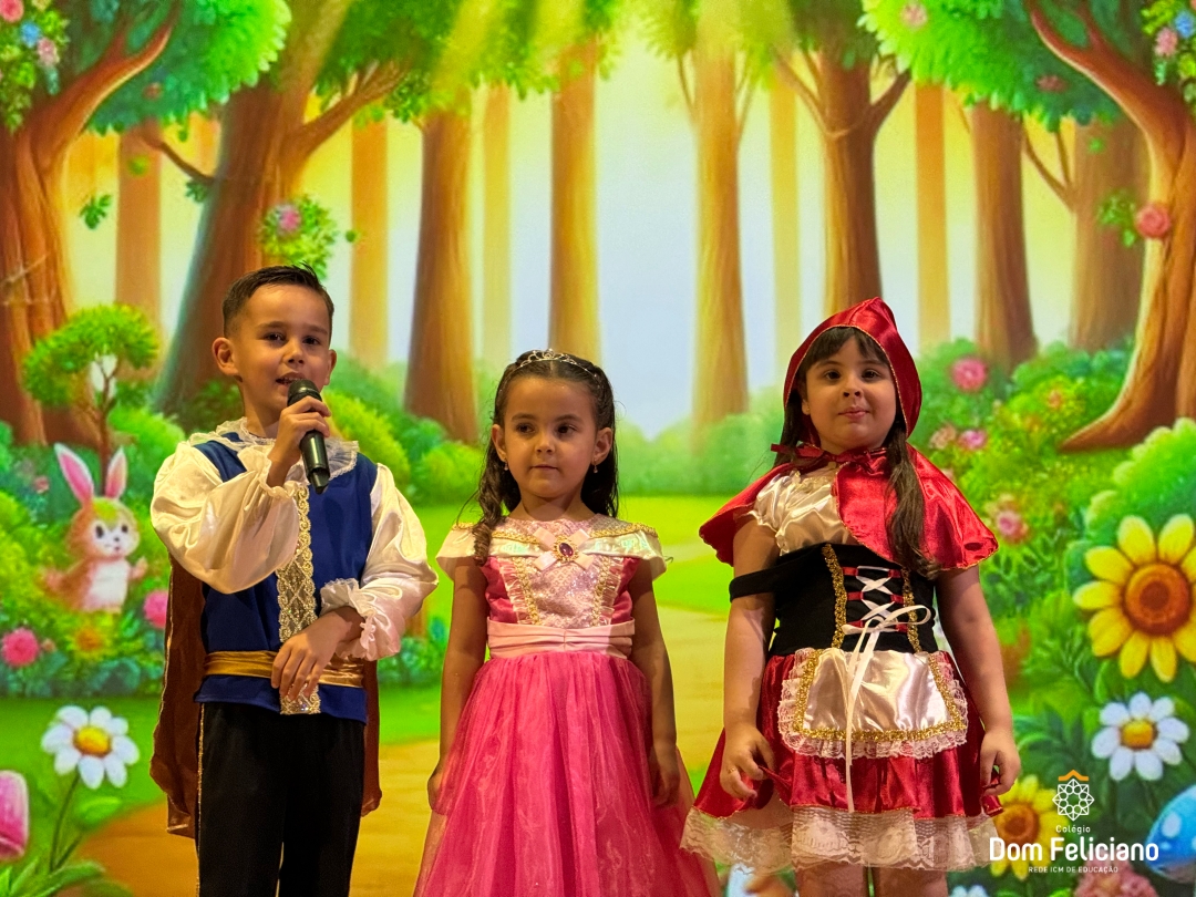 Como parte das atividades, os estudantes transformaram clássicos contos infantis em verdadeiros espetáculos teatrais. Durante as apresentações, exploraram diferentes formas de linguagem, exercitaram a imaginação, expressaram emoções e fortaleceram o trabalho em equipe.