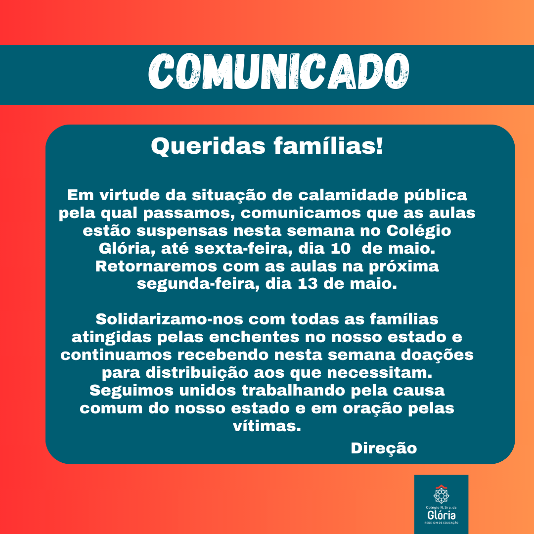 Em virtude da situação de calamidade pública pela qual passamos, comunicamos que as aulas estão suspensas nesta semana no Colégio Glória, até sexta-feira, dia 10 de maio.