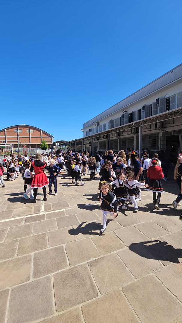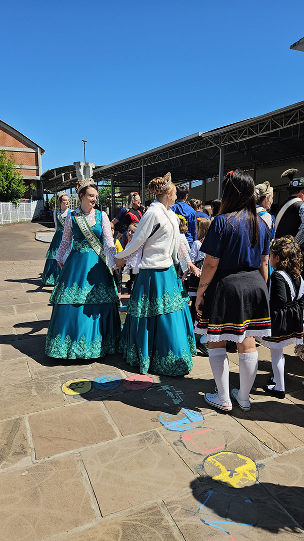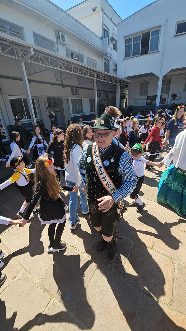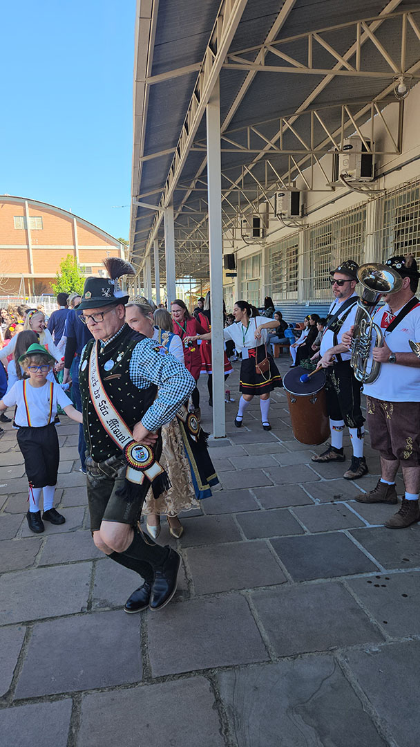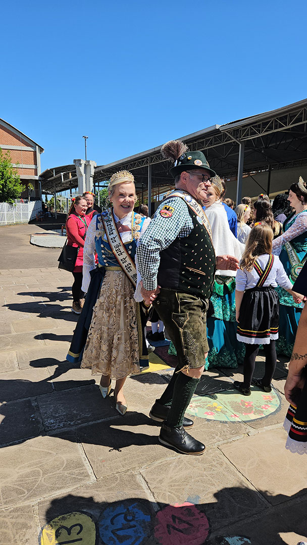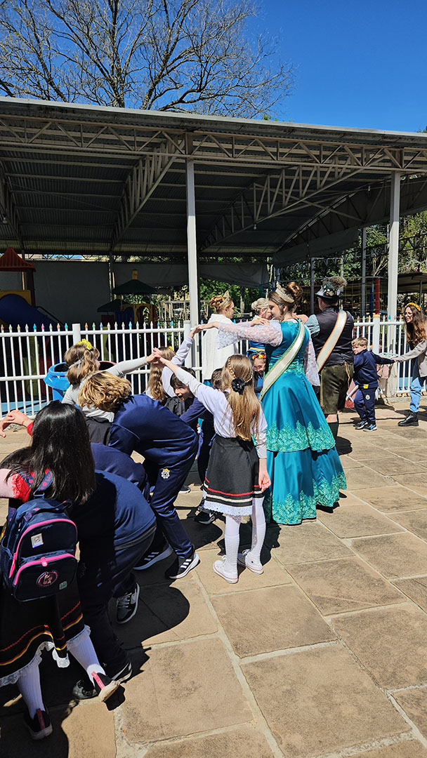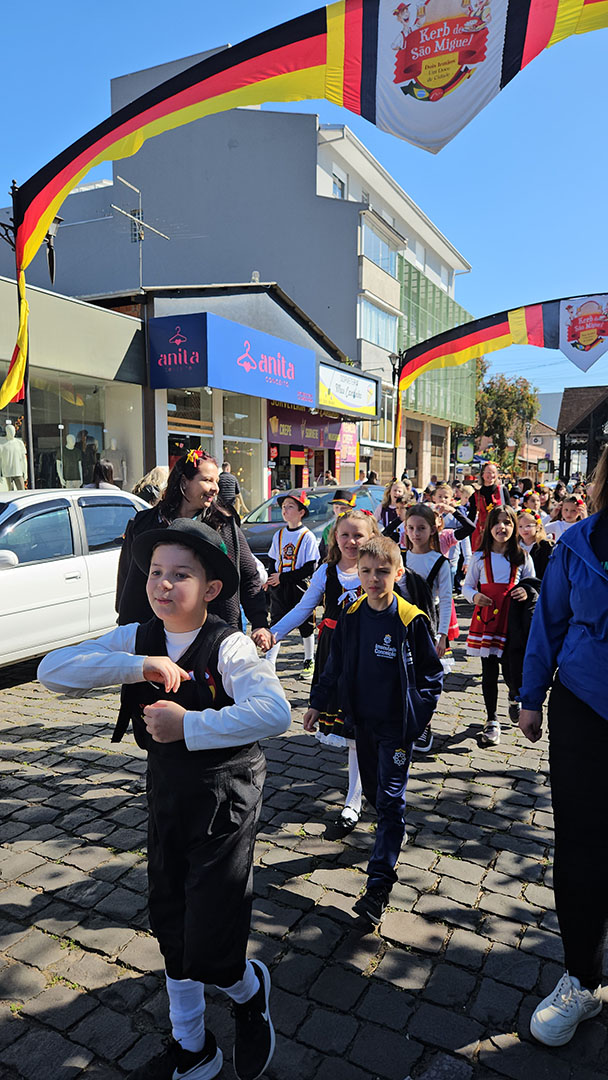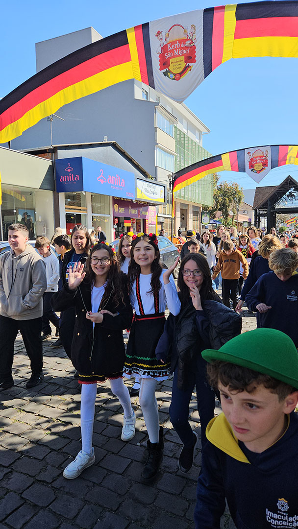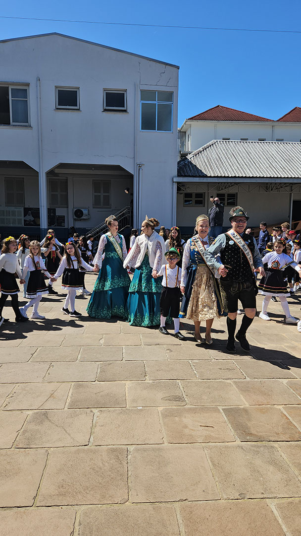 Logo após, a corte da cidade, acompanhada pelos bonecos dos personagens típicos da festa, iniciou um desfile pelas ruas do centro até os colégios, trazendo cor, música e alegria ao percurso. Já no pátio do Imaculada, as crianças foram recebidas com um delicioso lanche tradicional de Kerb. A festa seguiu com apresentação de bandinha ao vivo e, em seguida, a corte – com o Rei e a Rainha juntamente com as soberanas – conduziu a tão esperada Polonese, celebrando o momento de união e alegria entre estudantes, professores e auxiliares.