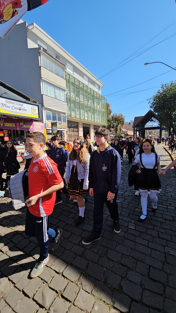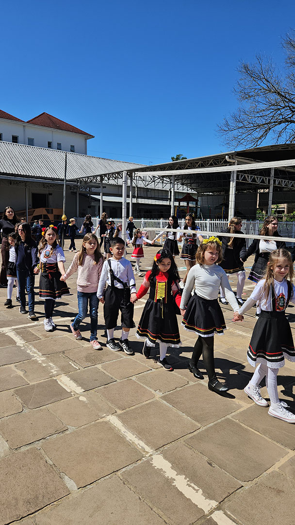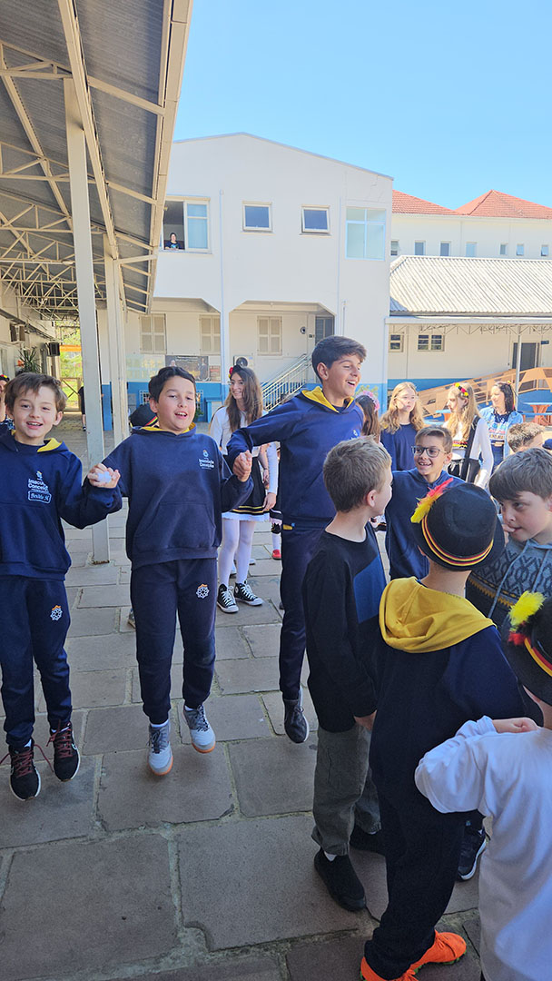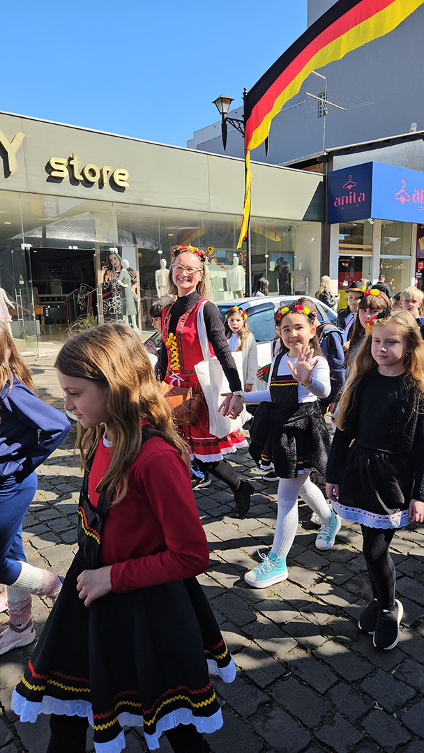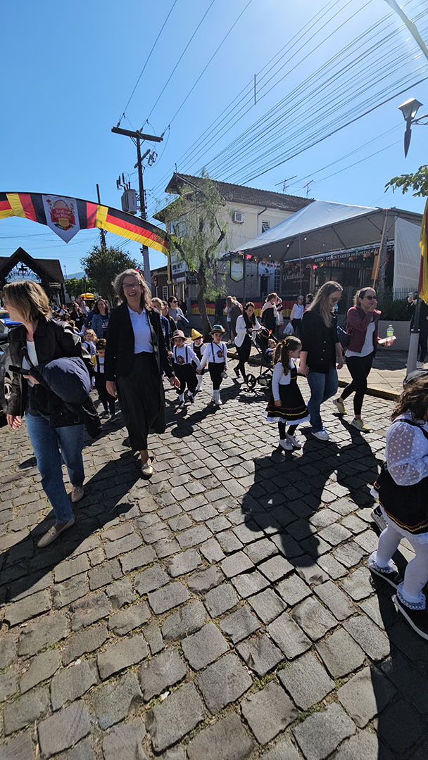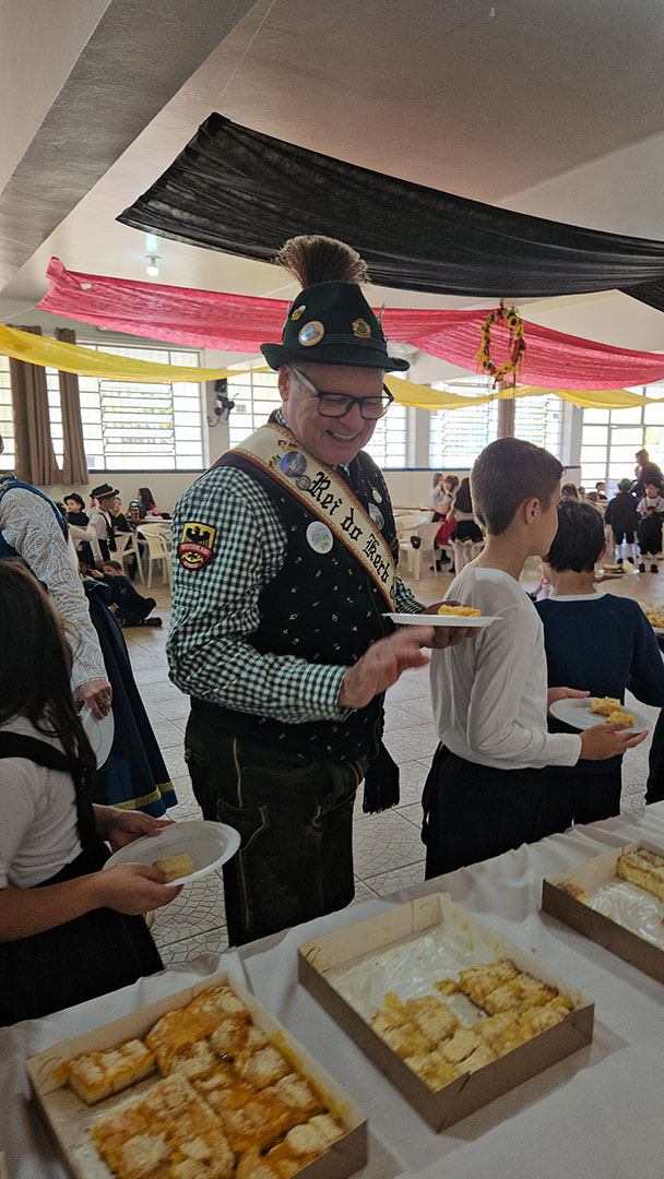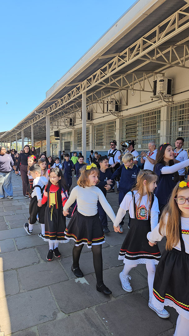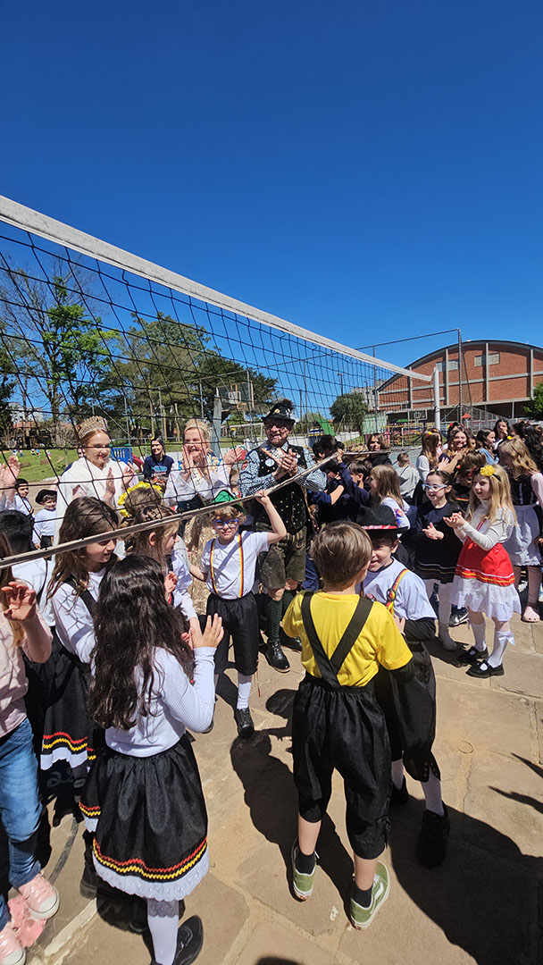 Logo após, a corte da cidade, acompanhada pelos bonecos dos personagens típicos da festa, iniciou um desfile pelas ruas do centro até os colégios, trazendo cor, música e alegria ao percurso. Já no pátio do Imaculada, as crianças foram recebidas com um delicioso lanche tradicional de Kerb. A festa seguiu com apresentação de bandinha ao vivo e, em seguida, a corte – com o Rei e a Rainha juntamente com as soberanas – conduziu a tão esperada Polonese, celebrando o momento de união e alegria entre estudantes, professores e auxiliares.