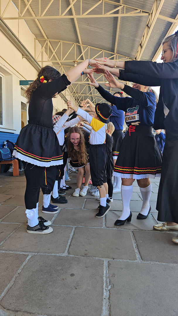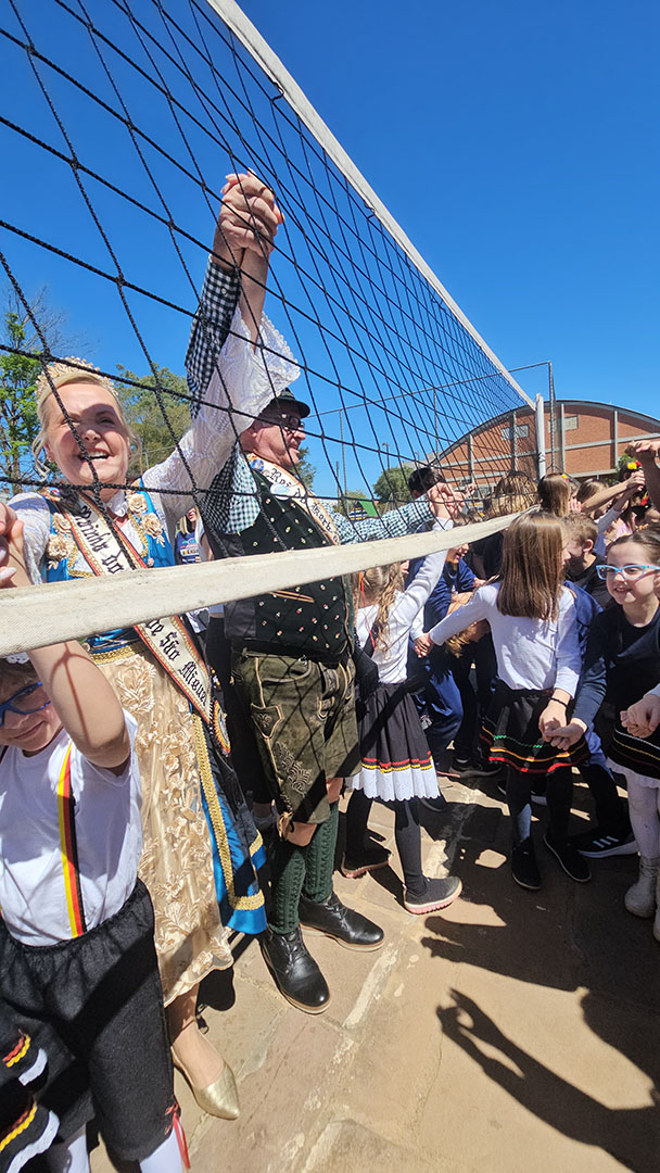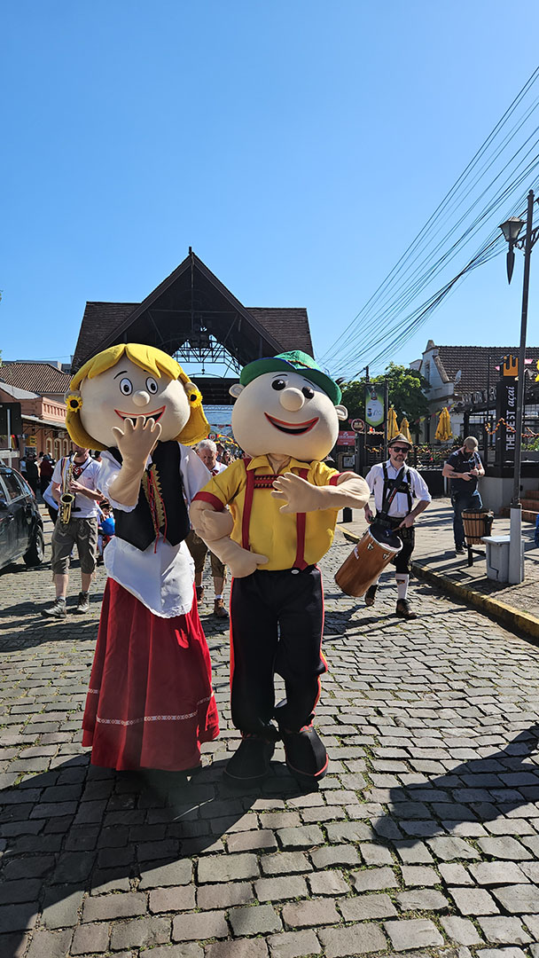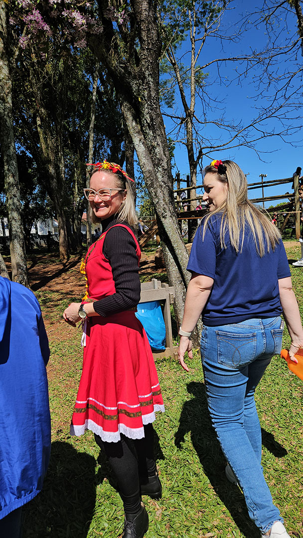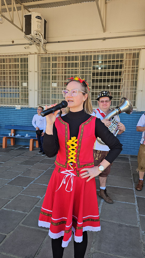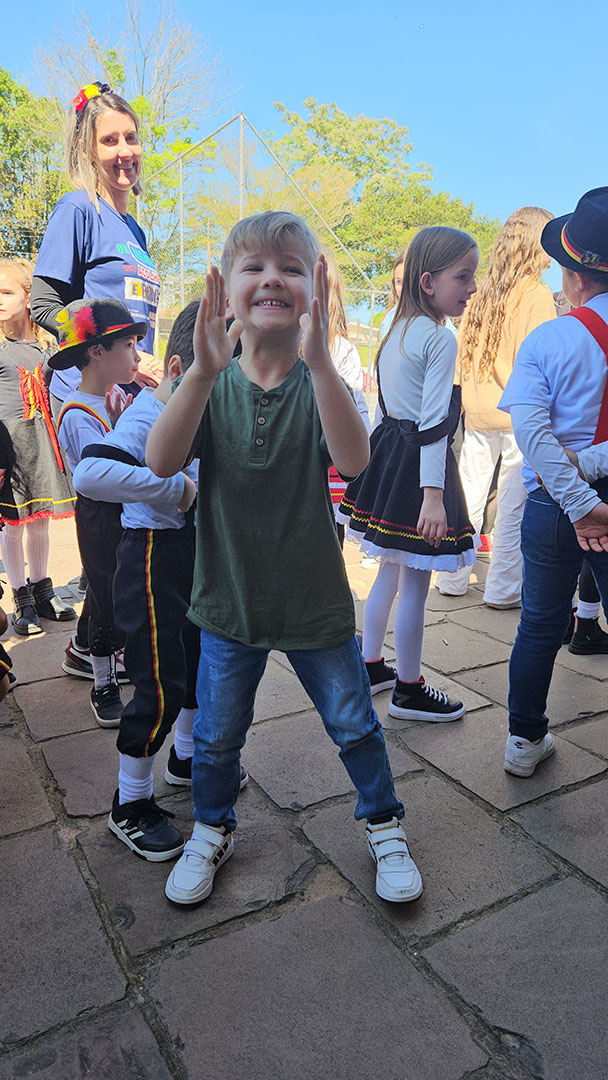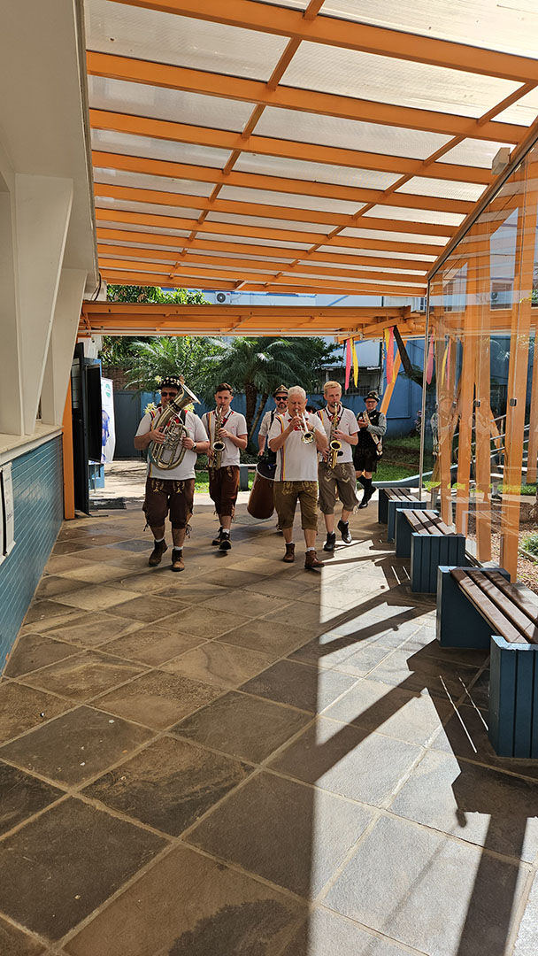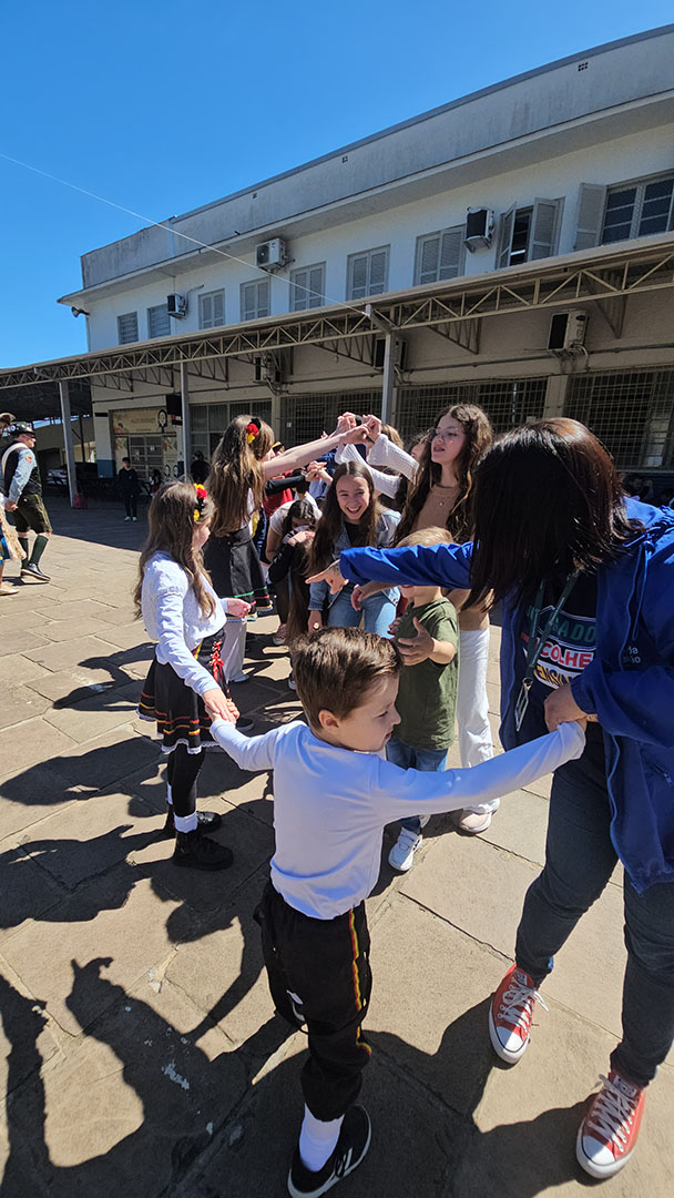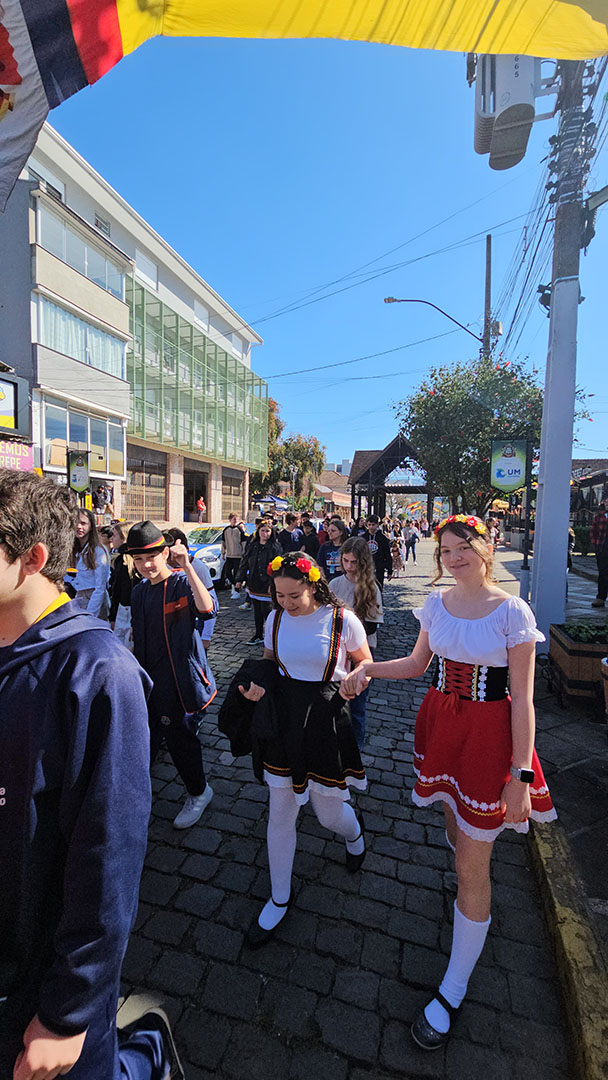 Logo após, a corte da cidade, acompanhada pelos bonecos dos personagens típicos da festa, iniciou um desfile pelas ruas do centro até os colégios, trazendo cor, música e alegria ao percurso. Já no pátio do Imaculada, as crianças foram recebidas com um delicioso lanche tradicional de Kerb. A festa seguiu com apresentação de bandinha ao vivo e, em seguida, a corte – com o Rei e a Rainha juntamente com as soberanas – conduziu a tão esperada Polonese, celebrando o momento de união e alegria entre estudantes, professores e auxiliares.