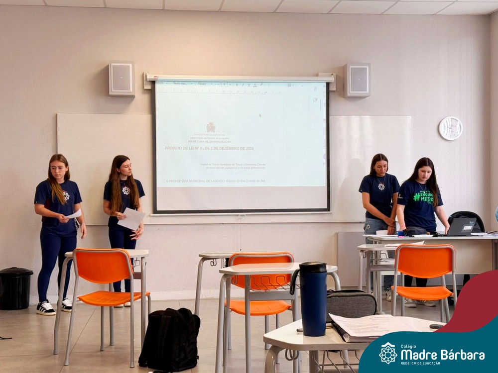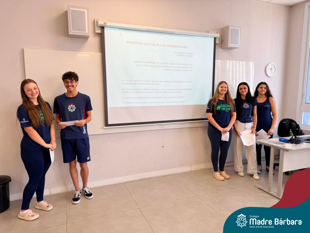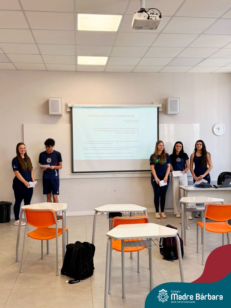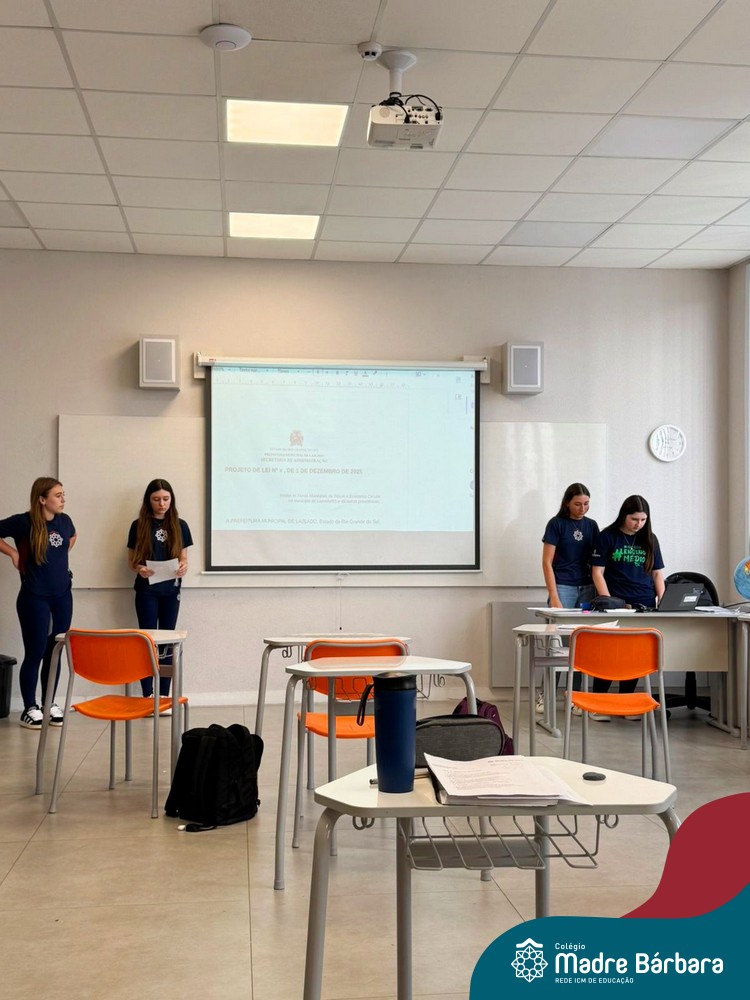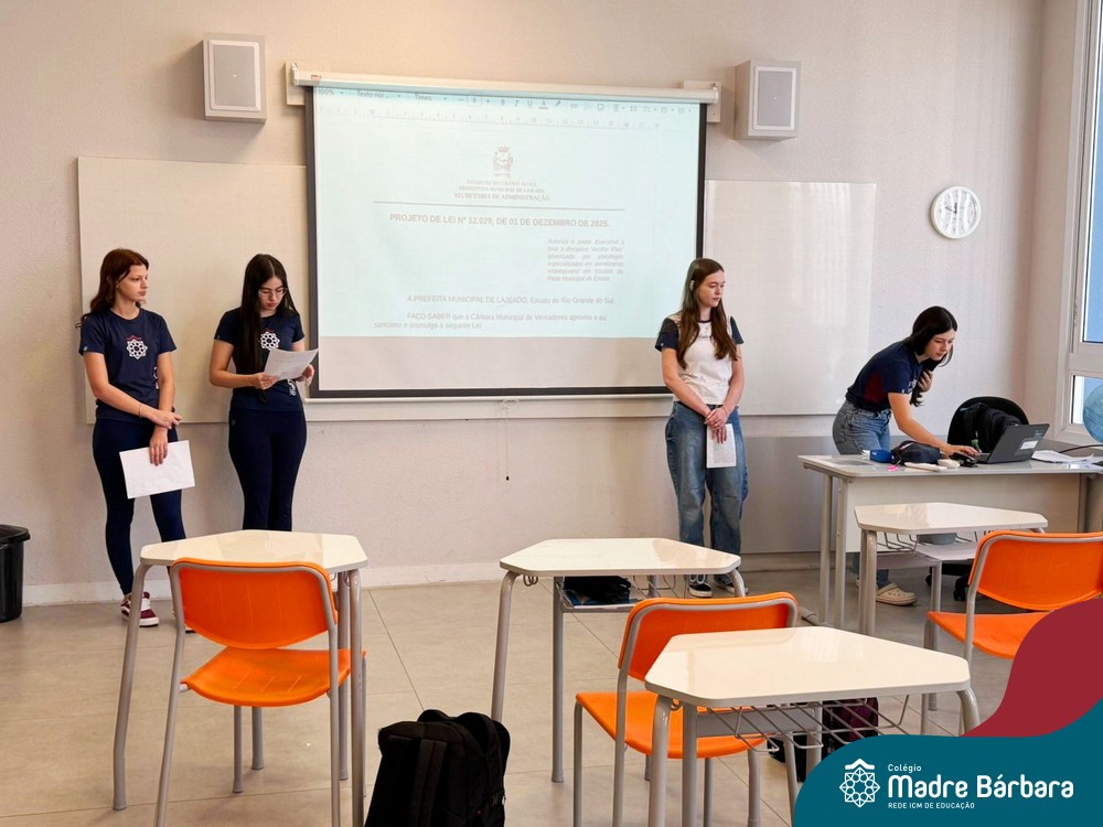 Na manhã de segunda-feira (01.12), ocorreu o encerramento do Itinerário de Modelos de Governança e Política realizado com as turmas de 1º ano do Ensino Médio do Colégio Madre Bárbara. Como etapa final da atividade, os estudantes apresentaram seus projetos de lei, elaborados a partir de propostas do Poder Executivo e destinados ao encaminhamento ao Poder Legislativo.