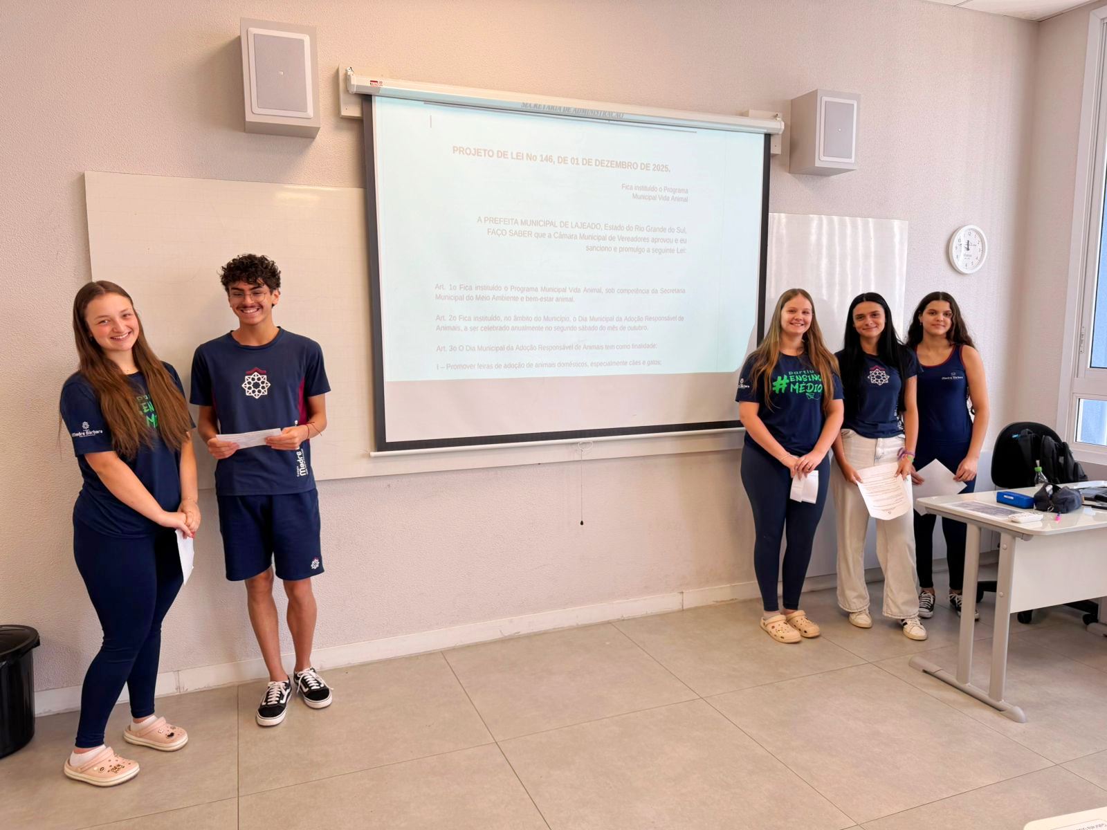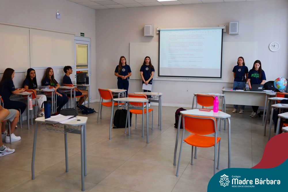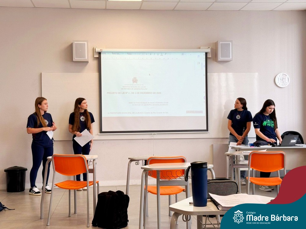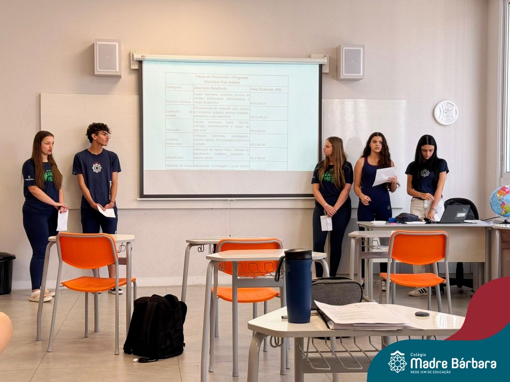 Na manhã de segunda-feira (01.12), ocorreu o encerramento do Itinerário de Modelos de Governança e Política realizado com as turmas de 1º ano do Ensino Médio do Colégio Madre Bárbara. Como etapa final da atividade, os estudantes apresentaram seus projetos de lei, elaborados a partir de propostas do Poder Executivo e destinados ao encaminhamento ao Poder Legislativo.