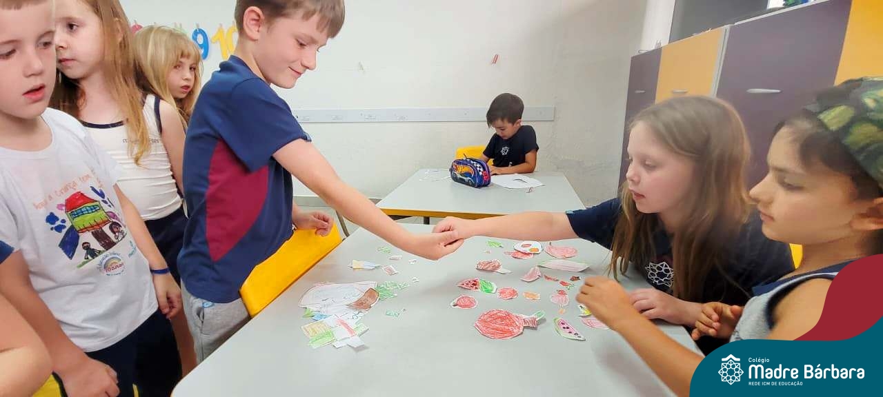 Na aula de inglês, foi proposta uma vivência lúdica para as turmas dos níveis 4 e 5 do turno da manhã, unindo linguagem, criatividade e brincadeira. As crianças desenharam, pintaram e recortaram frutas, além de confeccionar um “dinheirinho”, que serviu como base para a atividade principal: a brincadeira de feira.