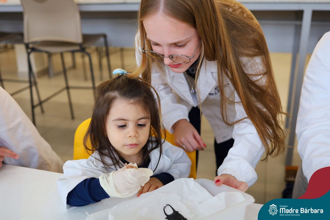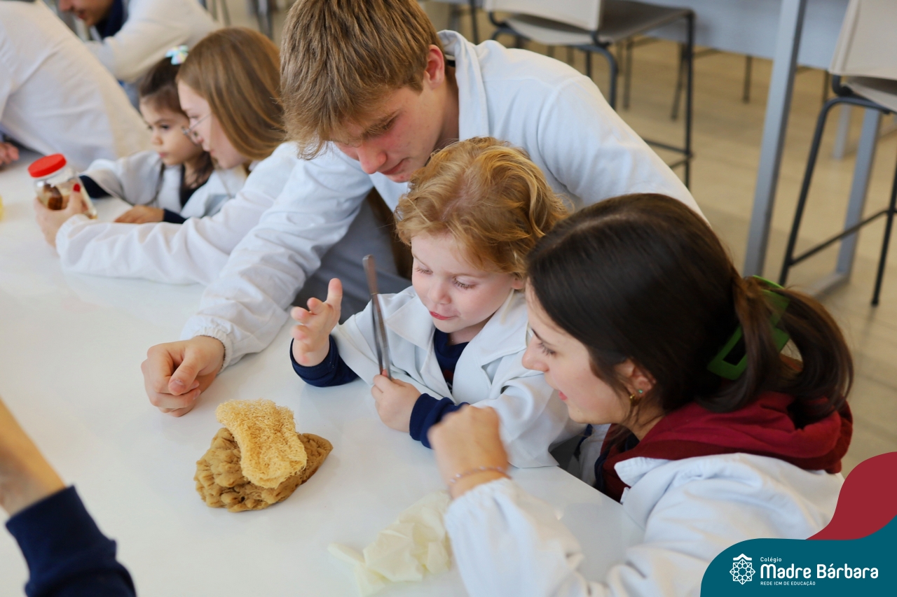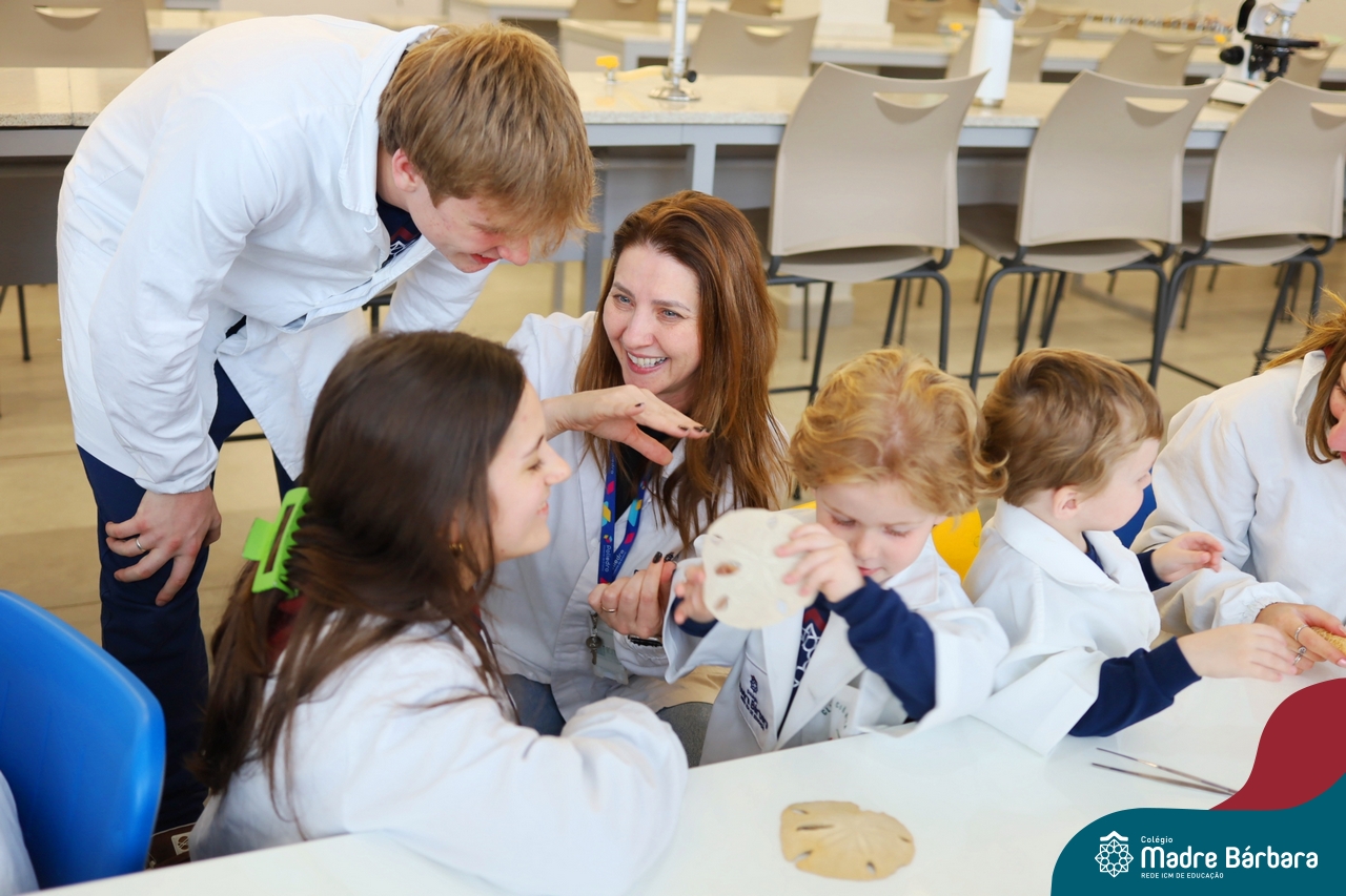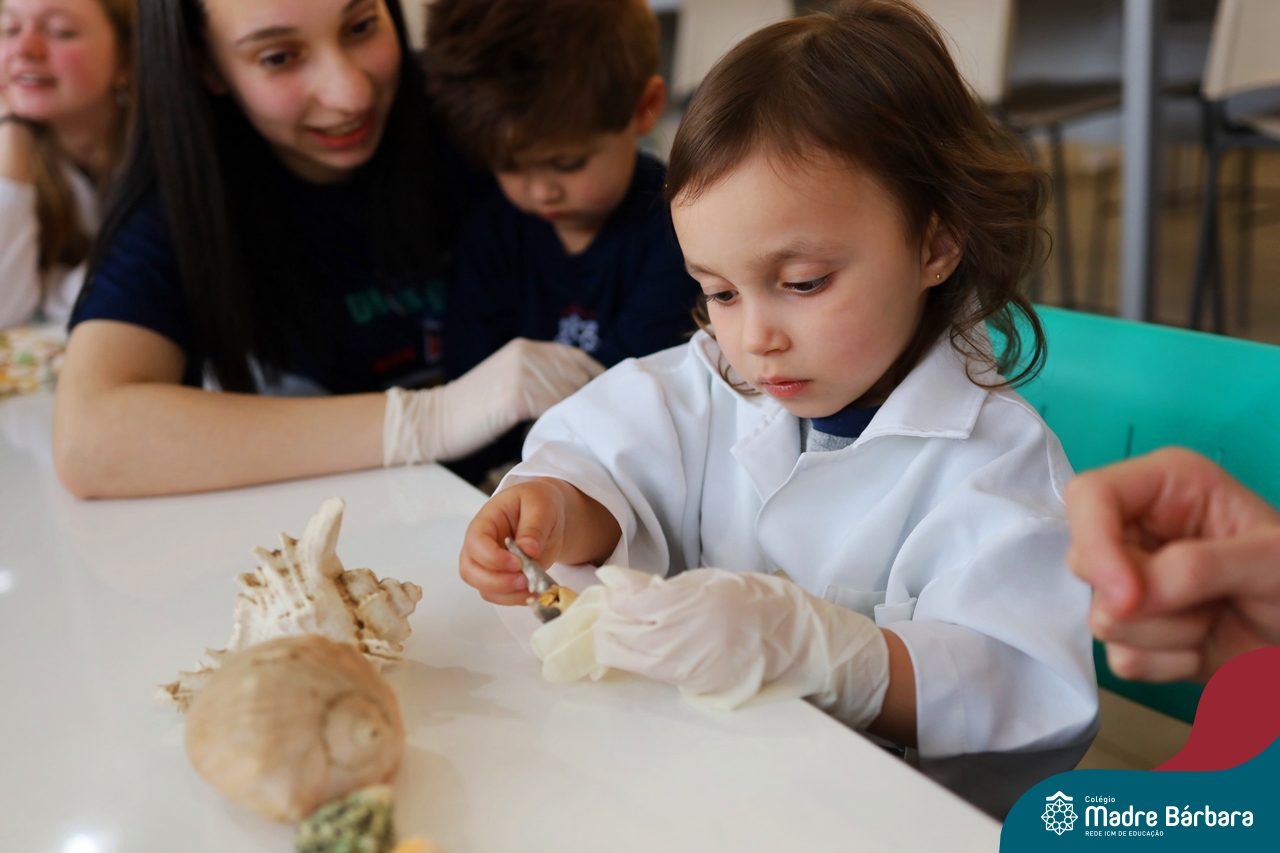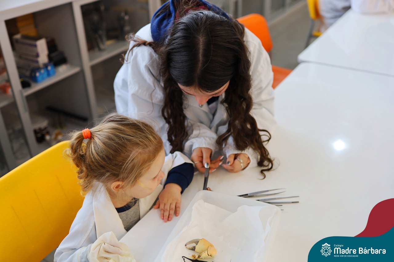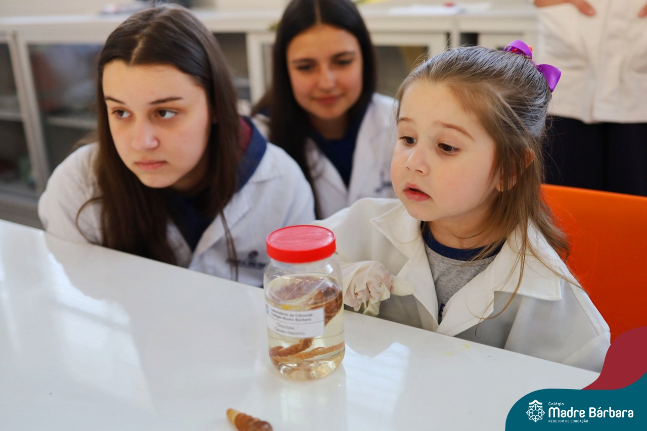 Na tarde do dia 08 de outubro, as crianças do nível 2B puderam ser cientistas no Laboratório de Ciências. Junto com os estudantes do 2°ano do Ensino Médio, vivenciaram um momento de troca de conhecimento sobre a vida marinha. Foi uma tarde de muito encantamento e descobertas sobre o fundo do mar!
