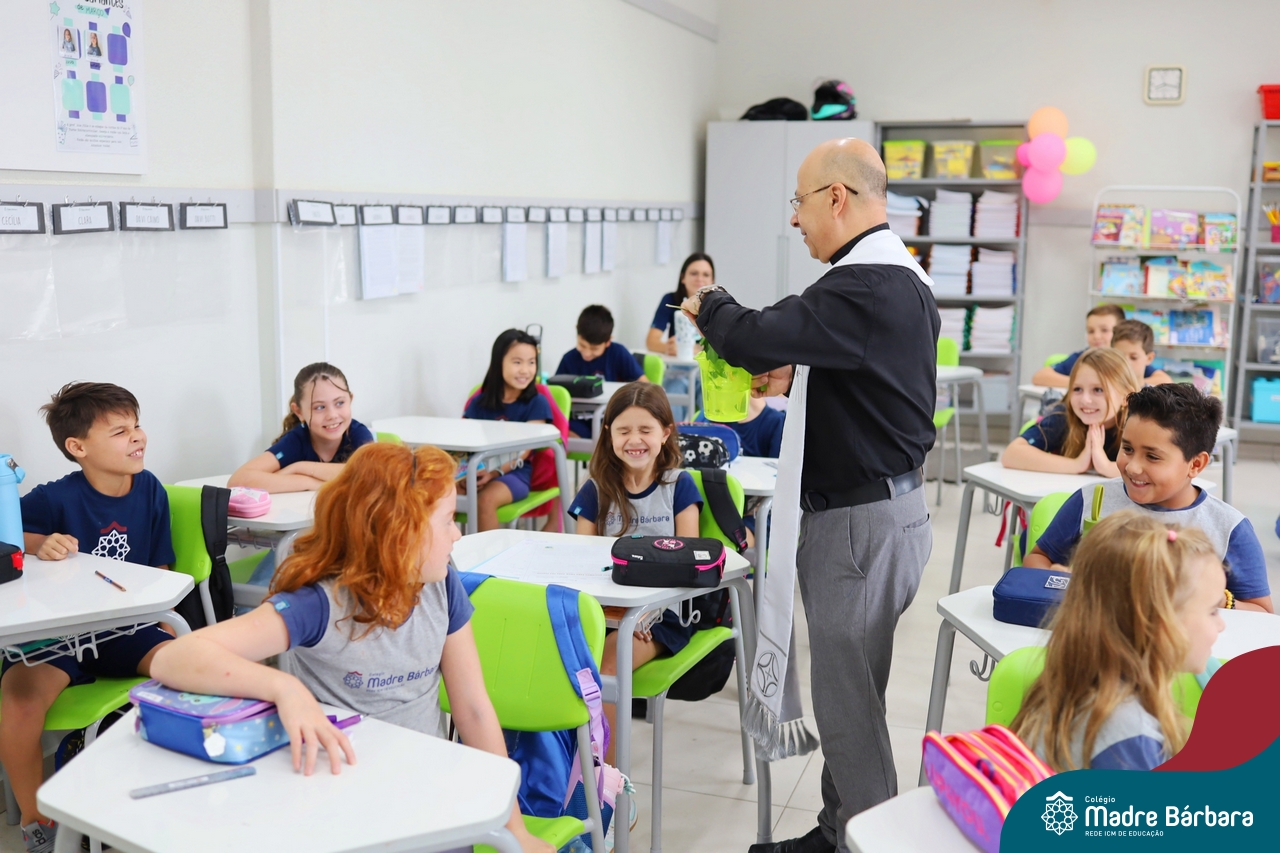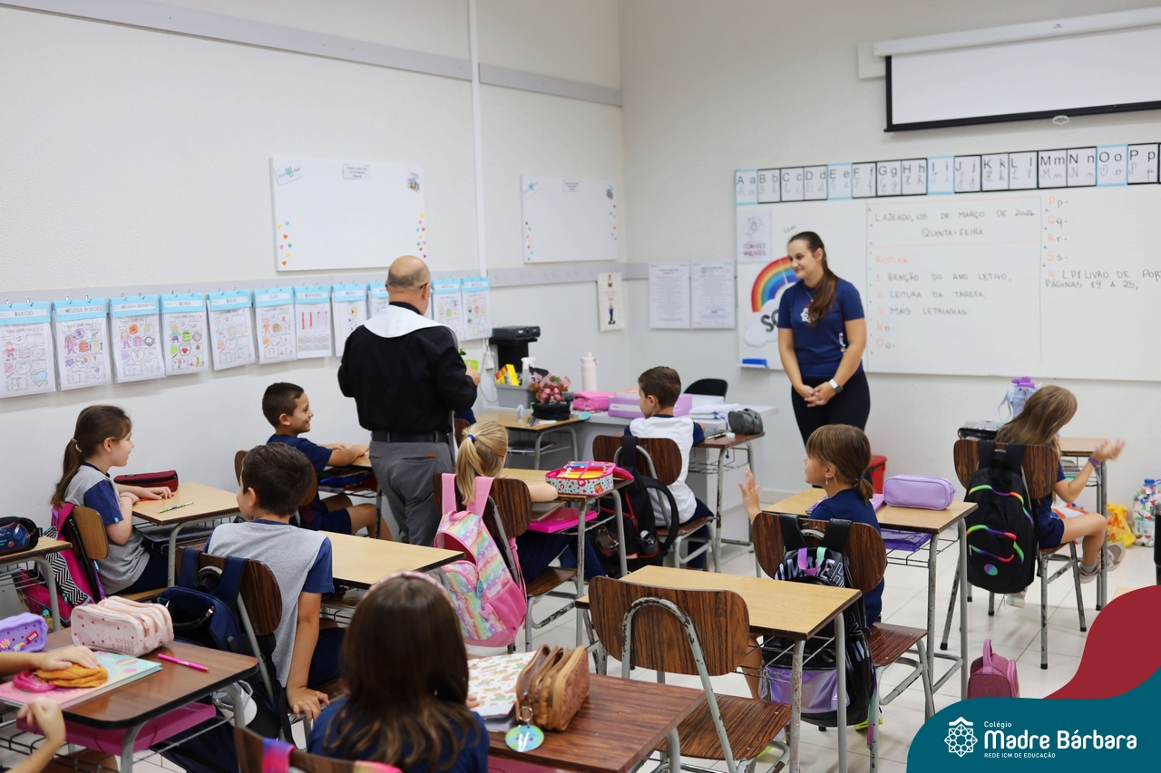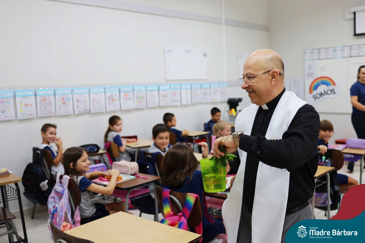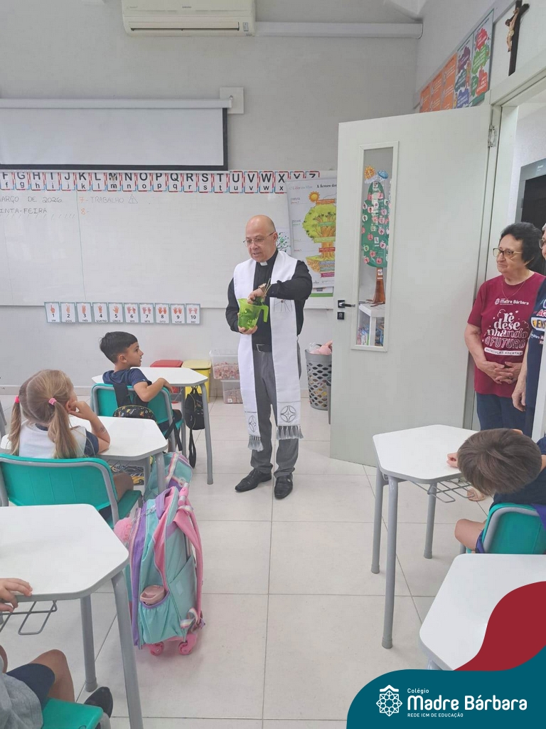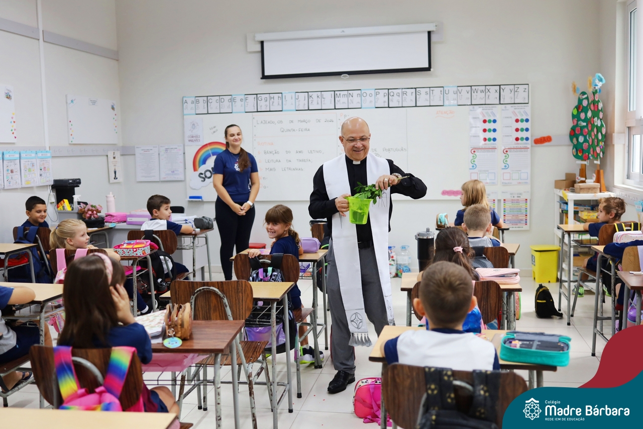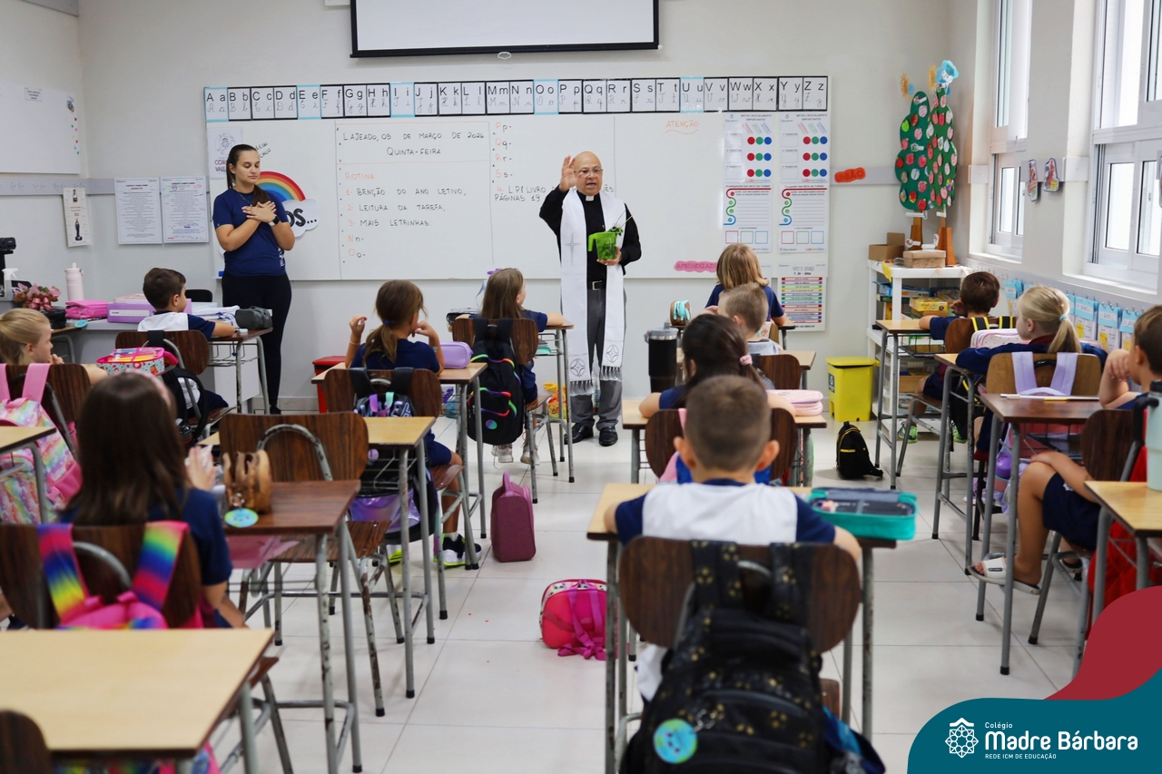 Na manhã desta quinta-feira, 5 de março, o Colégio Madre Bárbara – Rede ICM, realizou um momento especial de fé e acolhida para marcar o início do ano letivo. A tradicional Bênção do Ano Letivo foi conduzida pelos padres Antônio Puhl, Rogério Kunrath e Gesildo Torres Monteiro. Durante a visita, os sacerdotes percorreram todas as salas de aula, contemplando estudantes de todos os níveis de ensino, além de passarem pelos diversos setores do Colégio. Em cada espaço, realizaram orações, palavras de bênção e a água benta, desejando um ano letivo repleto de aprendizado, convivência e crescimento humano e espiritual.