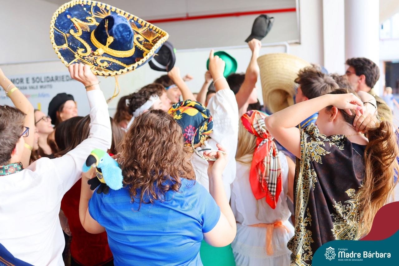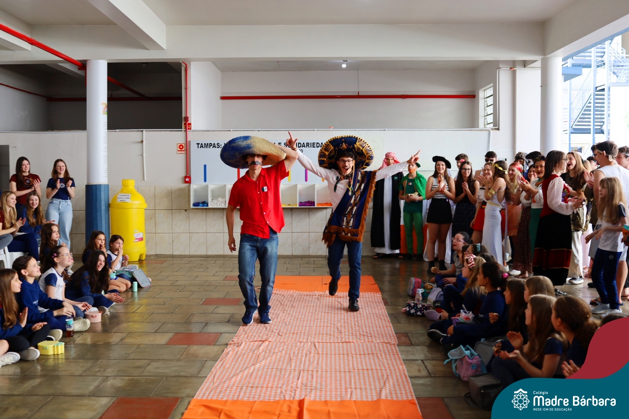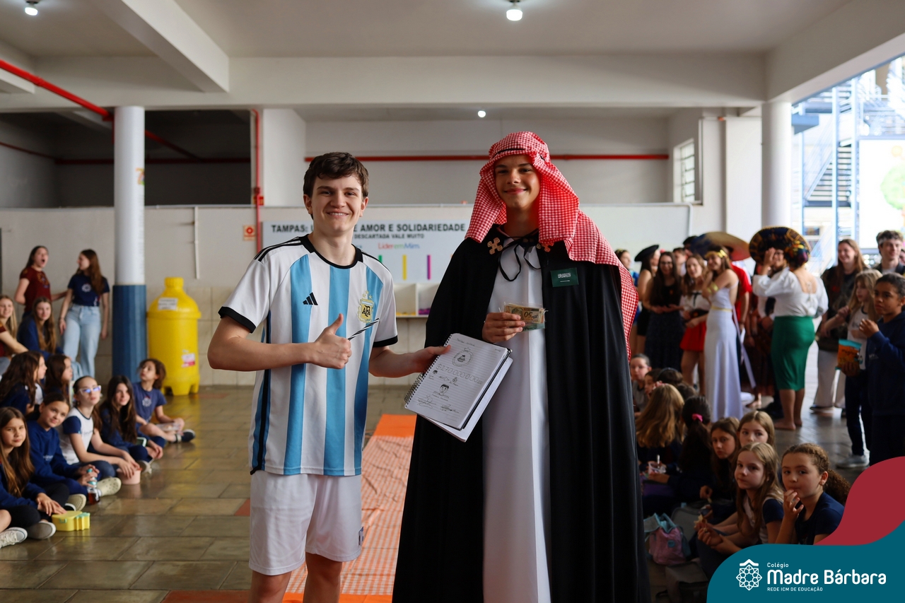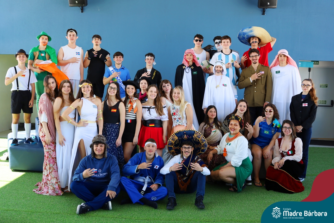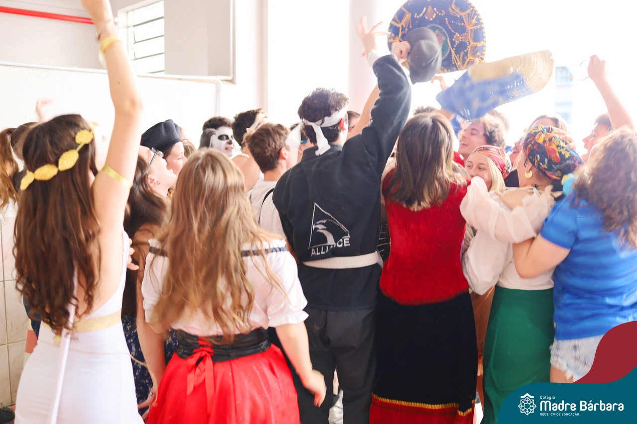 O Grêmio Estudantil do Colégio Madre Bárbara (Gembar) organizou o último trote do ano, superdivertido e cheio de criatividade com os estudantes do Terceirão. O tema foi “Países e Culturas”, e cada estudante caprichou nas vestimentas, representando diferentes partes do mundo com muito respeito e originalidade. Durante o evento, os alunos fizeram um lanche coletivo, posaram para fotos na área verde e animaram o recreio com um desfile cultural na área coberta. O momento foi marcado por integração, alegria e descontração, celebrando o espírito de união e encerrando mais uma etapa importante da caminhada escolar.