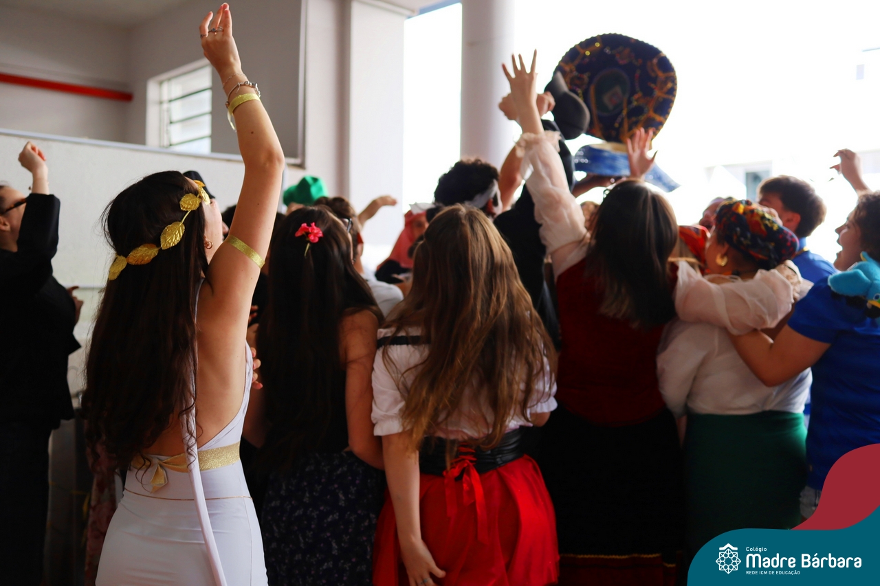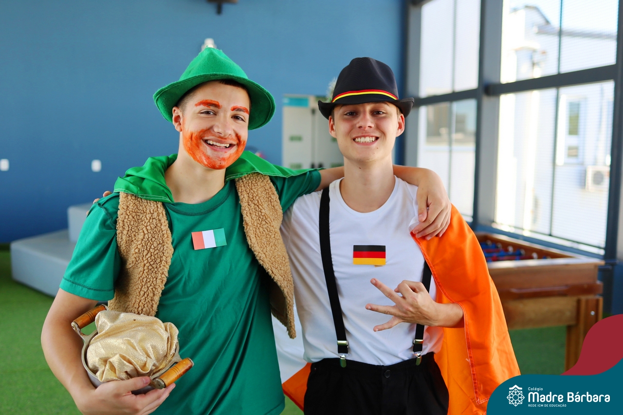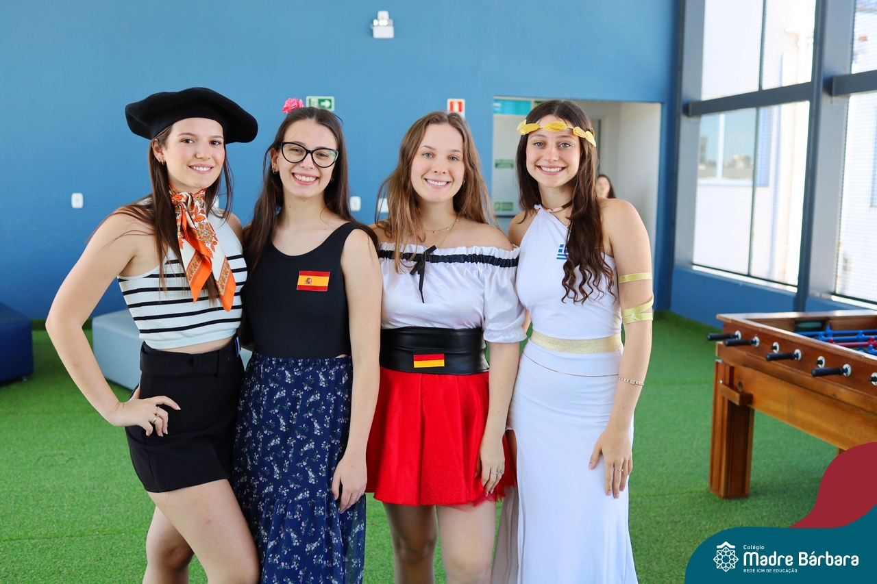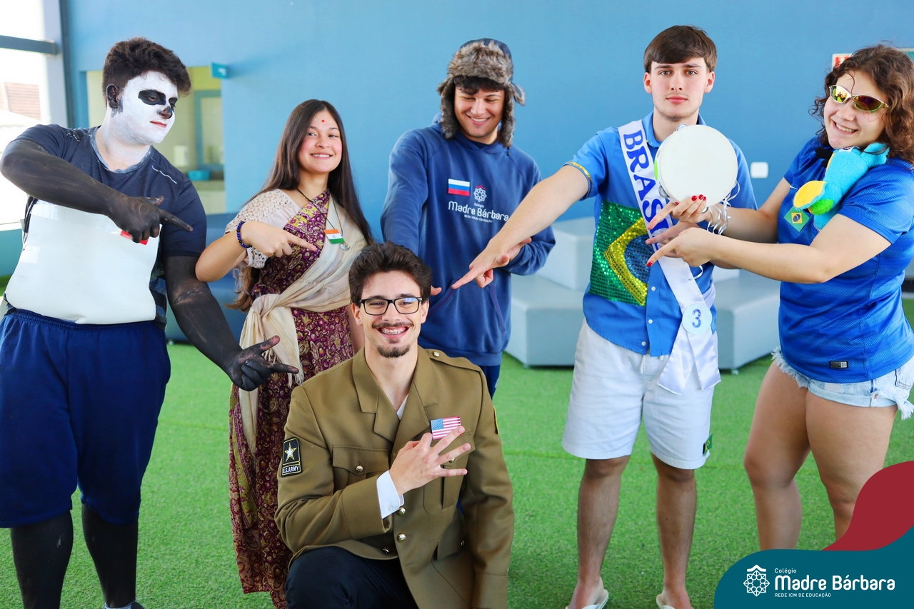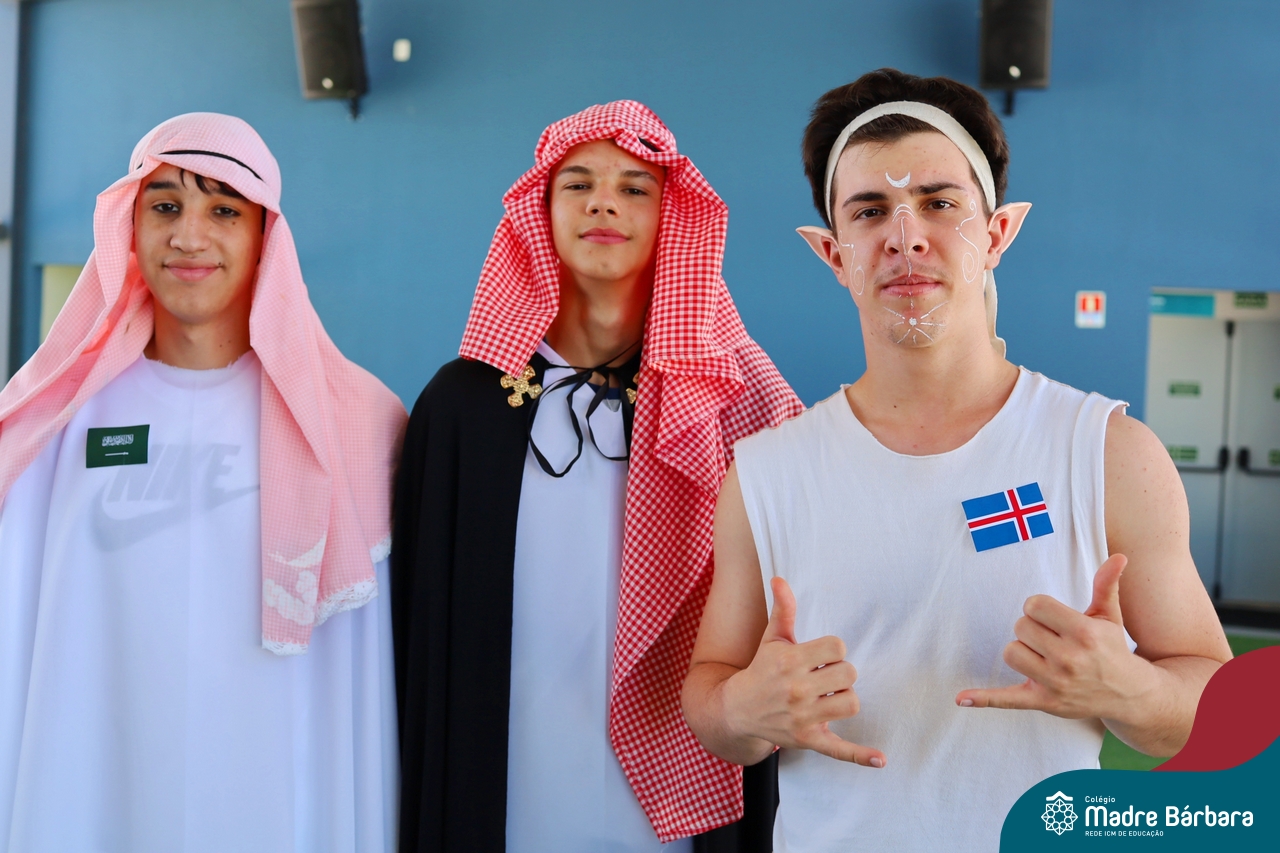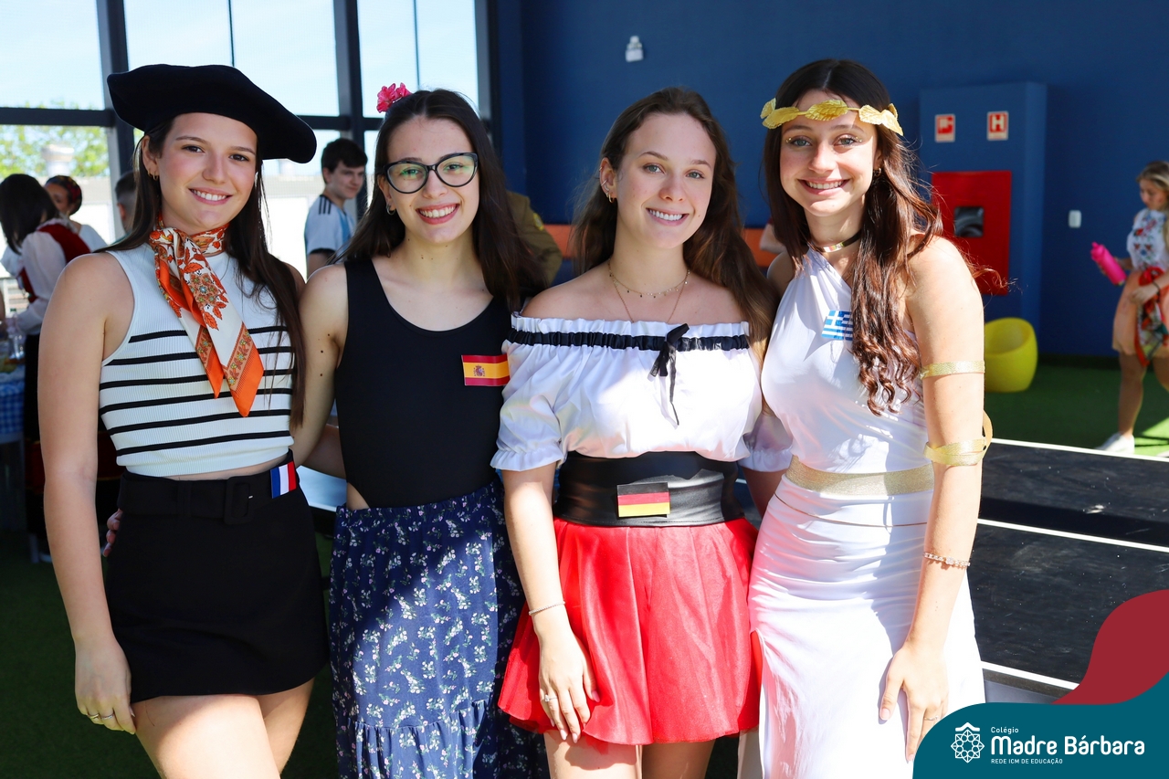 O Grêmio Estudantil do Colégio Madre Bárbara (Gembar) organizou o último trote do ano, superdivertido e cheio de criatividade com os estudantes do Terceirão. O tema foi “Países e Culturas”, e cada estudante caprichou nas vestimentas, representando diferentes partes do mundo com muito respeito e originalidade. Durante o evento, os alunos fizeram um lanche coletivo, posaram para fotos na área verde e animaram o recreio com um desfile cultural na área coberta. O momento foi marcado por integração, alegria e descontração, celebrando o espírito de união e encerrando mais uma etapa importante da caminhada escolar.