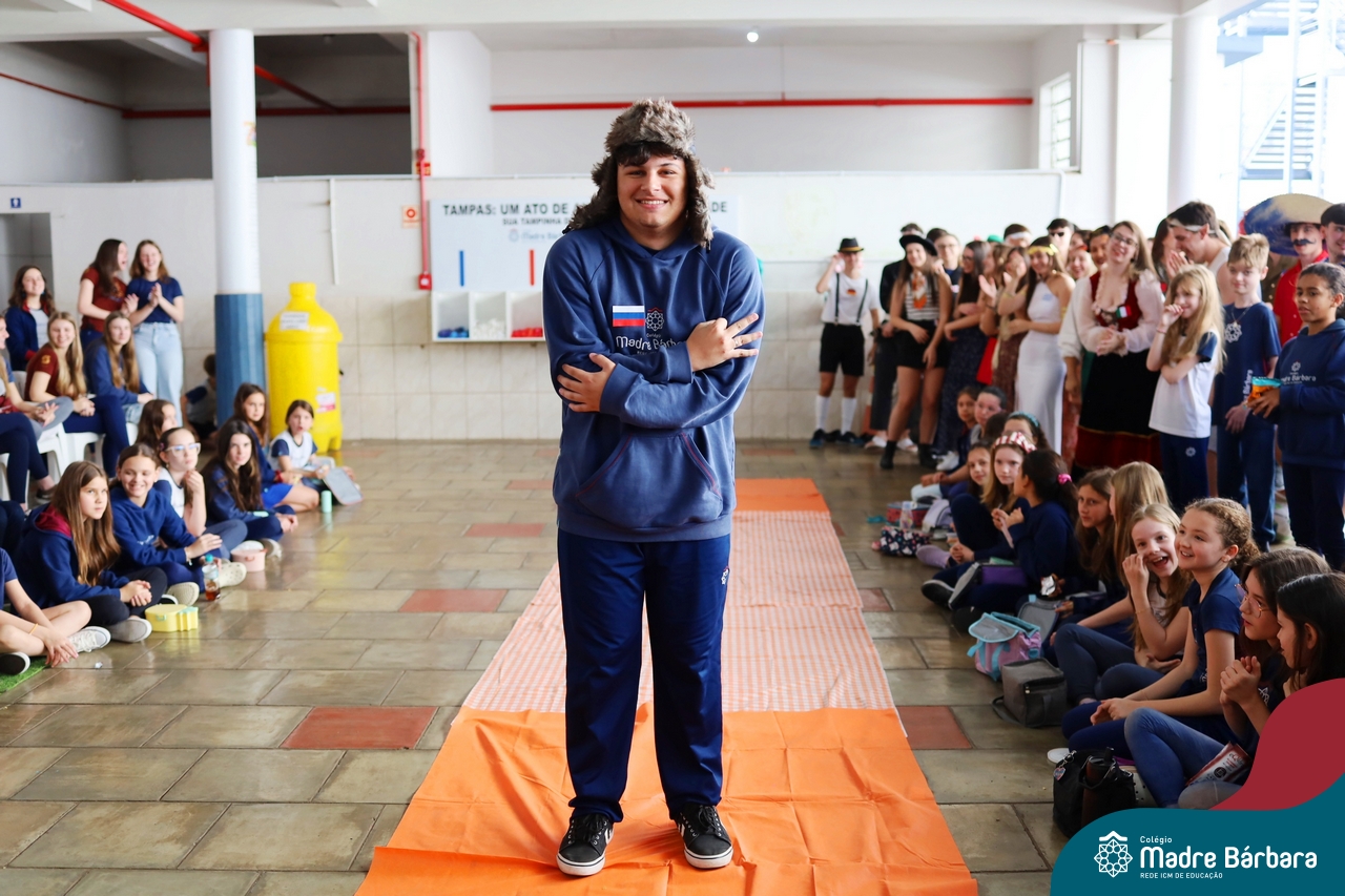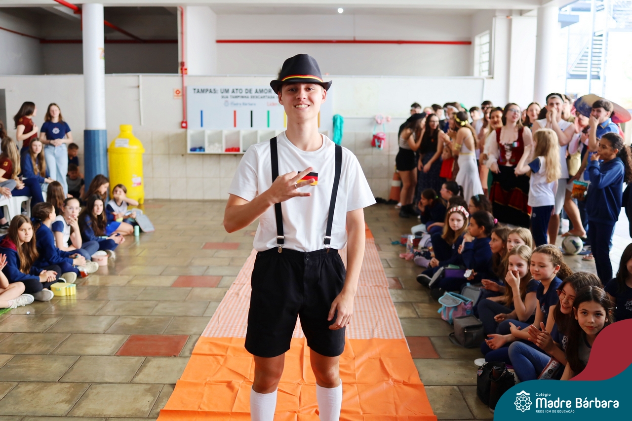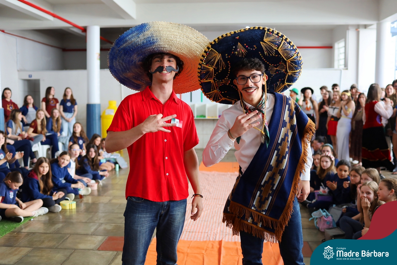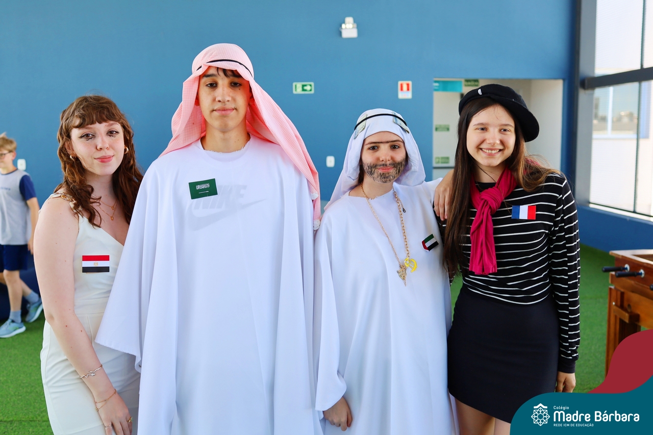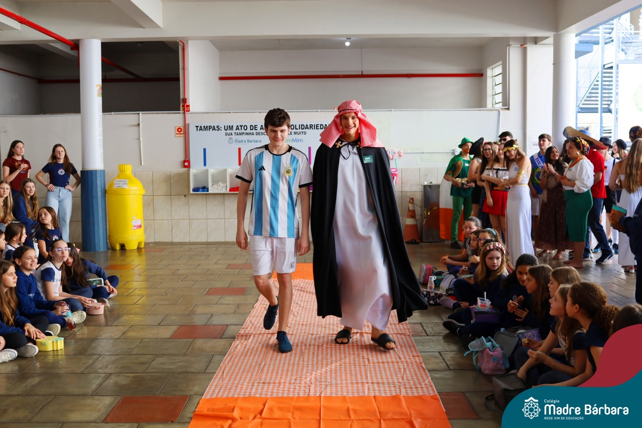 O Grêmio Estudantil do Colégio Madre Bárbara (Gembar) organizou o último trote do ano, superdivertido e cheio de criatividade com os estudantes do Terceirão. O tema foi “Países e Culturas”, e cada estudante caprichou nas vestimentas, representando diferentes partes do mundo com muito respeito e originalidade. Durante o evento, os alunos fizeram um lanche coletivo, posaram para fotos na área verde e animaram o recreio com um desfile cultural na área coberta. O momento foi marcado por integração, alegria e descontração, celebrando o espírito de união e encerrando mais uma etapa importante da caminhada escolar.