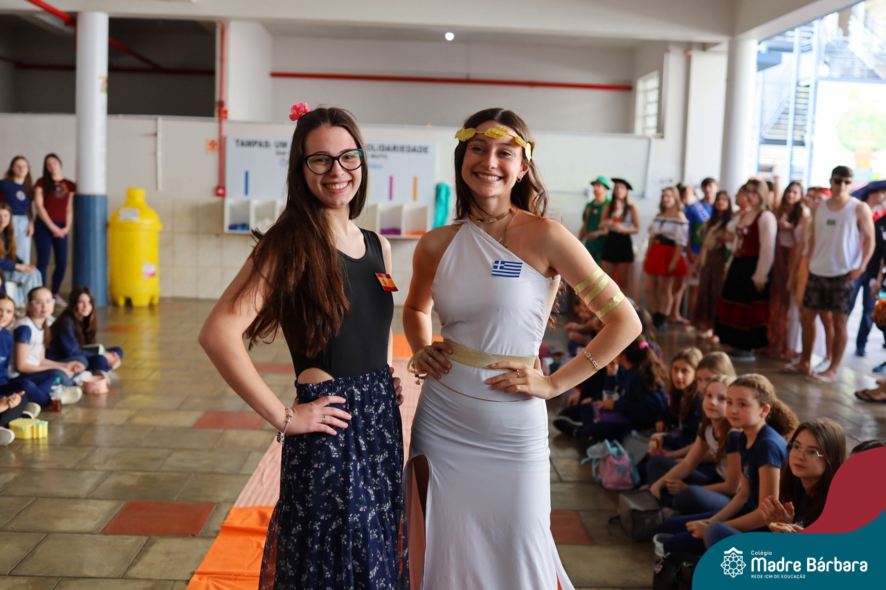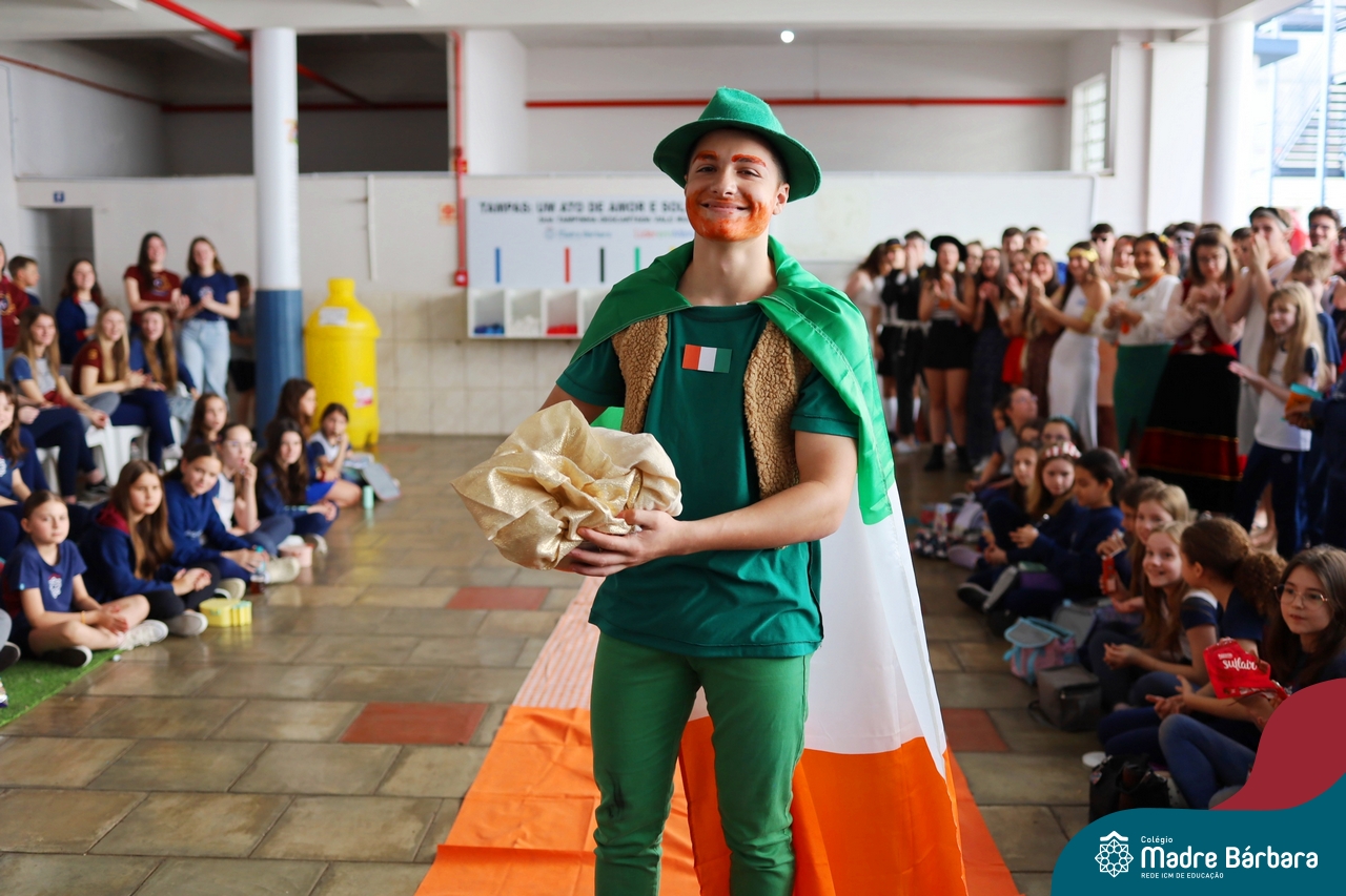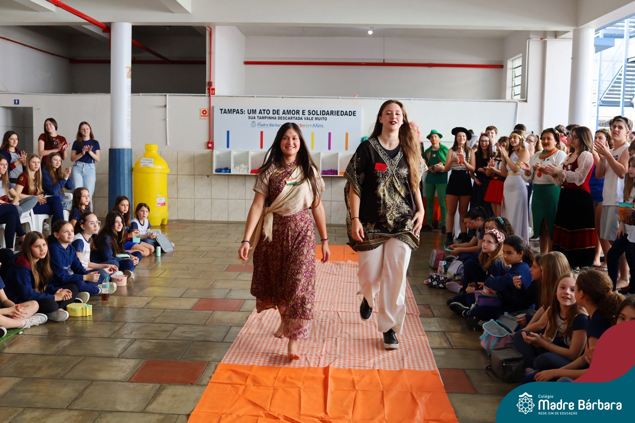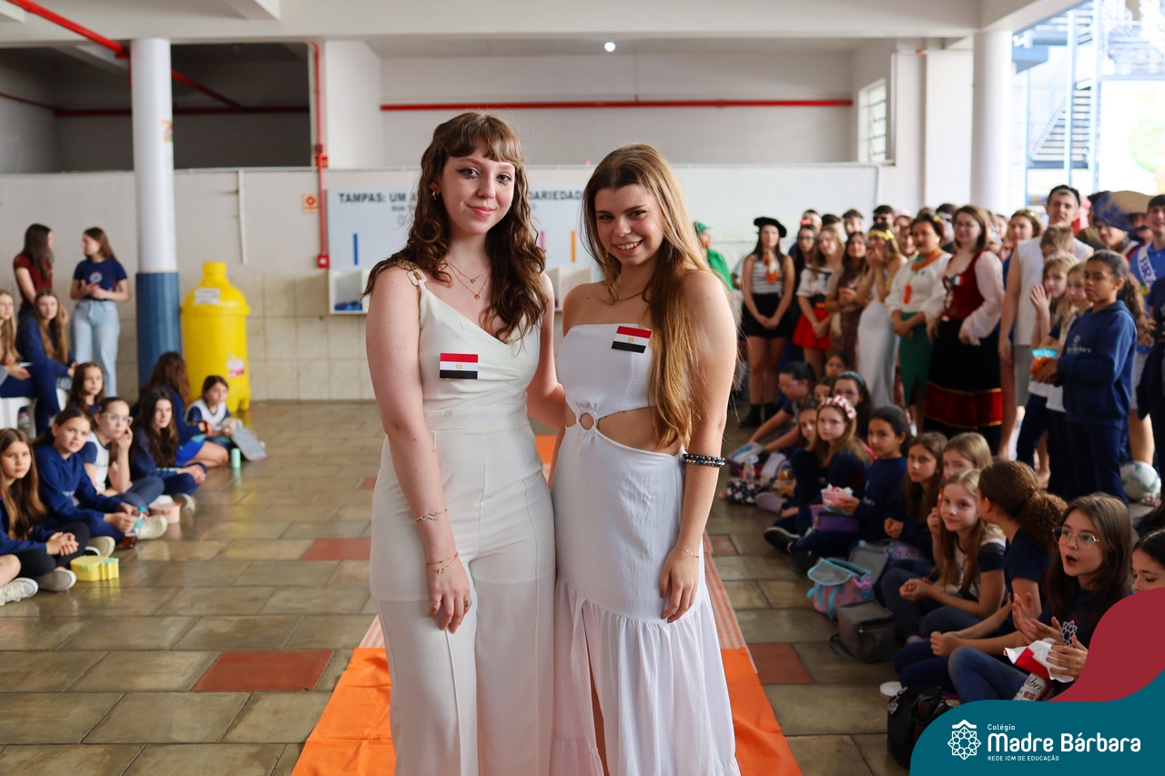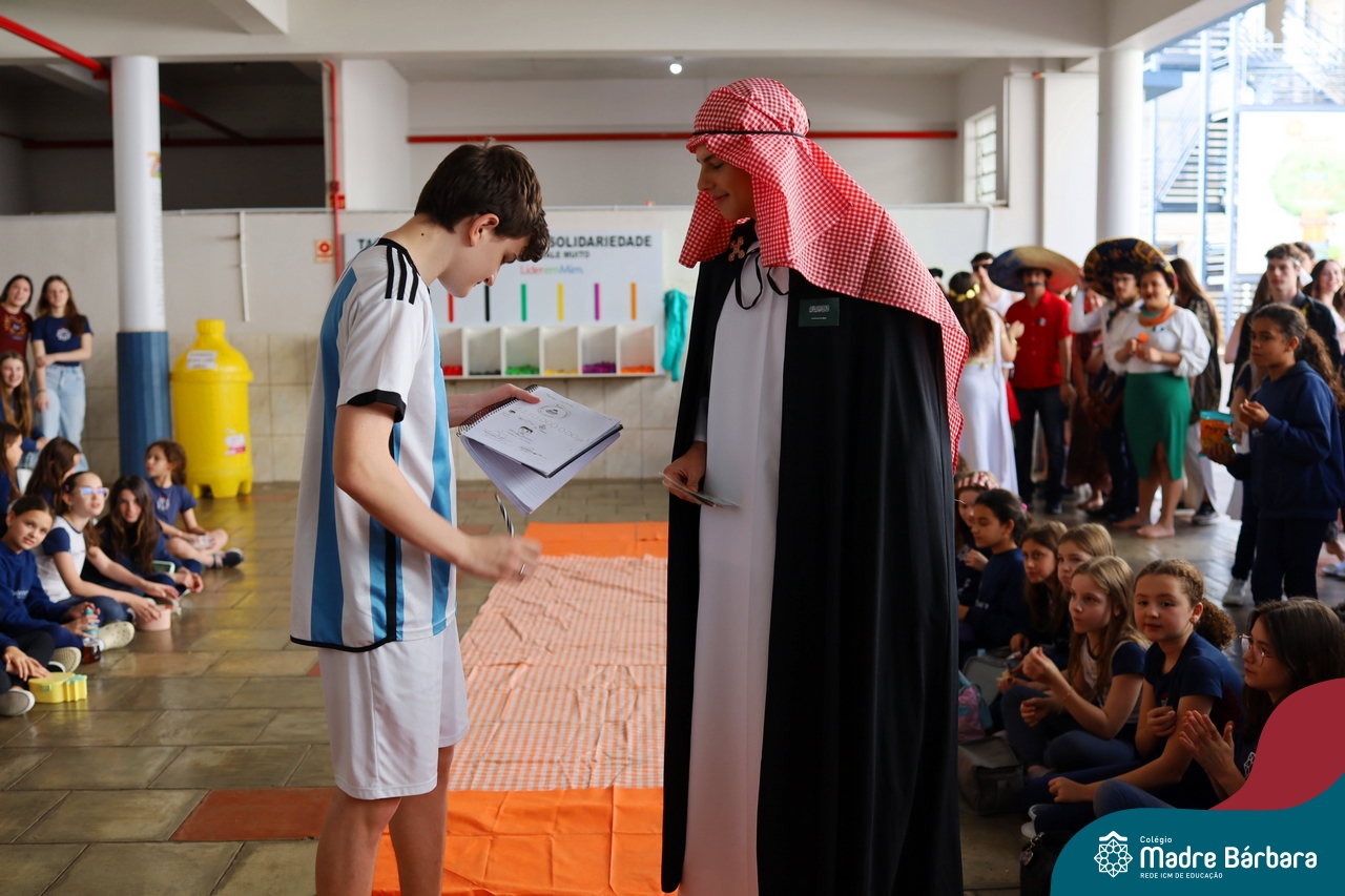 O Grêmio Estudantil do Colégio Madre Bárbara (Gembar) organizou o último trote do ano, superdivertido e cheio de criatividade com os estudantes do Terceirão. O tema foi “Países e Culturas”, e cada estudante caprichou nas vestimentas, representando diferentes partes do mundo com muito respeito e originalidade. Durante o evento, os alunos fizeram um lanche coletivo, posaram para fotos na área verde e animaram o recreio com um desfile cultural na área coberta. O momento foi marcado por integração, alegria e descontração, celebrando o espírito de união e encerrando mais uma etapa importante da caminhada escolar.