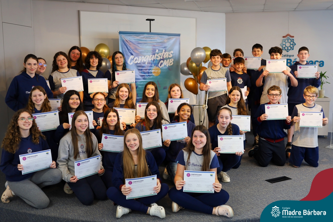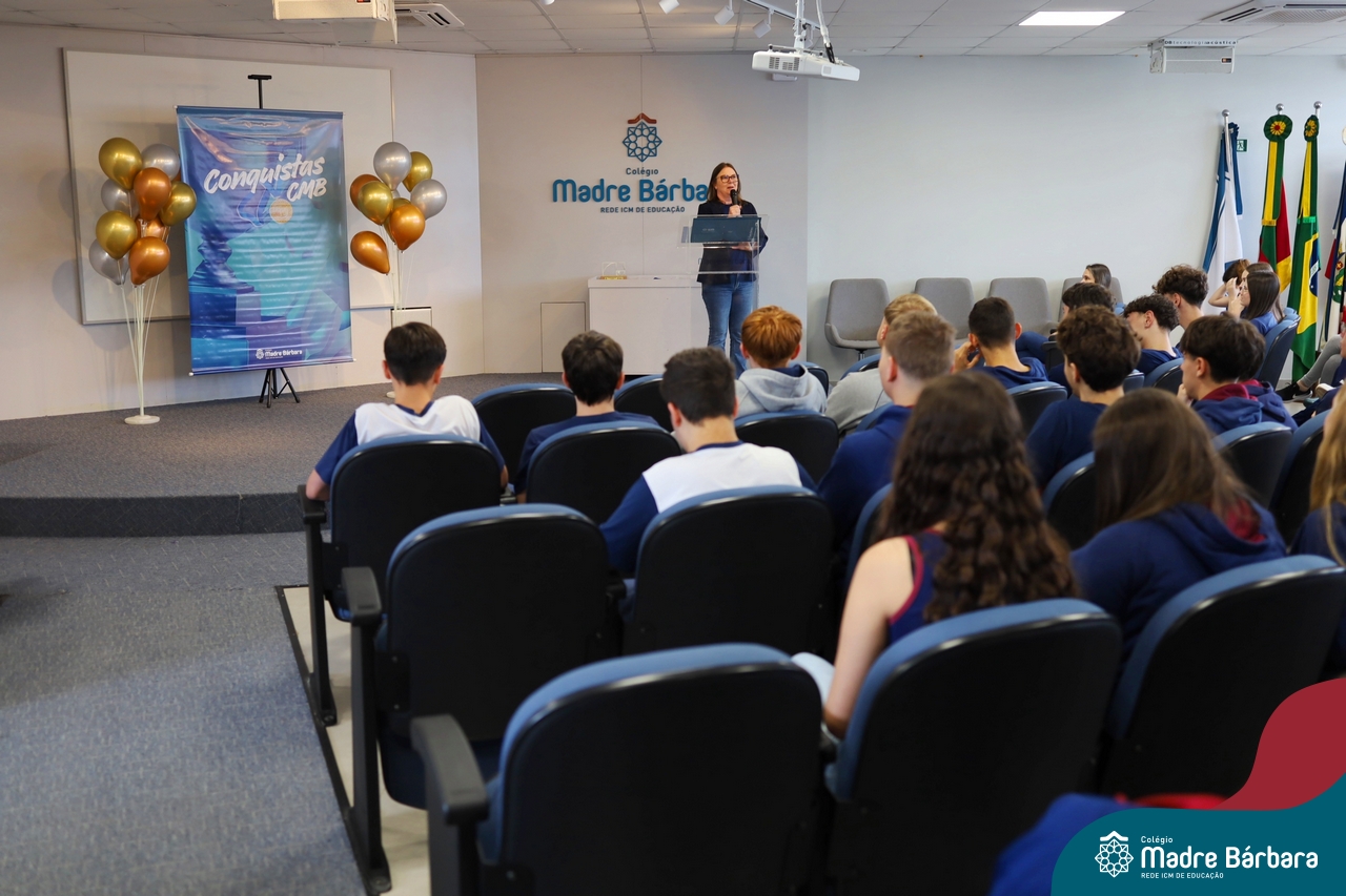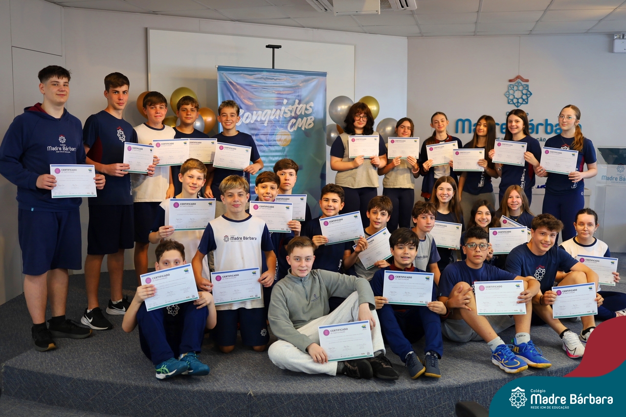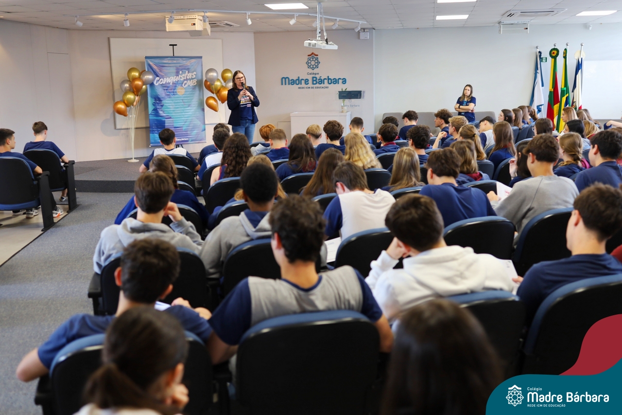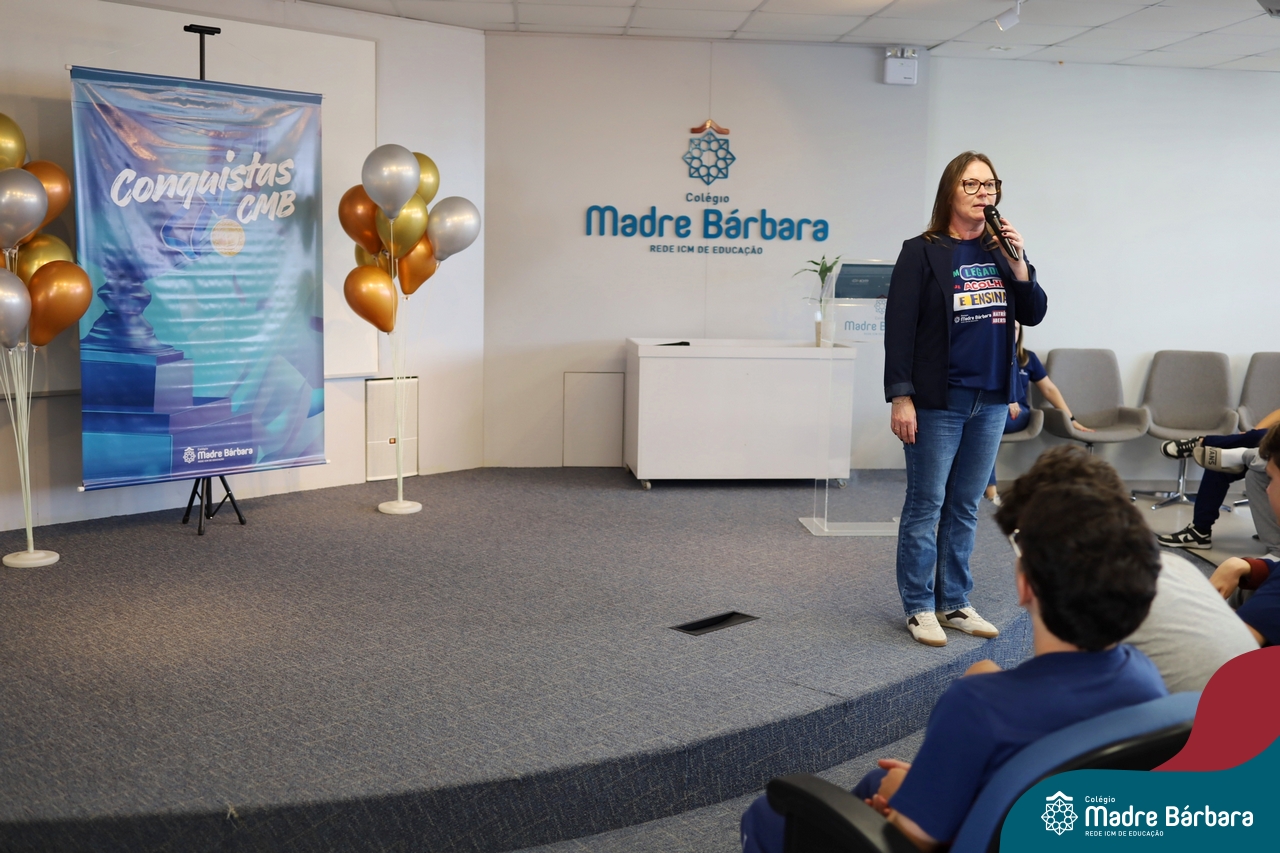 Os estudantes e professores do Ensino Fundamental – Anos Finais e do Ensino Médio do Colégio Madre Bárbara – Rede ICM se reuniram na manhã desta sexta-feira (18.11) para celebrar uma série de conquistas marcantes alcançadas pelos estudantes ao longo do ano letivo de 2025. A participação em diversas olimpíadas científicas, concursos e projetos externos reforçou o compromisso do Colégio com a construção de uma cultura olímpica e com o incentivo ao desenvolvimento acadêmico, pessoal e profissional dos alunos. Segundo a equipe pedagógica, experiências como essas ampliam o raciocínio lógico, estimulam a criatividade, fortalecem a autonomia e revelam novos interesses e vocações, resultados que ultrapassam o currículo tradicional e impactam profundamente a formação dos jovens.