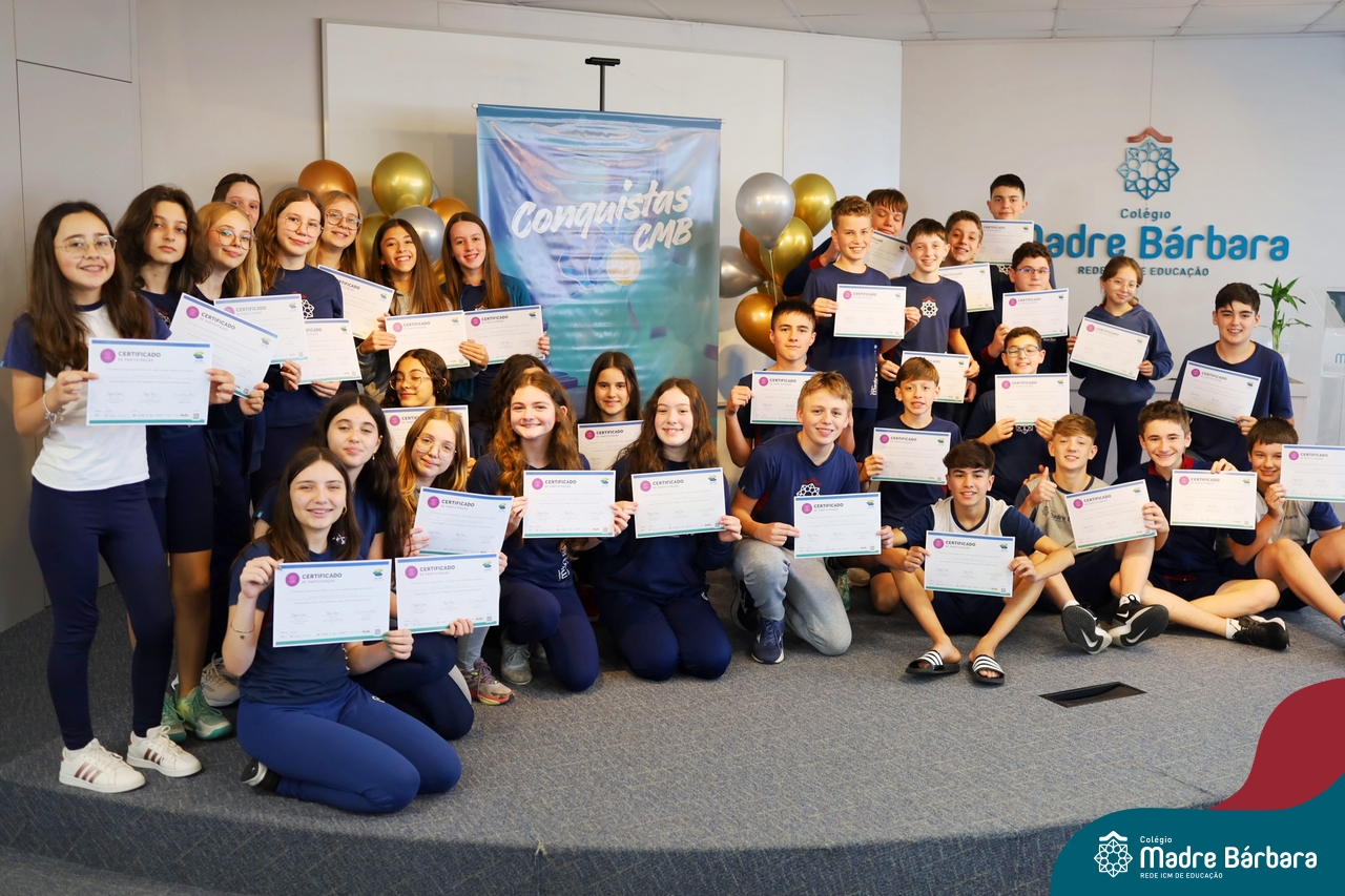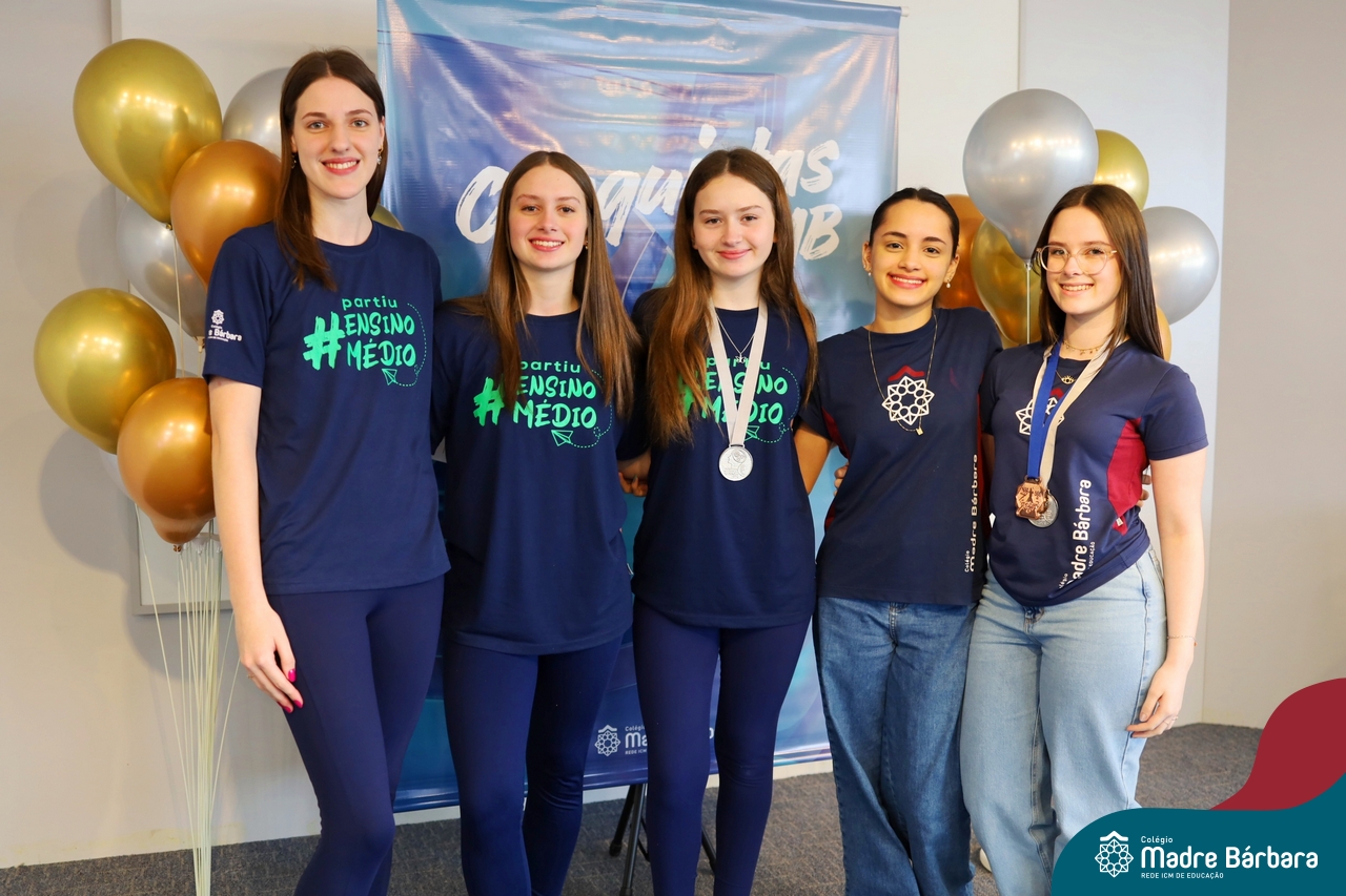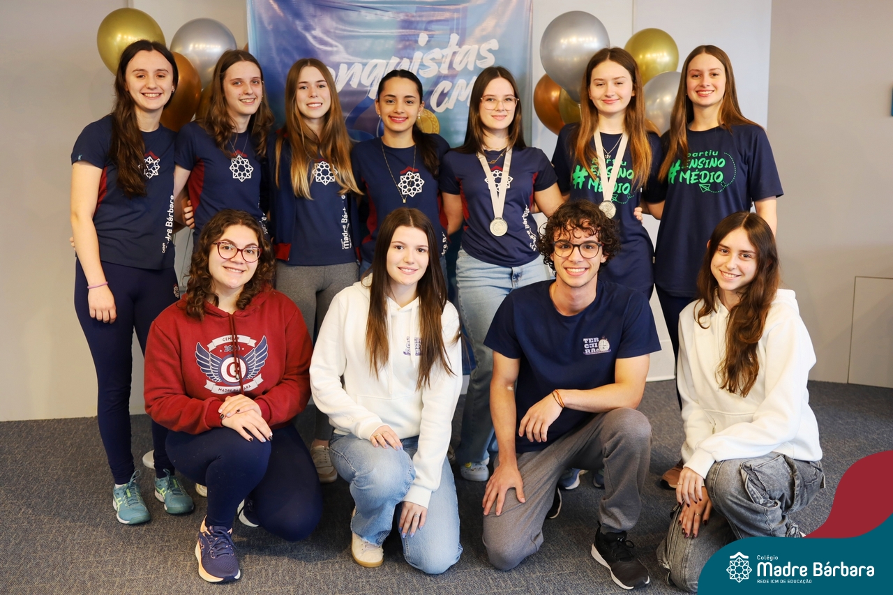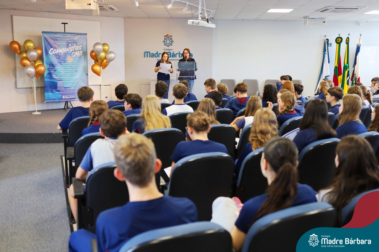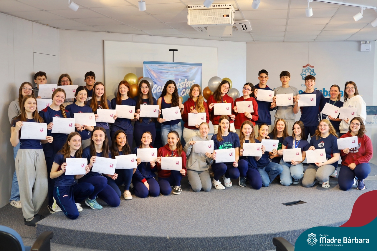 Os estudantes e professores do Ensino Fundamental – Anos Finais e do Ensino Médio do Colégio Madre Bárbara – Rede ICM se reuniram na manhã desta sexta-feira (18.11) para celebrar uma série de conquistas marcantes alcançadas pelos estudantes ao longo do ano letivo de 2025. A participação em diversas olimpíadas científicas, concursos e projetos externos reforçou o compromisso do Colégio com a construção de uma cultura olímpica e com o incentivo ao desenvolvimento acadêmico, pessoal e profissional dos alunos. Segundo a equipe pedagógica, experiências como essas ampliam o raciocínio lógico, estimulam a criatividade, fortalecem a autonomia e revelam novos interesses e vocações, resultados que ultrapassam o currículo tradicional e impactam profundamente a formação dos jovens.