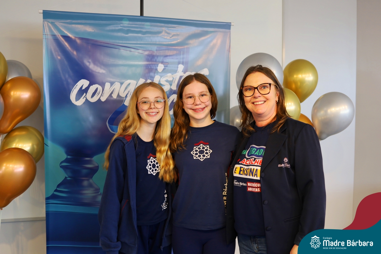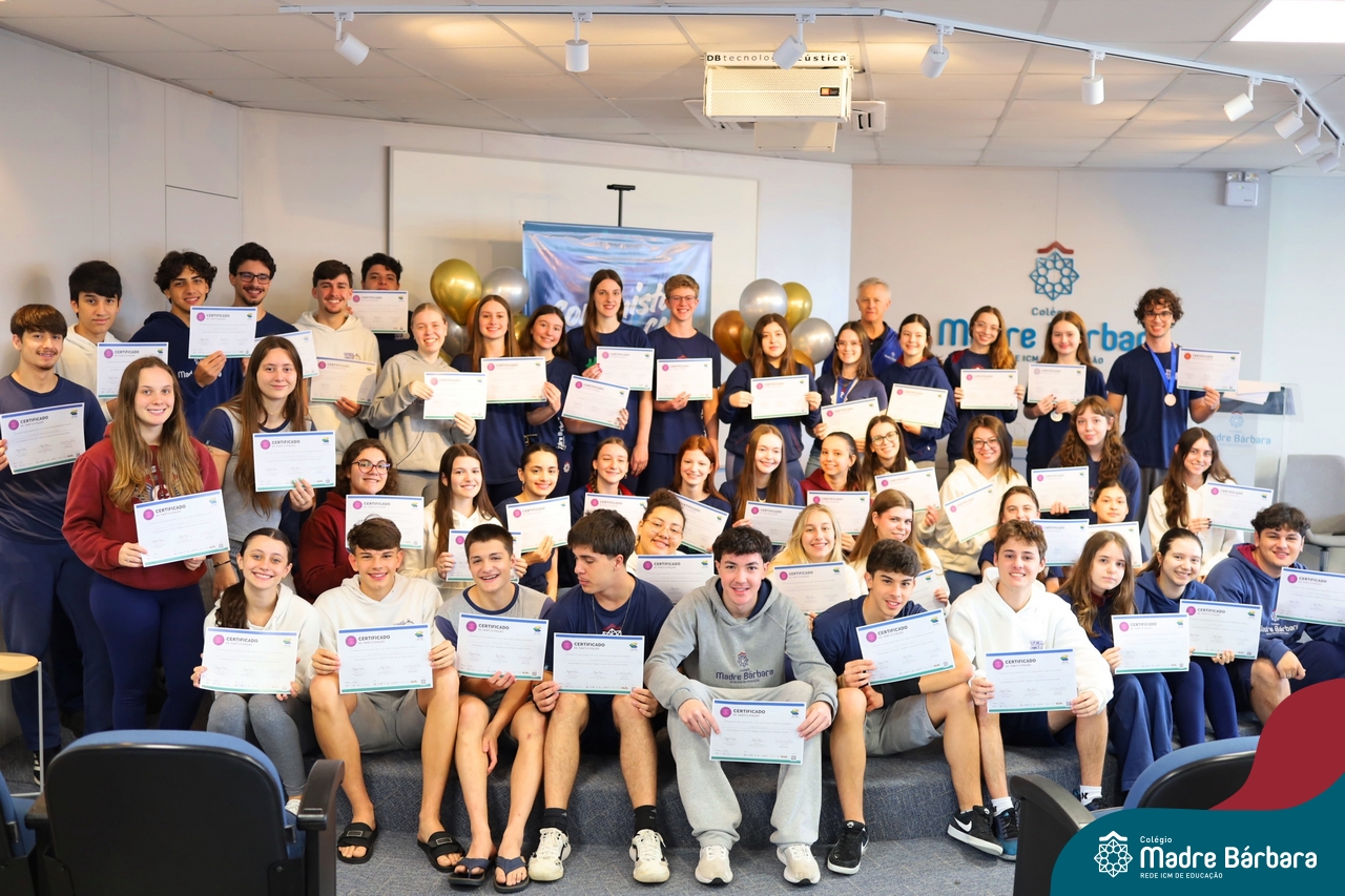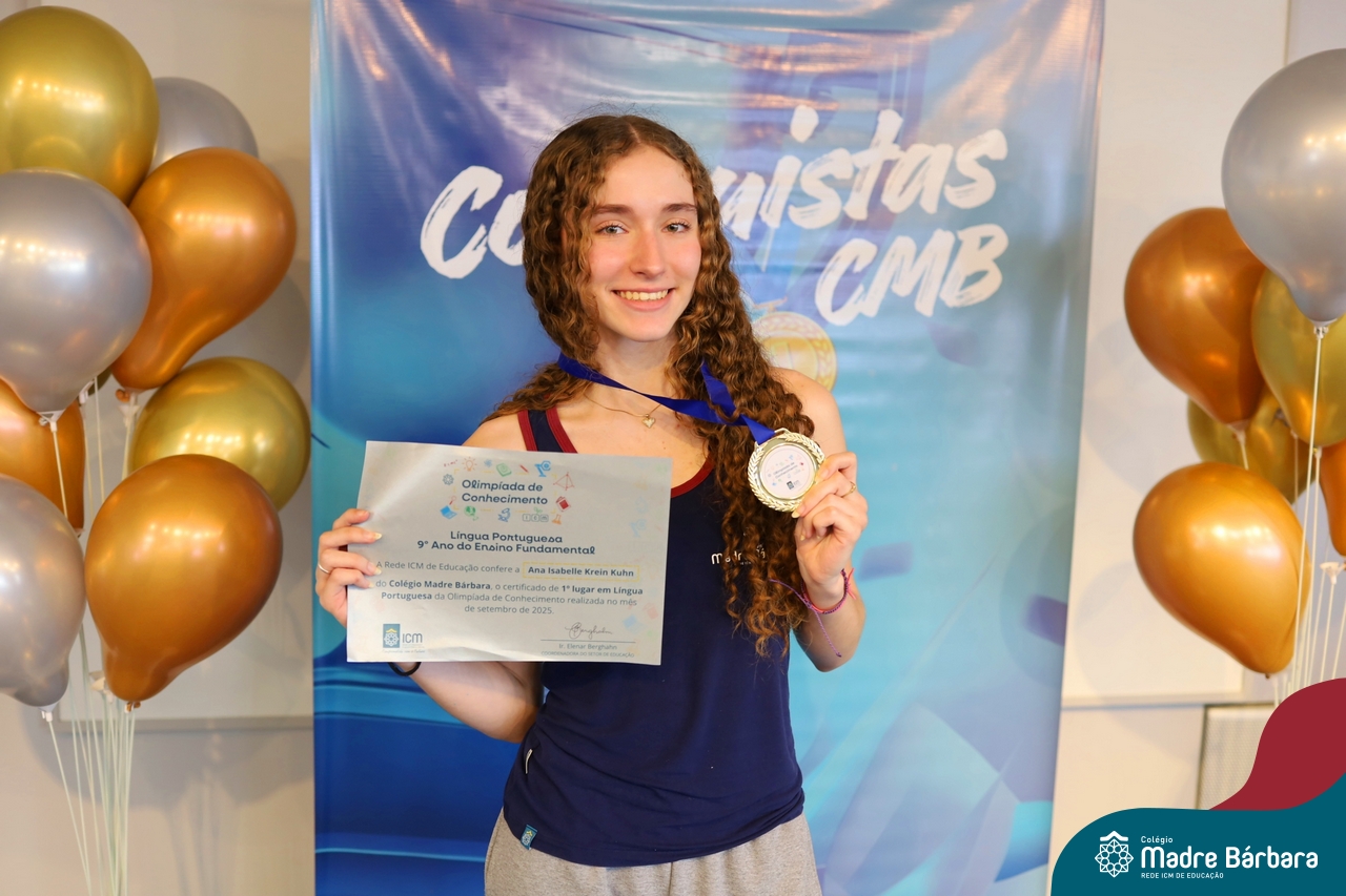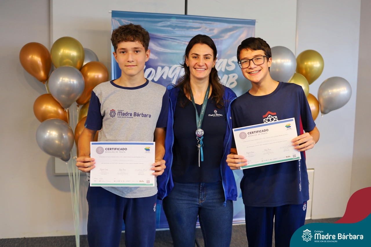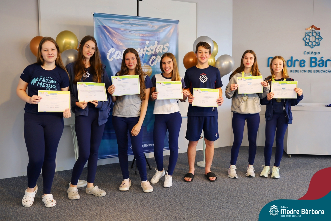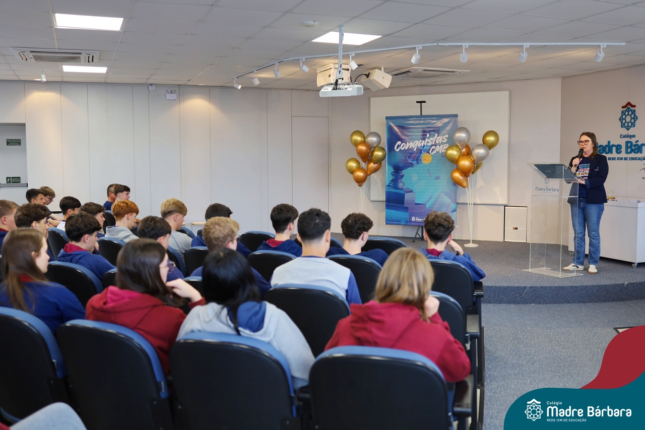 Os estudantes e professores do Ensino Fundamental – Anos Finais e do Ensino Médio do Colégio Madre Bárbara – Rede ICM se reuniram na manhã desta sexta-feira (18.11) para celebrar uma série de conquistas marcantes alcançadas pelos estudantes ao longo do ano letivo de 2025. A participação em diversas olimpíadas científicas, concursos e projetos externos reforçou o compromisso do Colégio com a construção de uma cultura olímpica e com o incentivo ao desenvolvimento acadêmico, pessoal e profissional dos alunos. Segundo a equipe pedagógica, experiências como essas ampliam o raciocínio lógico, estimulam a criatividade, fortalecem a autonomia e revelam novos interesses e vocações, resultados que ultrapassam o currículo tradicional e impactam profundamente a formação dos jovens.