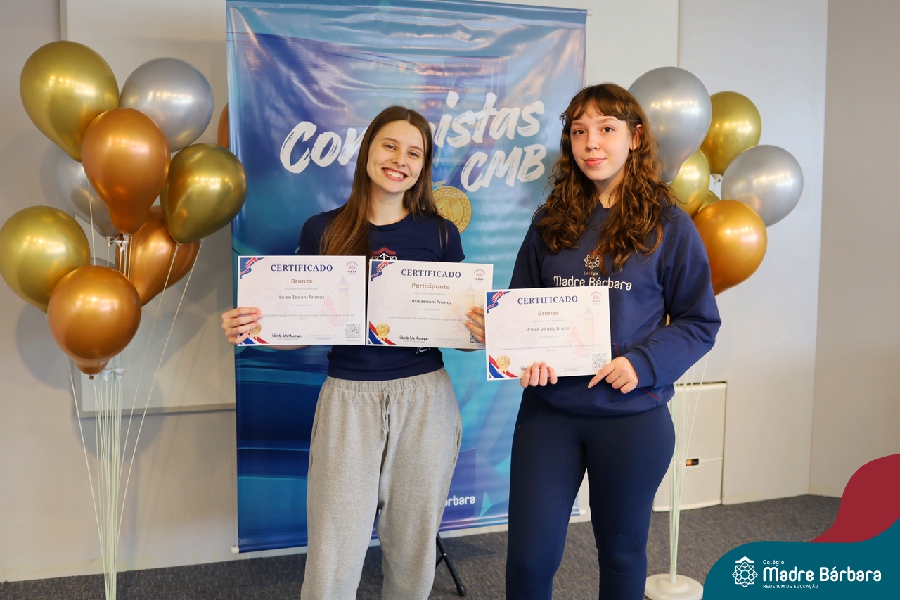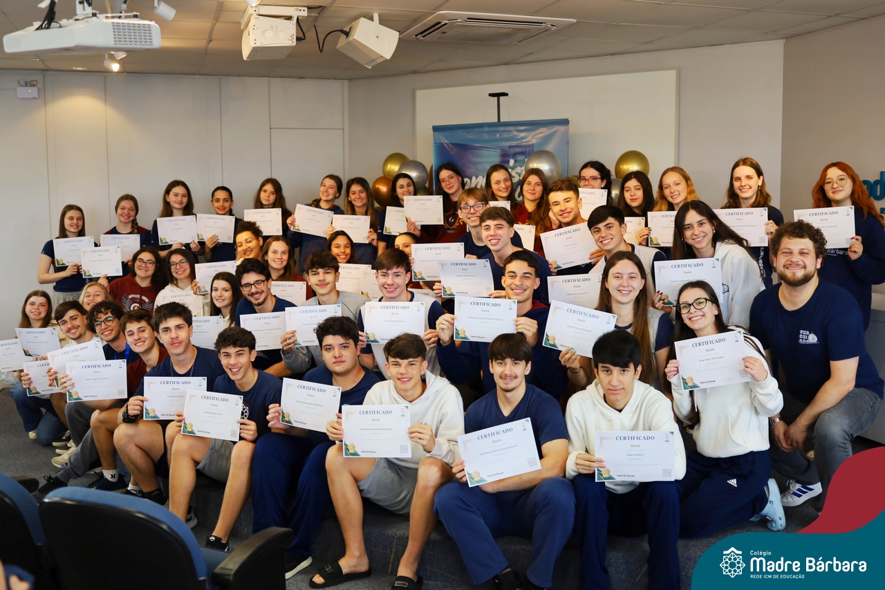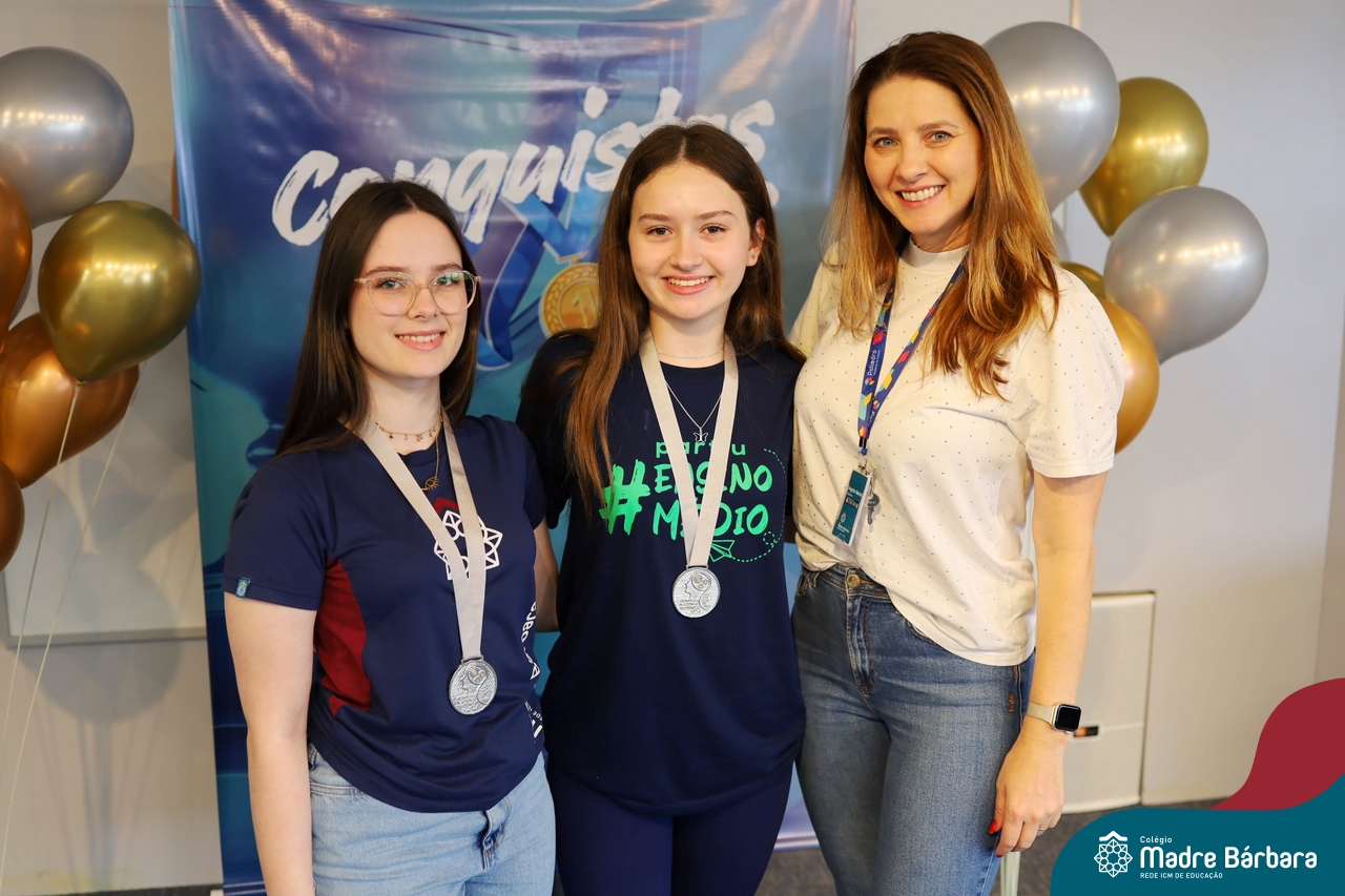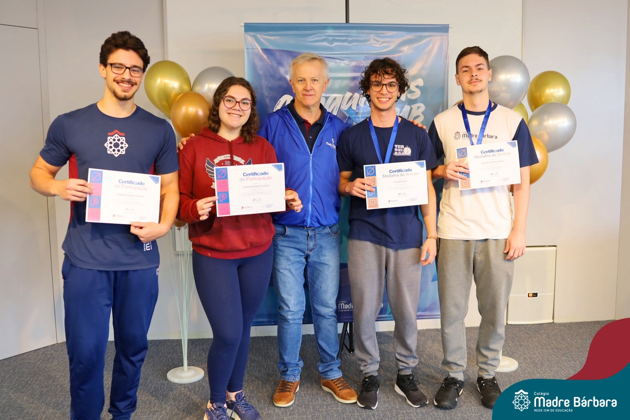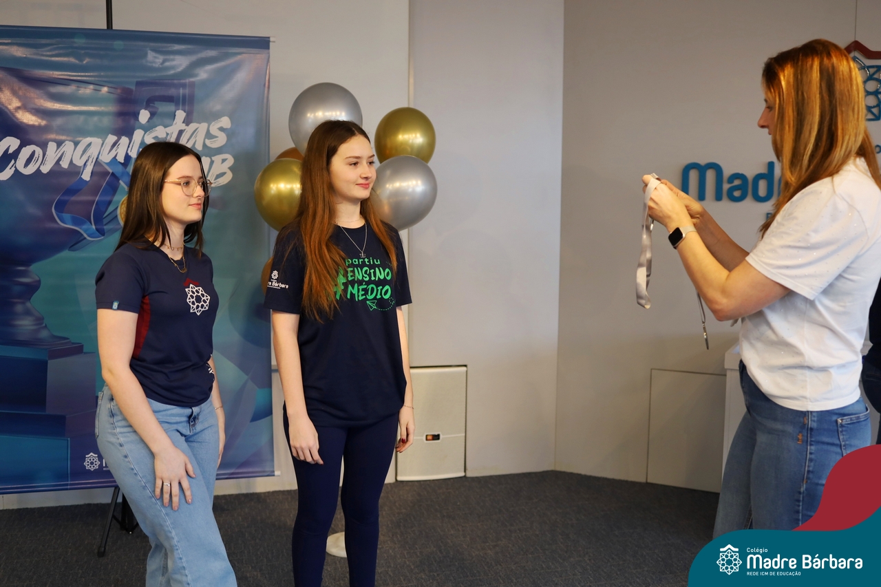 Os estudantes e professores do Ensino Fundamental – Anos Finais e do Ensino Médio do Colégio Madre Bárbara – Rede ICM se reuniram na manhã desta sexta-feira (18.11) para celebrar uma série de conquistas marcantes alcançadas pelos estudantes ao longo do ano letivo de 2025. A participação em diversas olimpíadas científicas, concursos e projetos externos reforçou o compromisso do Colégio com a construção de uma cultura olímpica e com o incentivo ao desenvolvimento acadêmico, pessoal e profissional dos alunos. Segundo a equipe pedagógica, experiências como essas ampliam o raciocínio lógico, estimulam a criatividade, fortalecem a autonomia e revelam novos interesses e vocações, resultados que ultrapassam o currículo tradicional e impactam profundamente a formação dos jovens.