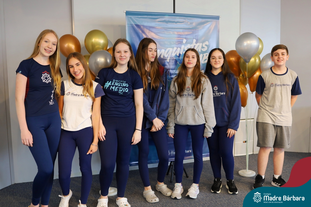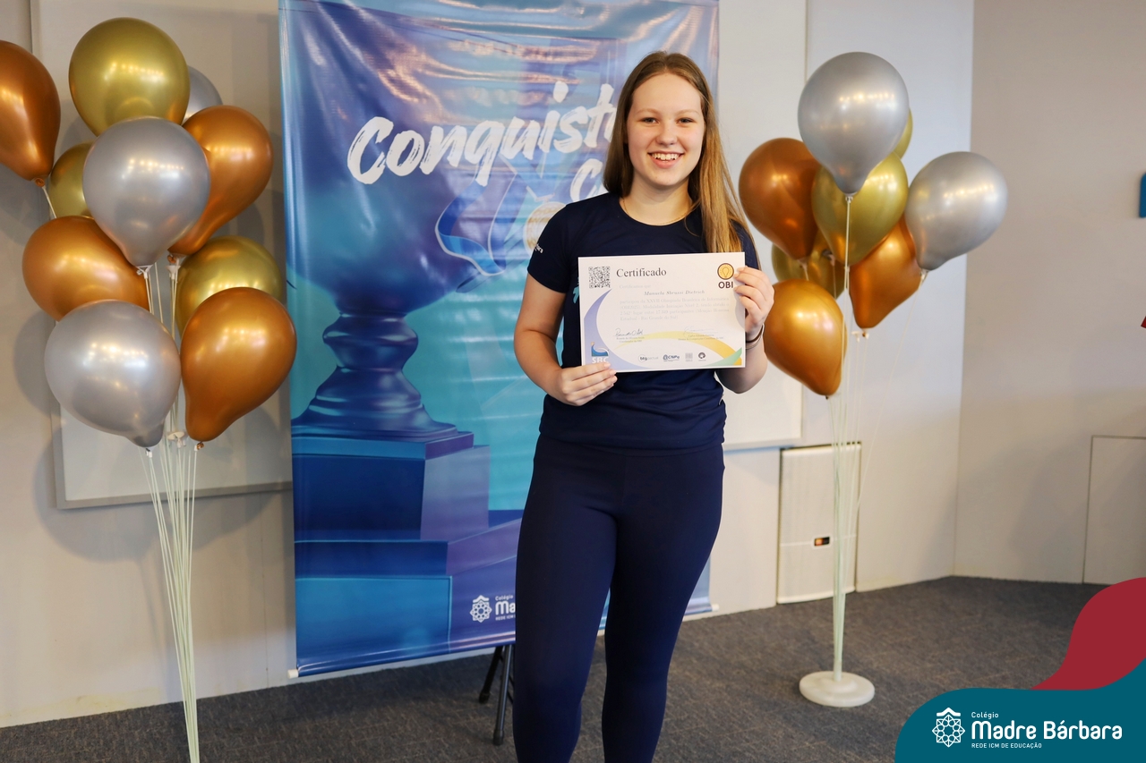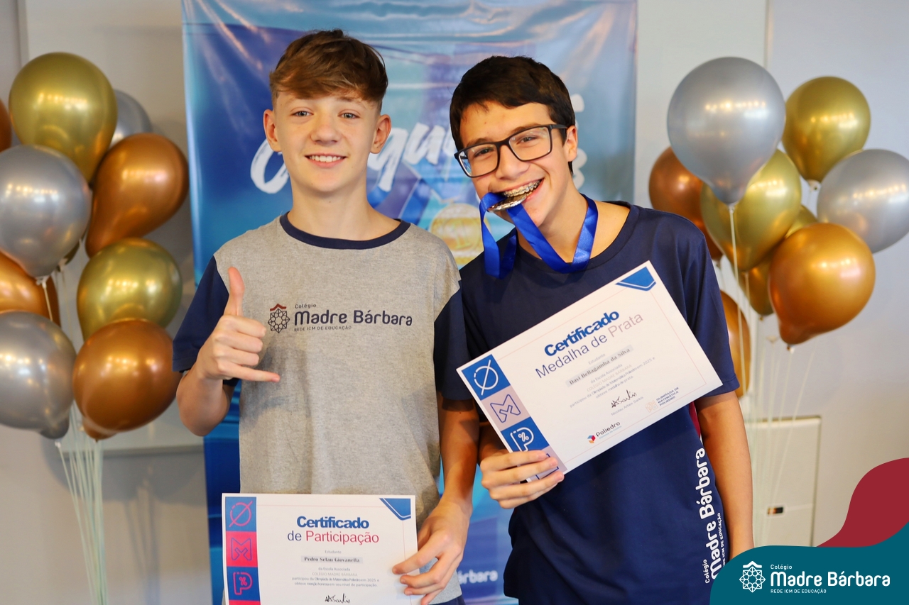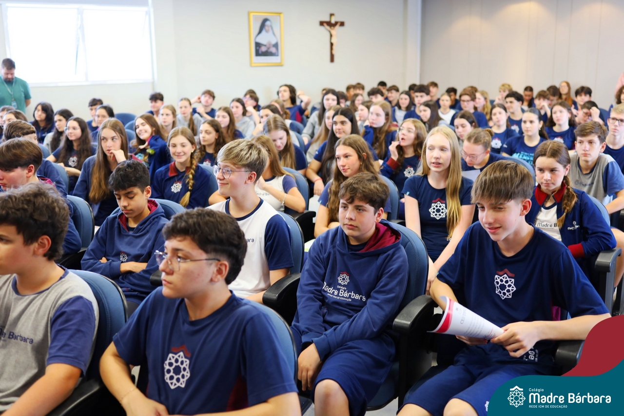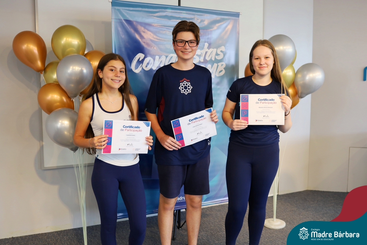 Os estudantes e professores do Ensino Fundamental – Anos Finais e do Ensino Médio do Colégio Madre Bárbara – Rede ICM se reuniram na manhã desta sexta-feira (18.11) para celebrar uma série de conquistas marcantes alcançadas pelos estudantes ao longo do ano letivo de 2025. A participação em diversas olimpíadas científicas, concursos e projetos externos reforçou o compromisso do Colégio com a construção de uma cultura olímpica e com o incentivo ao desenvolvimento acadêmico, pessoal e profissional dos alunos. Segundo a equipe pedagógica, experiências como essas ampliam o raciocínio lógico, estimulam a criatividade, fortalecem a autonomia e revelam novos interesses e vocações, resultados que ultrapassam o currículo tradicional e impactam profundamente a formação dos jovens.