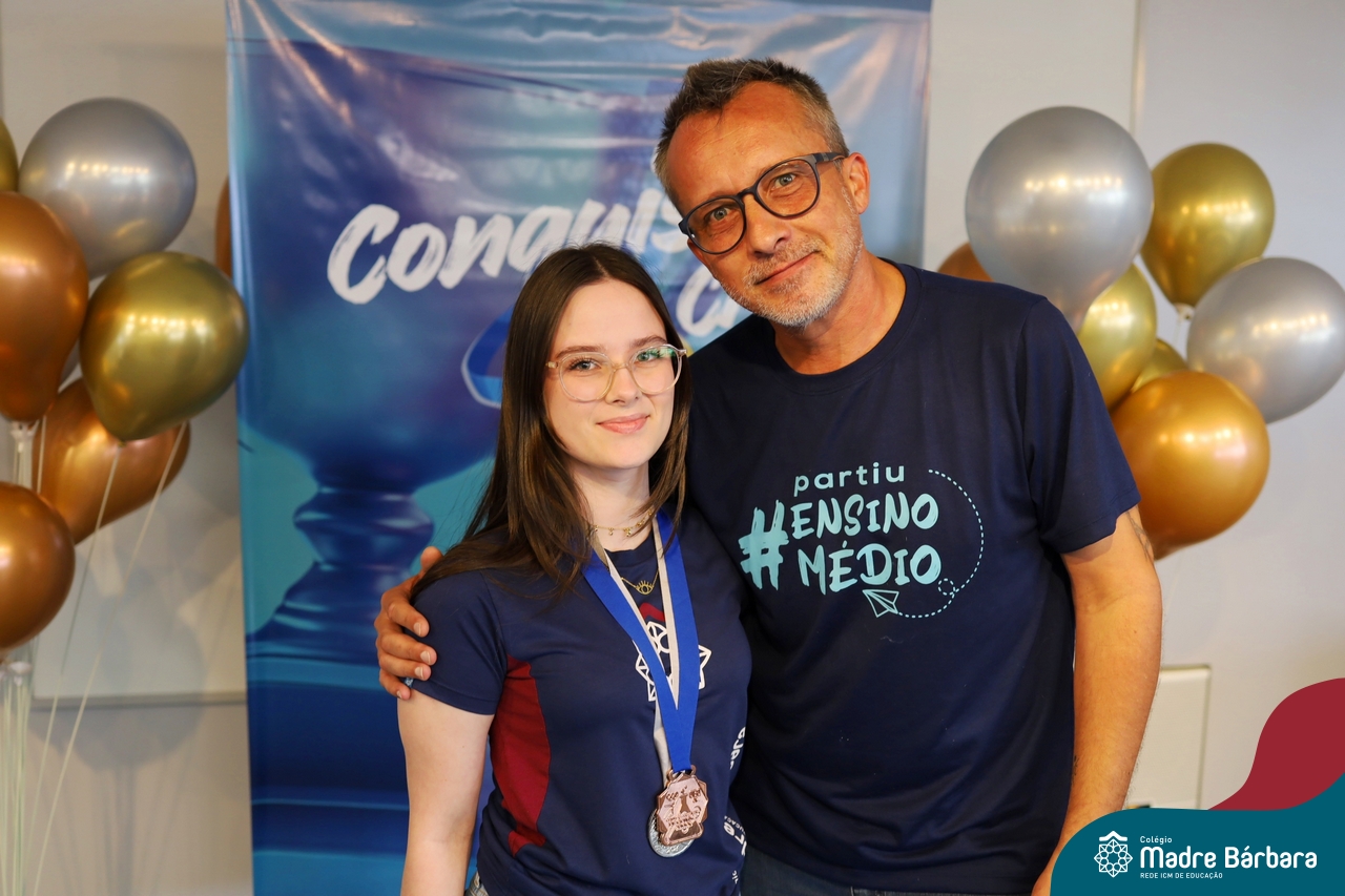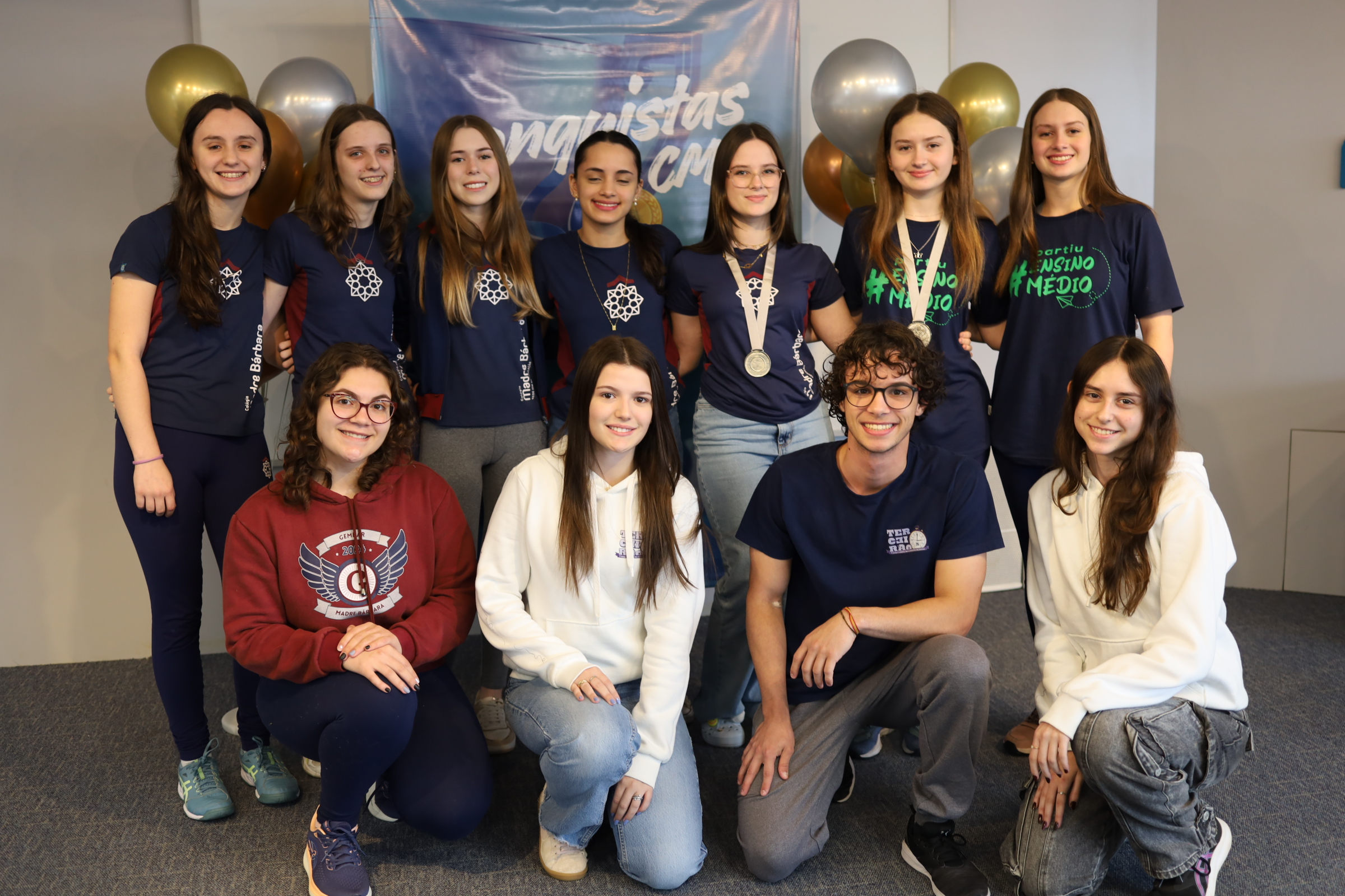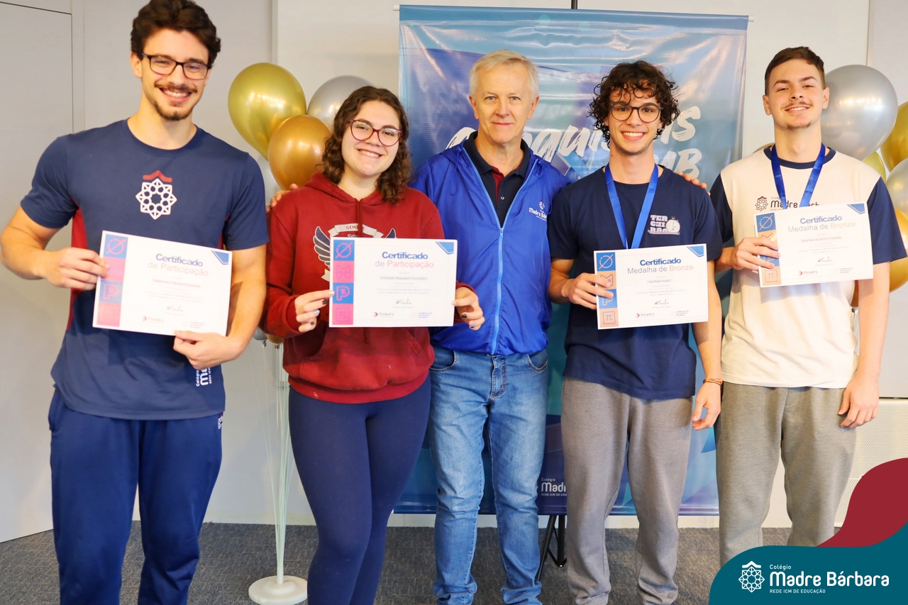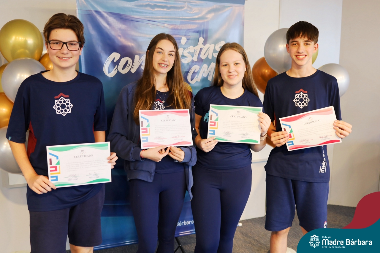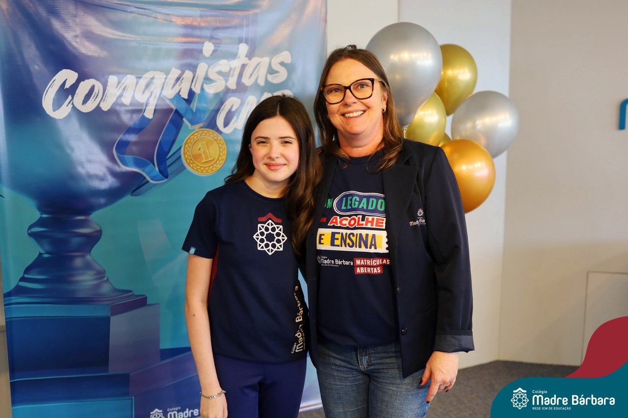Os estudantes e professores do Ensino Fundamental – Anos Finais e do Ensino Médio do Colégio Madre Bárbara – Rede ICM se reuniram na manhã desta sexta-feira (18.11) para celebrar uma série de conquistas marcantes alcançadas pelos estudantes ao longo do ano letivo de 2025. A participação em diversas olimpíadas científicas, concursos e projetos externos reforçou o compromisso do Colégio com a construção de uma cultura olímpica e com o incentivo ao desenvolvimento acadêmico, pessoal e profissional dos alunos. Segundo a equipe pedagógica, experiências como essas ampliam o raciocínio lógico, estimulam a criatividade, fortalecem a autonomia e revelam novos interesses e vocações, resultados que ultrapassam o currículo tradicional e impactam profundamente a formação dos jovens.