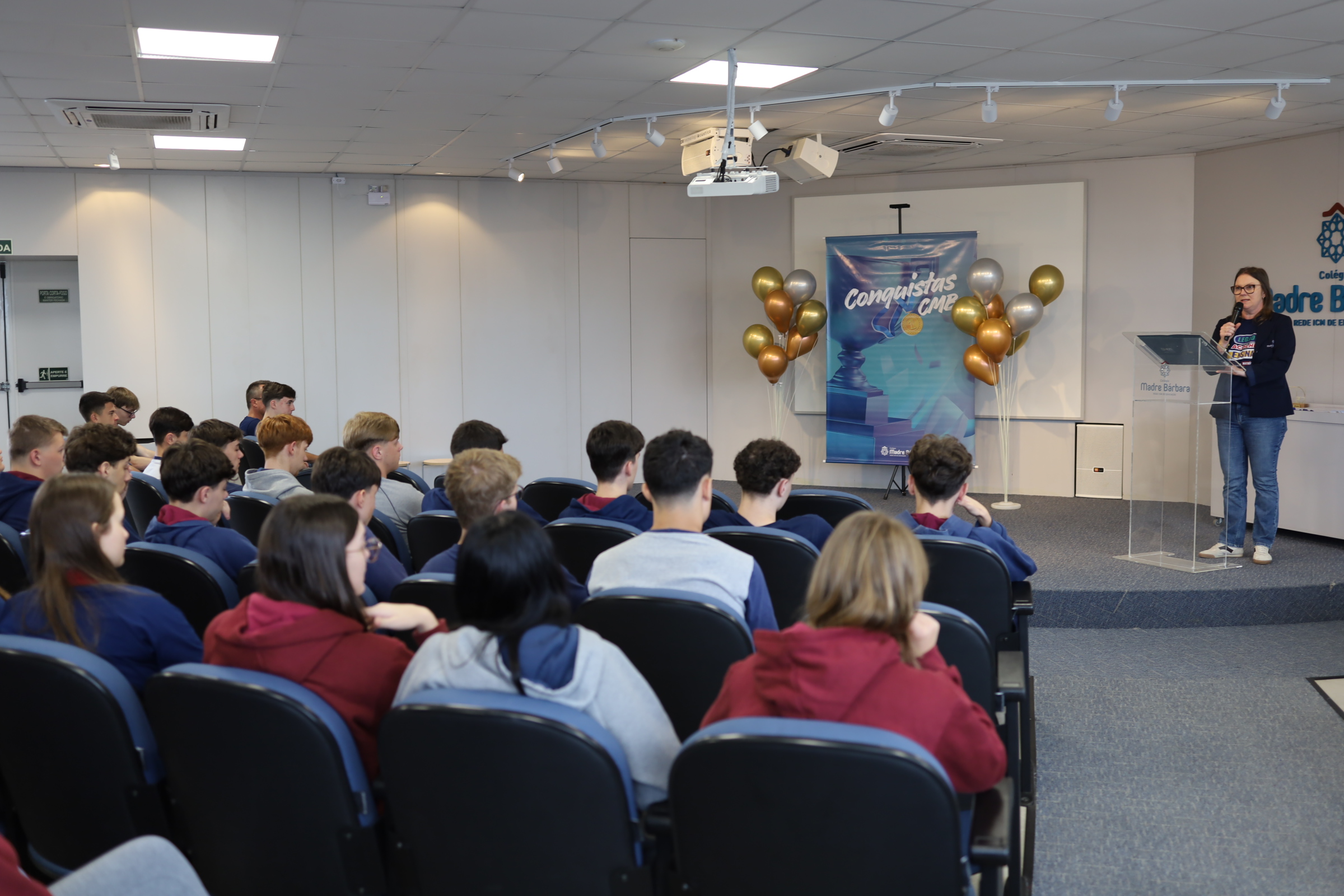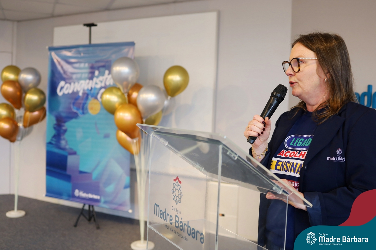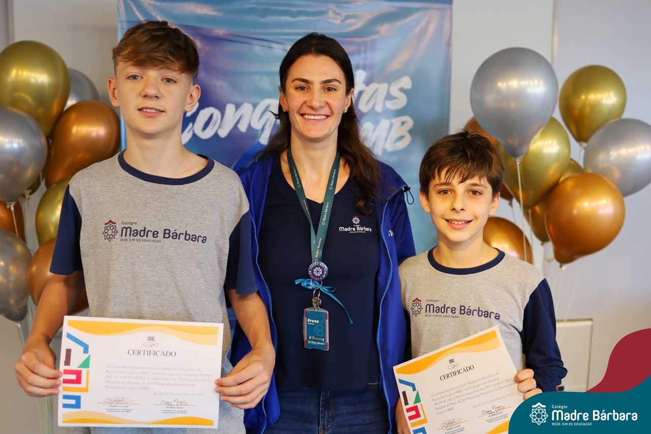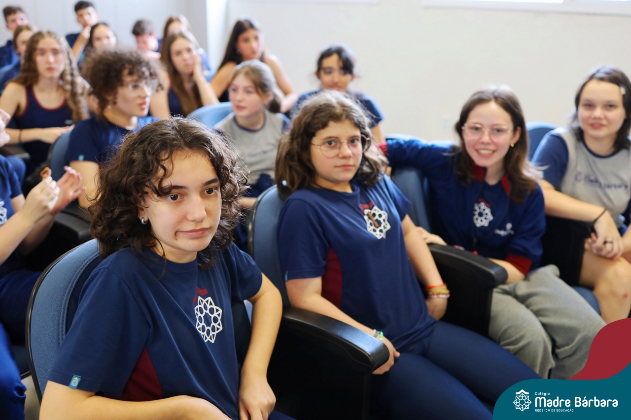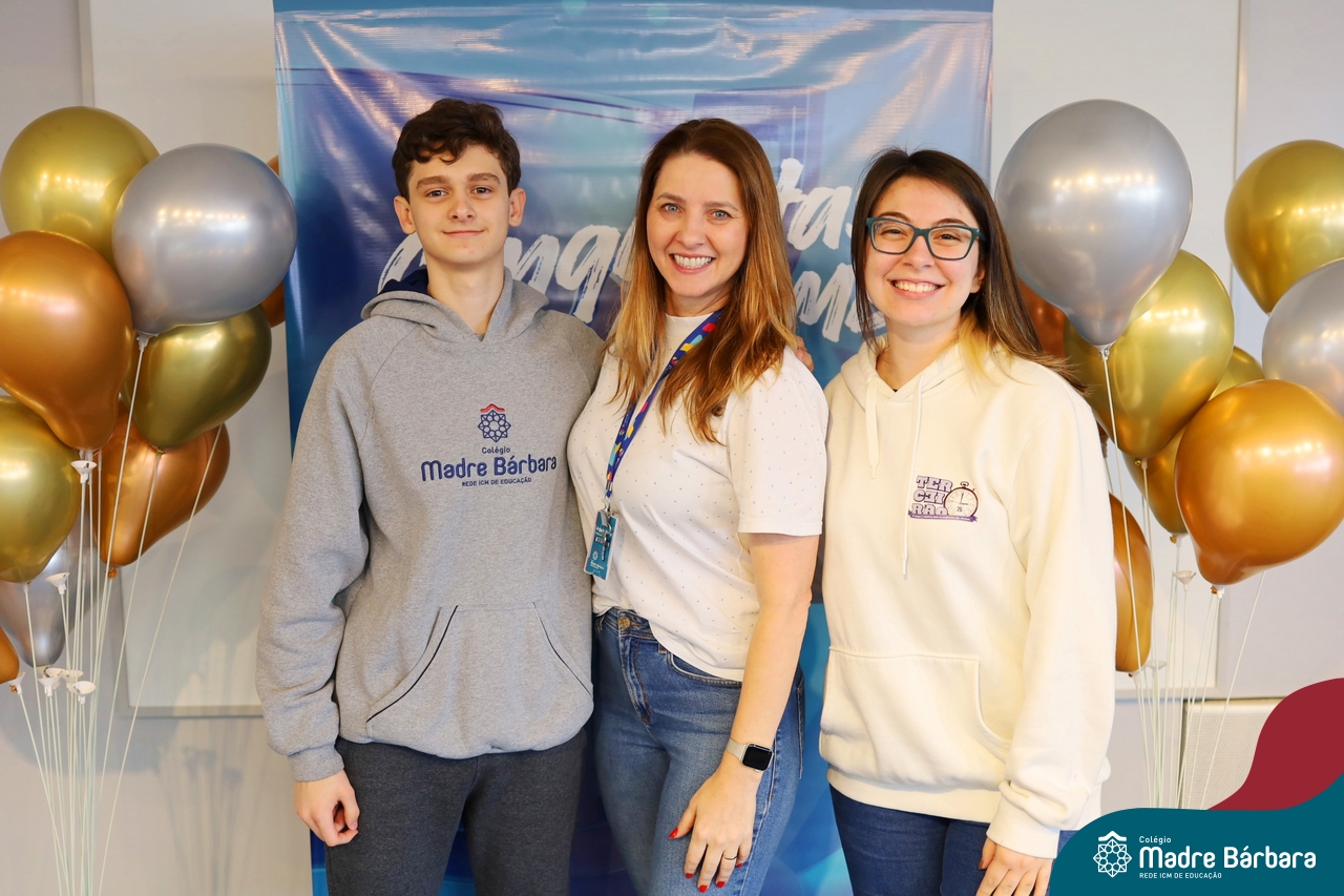 Os estudantes e professores do Ensino Fundamental – Anos Finais e do Ensino Médio do Colégio Madre Bárbara – Rede ICM se reuniram na manhã desta sexta-feira (18.11) para celebrar uma série de conquistas marcantes alcançadas pelos estudantes ao longo do ano letivo de 2025. A participação em diversas olimpíadas científicas, concursos e projetos externos reforçou o compromisso do Colégio com a construção de uma cultura olímpica e com o incentivo ao desenvolvimento acadêmico, pessoal e profissional dos alunos. Segundo a equipe pedagógica, experiências como essas ampliam o raciocínio lógico, estimulam a criatividade, fortalecem a autonomia e revelam novos interesses e vocações, resultados que ultrapassam o currículo tradicional e impactam profundamente a formação dos jovens.
