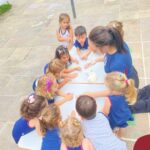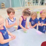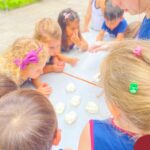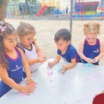 A turma também produziu a encantadora massa de modelar “nuvem”. Ao misturar os ingredientes e observar a textura macia e fofinha se formar, as crianças exploraram cores, sensações e estimularam a criatividade. A atividade proporcionou momentos de imaginação, expressão e desenvolvimento da coordenação motora fina.