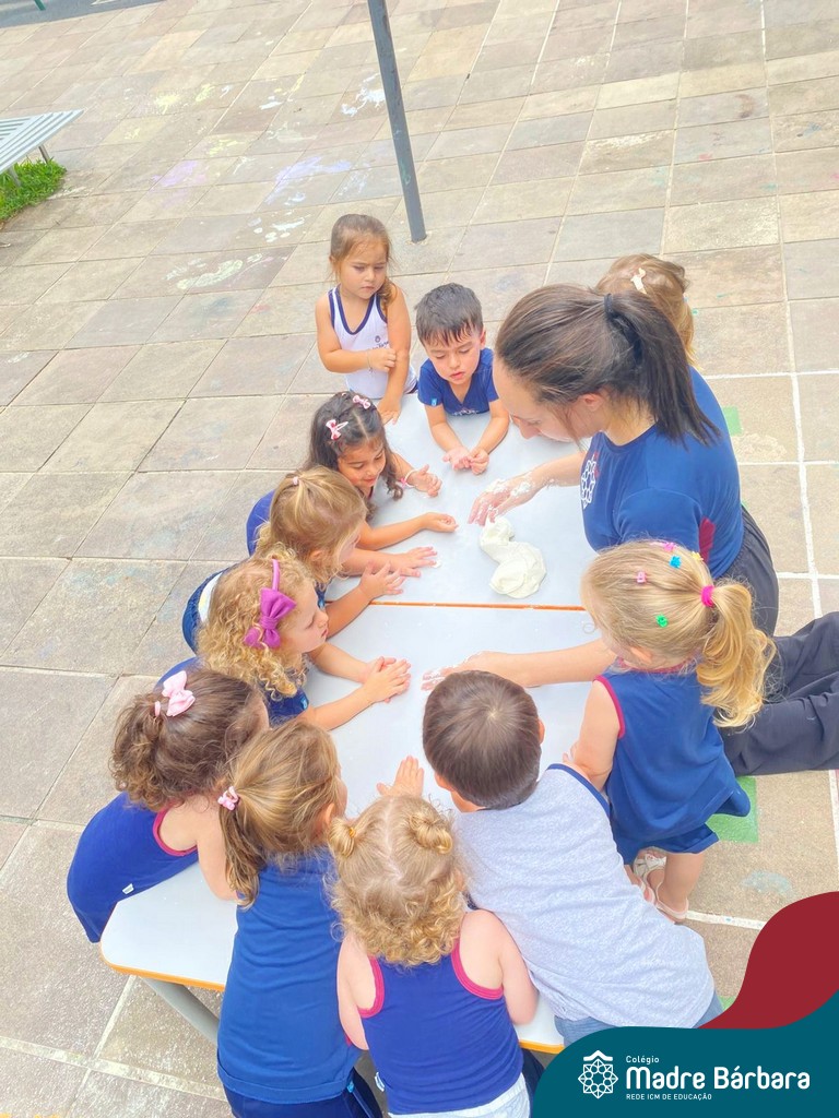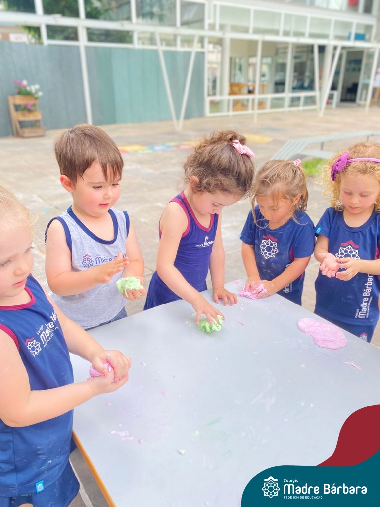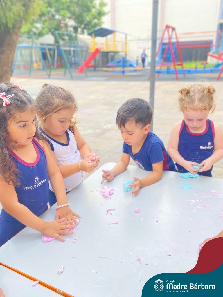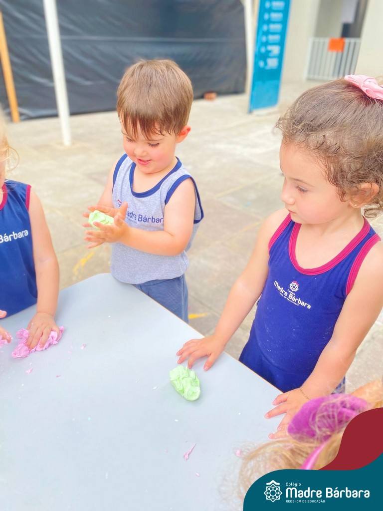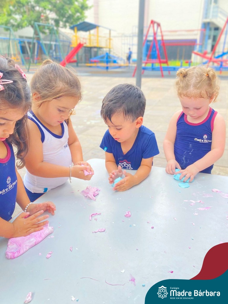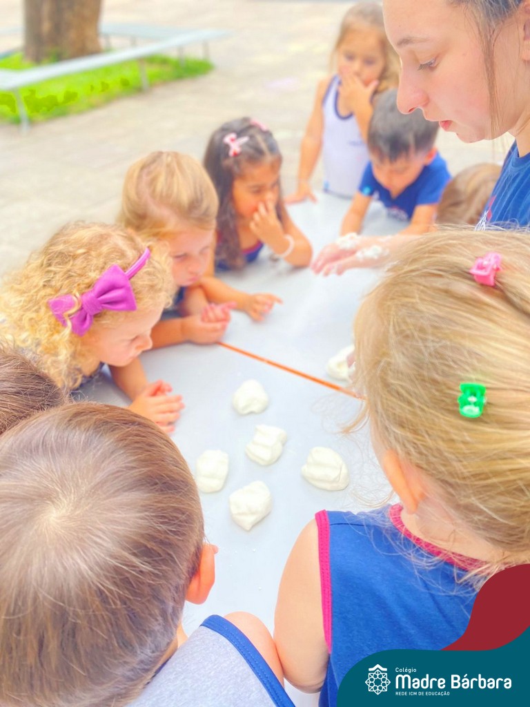 A turma também produziu a encantadora massa de modelar “nuvem”. Ao misturar os ingredientes e observar a textura macia e fofinha se formar, as crianças exploraram cores, sensações e estimularam a criatividade. A atividade proporcionou momentos de imaginação, expressão e desenvolvimento da coordenação motora fina.