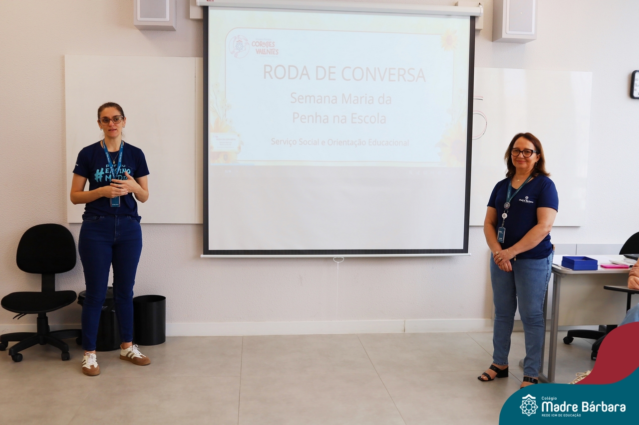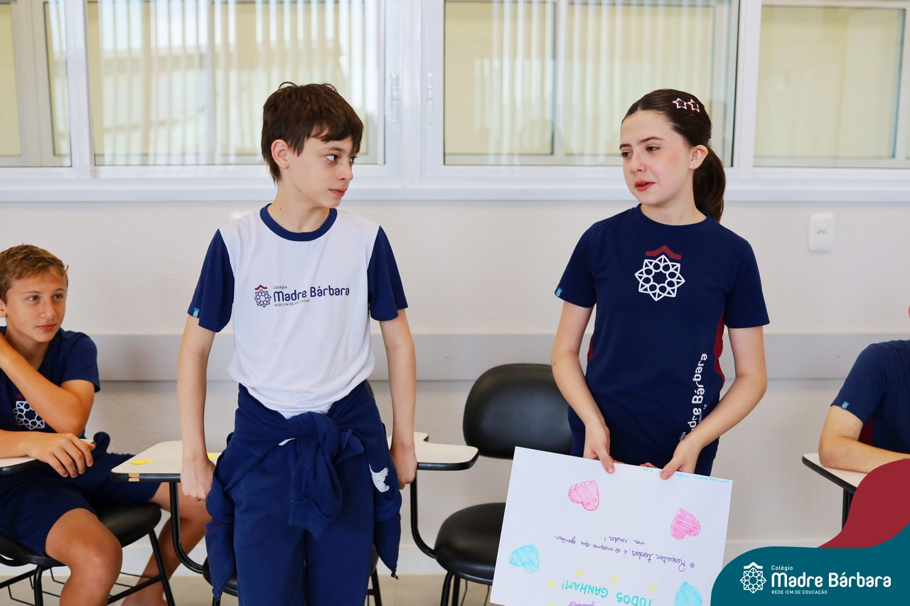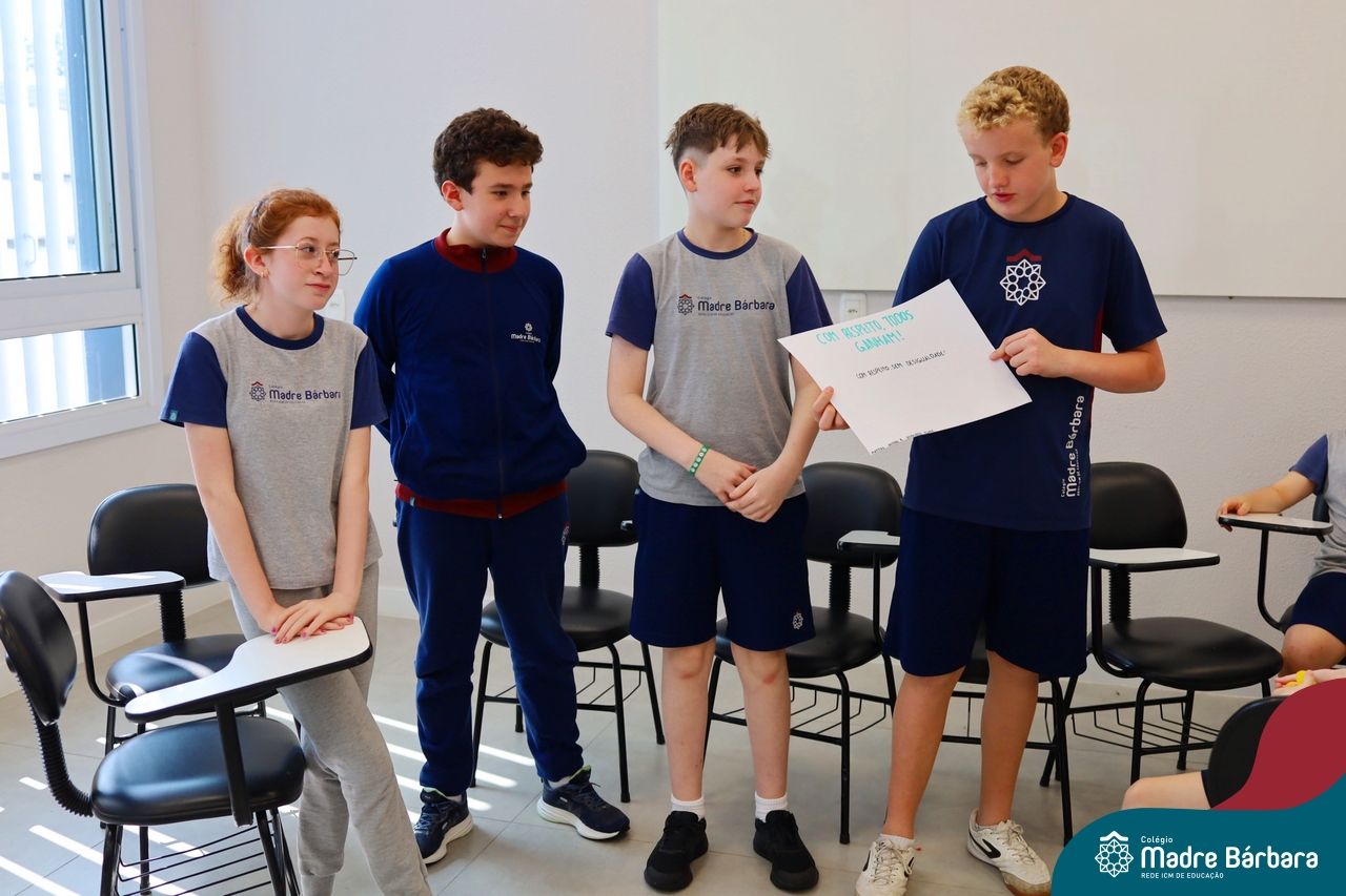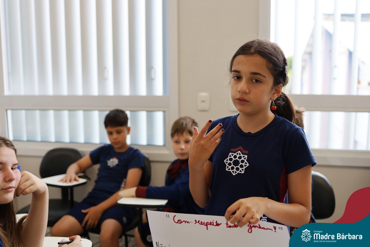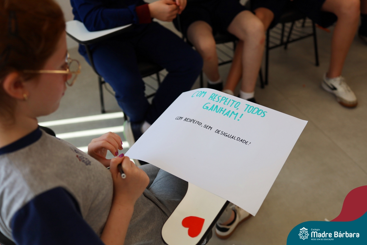 Dando continuidade a programação da Semana Maria da Penha na Escola, foi realizado na manhã da quarta-feira (26.11) a Roda de Conversa com as turmas dos 6º anos do Ensino Fundamental – Anos Finais, com o objetivo de promover reflexão sobre respeito e igualdade de direitos. A atividade foi dirigida pela Assistente Social Melissa Capra e pela Orientadora Educacional Odete Spessatto, que abordaram o assunto de forma sensível e esclarecedora. Durante o encontro, os alunos conheceram a história de vida de Maria da Penha e como surgiu a Lei que leva o seu nome. O trabalho realizado pelos alunos, nomeado como Varal do Respeito, evidenciou o entendimento sobre a importância em combater qualquer forma de violência, com destaque à proteção para as mulheres.