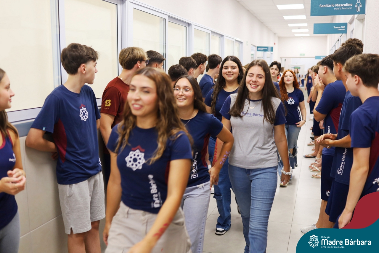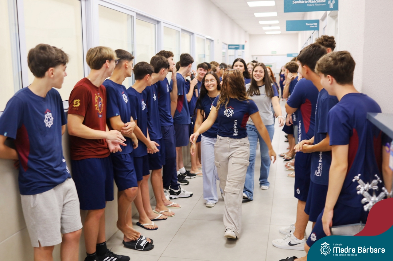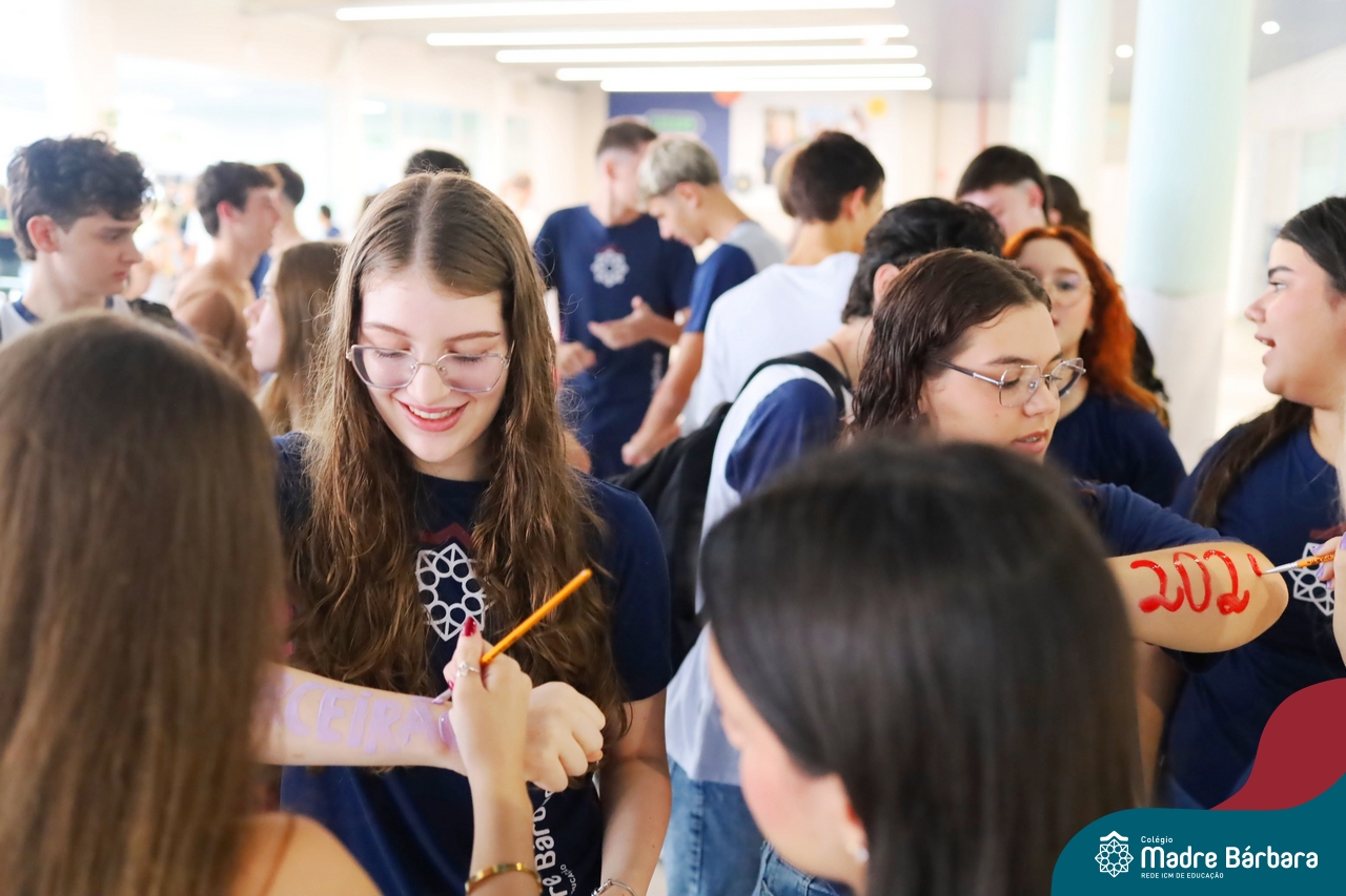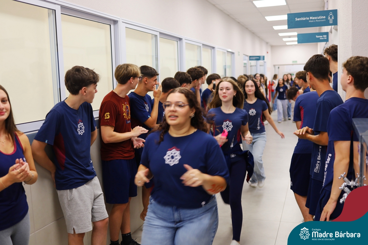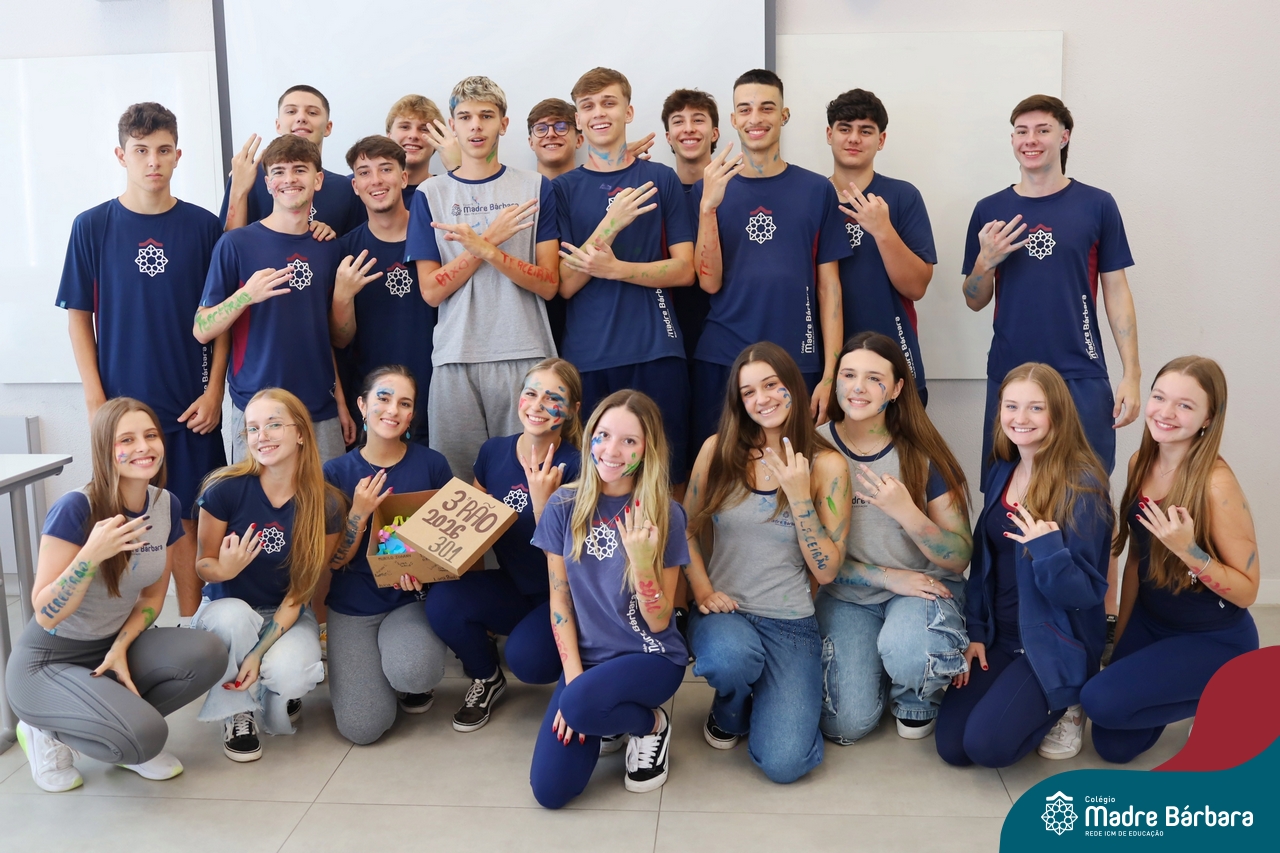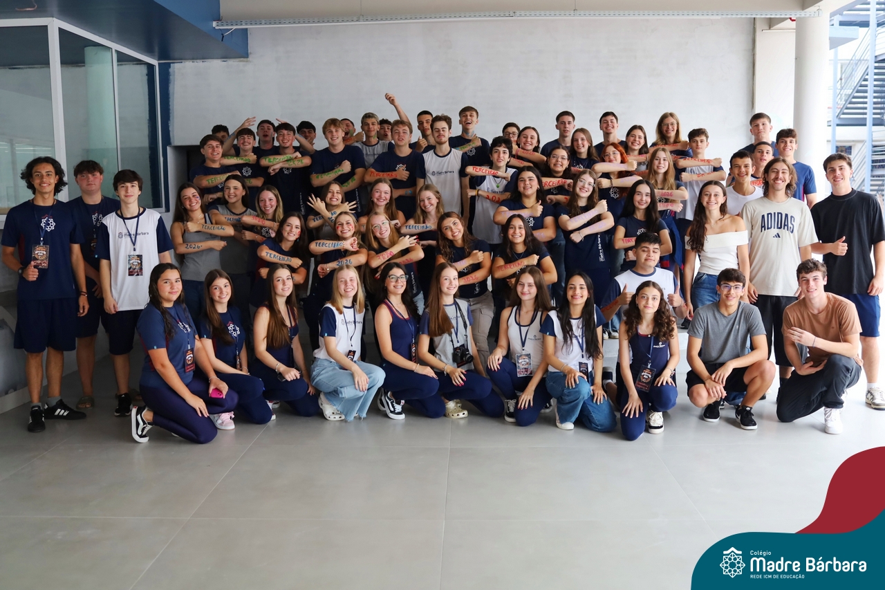 O Terceirão 2026 começou com uma programação de acolhida repleta de significado, integração e boas energias no Colégio Madre Bárbara – Rede ICM. Logo no início da manhã, as turmas 301 e 302 foram recebidas com entusiasmo pelo Grêmio Estudantil (Gembar) e por um grupo de estudantes que representou o Terceirão do ano passado. Em um gesto simbólico e cheio de carinho, mensagens de incentivo e boas energias foram escritas nos braços dos terceiranistas, marcando o começo de um ano que promete ser inesquecível.