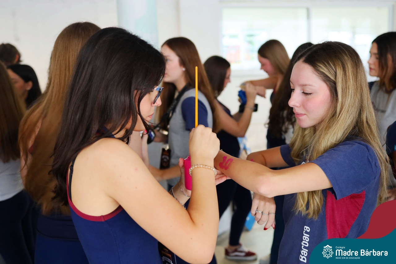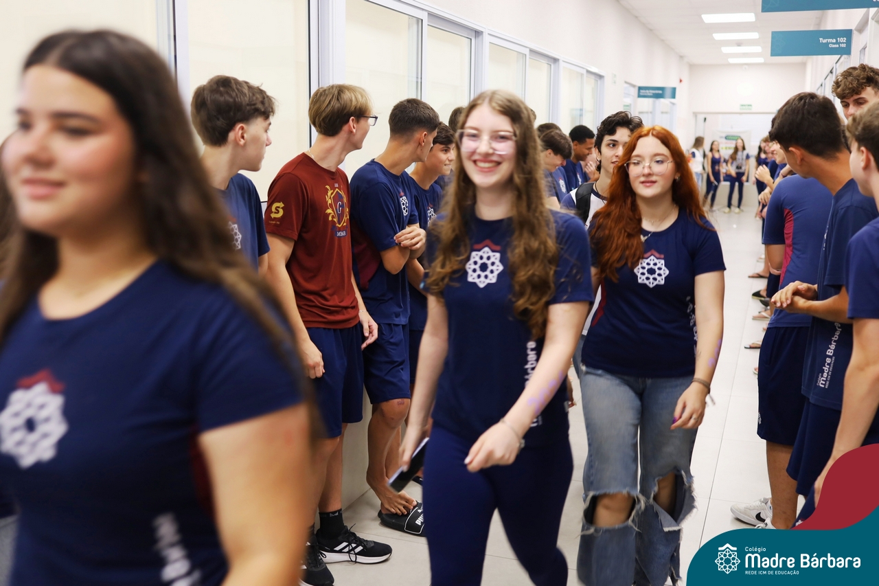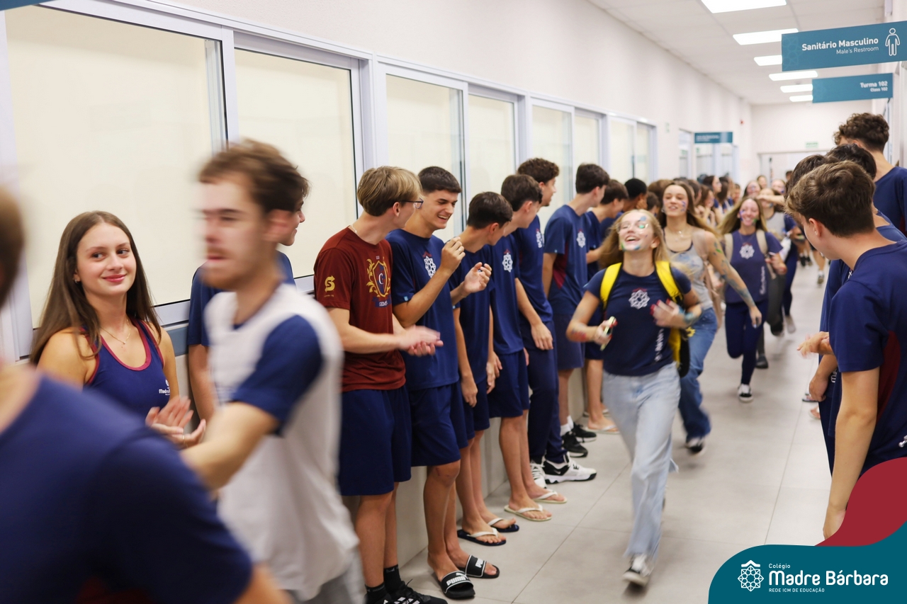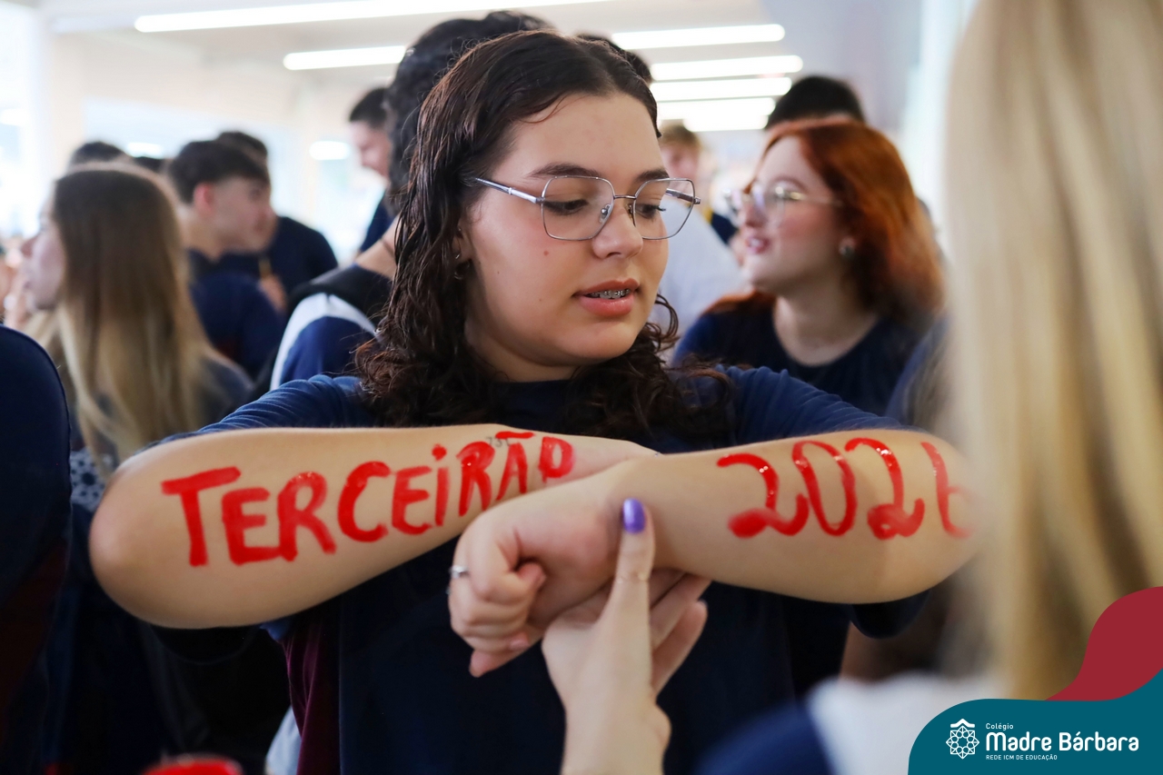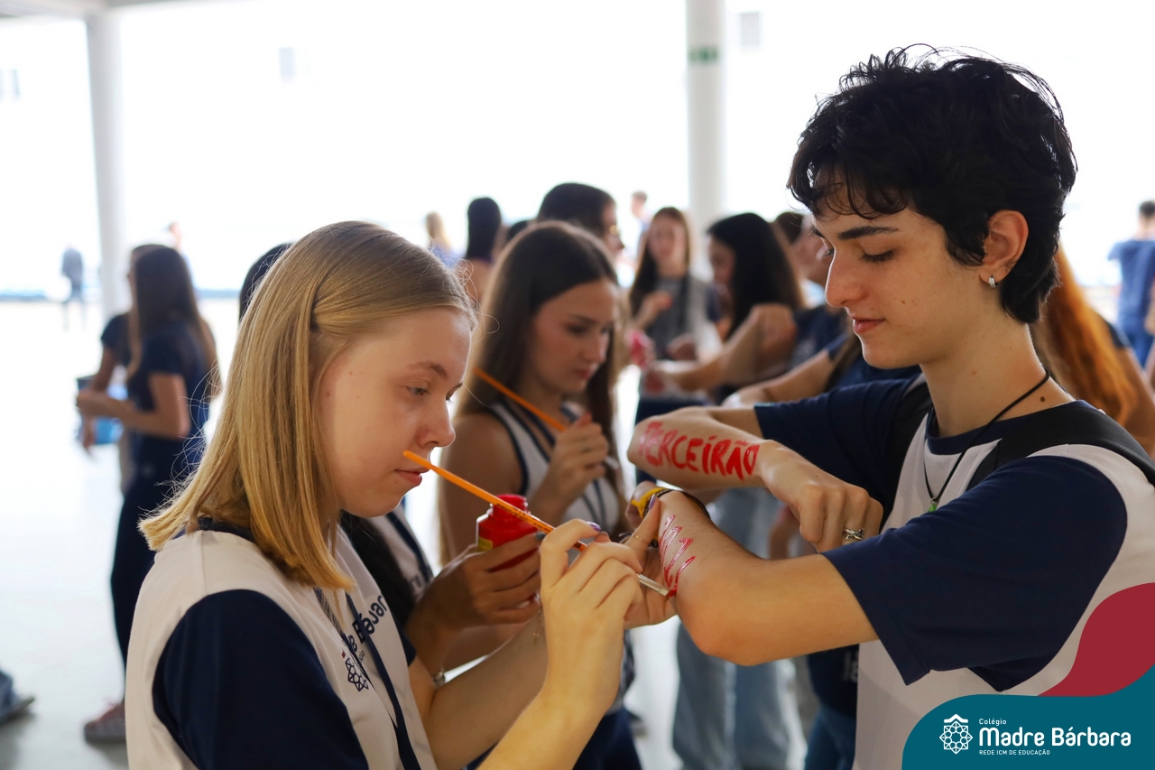 O Terceirão 2026 começou com uma programação de acolhida repleta de significado, integração e boas energias no Colégio Madre Bárbara – Rede ICM. Logo no início da manhã, as turmas 301 e 302 foram recebidas com entusiasmo pelo Grêmio Estudantil (Gembar) e por um grupo de estudantes que representou o Terceirão do ano passado. Em um gesto simbólico e cheio de carinho, mensagens de incentivo e boas energias foram escritas nos braços dos terceiranistas, marcando o começo de um ano que promete ser inesquecível.