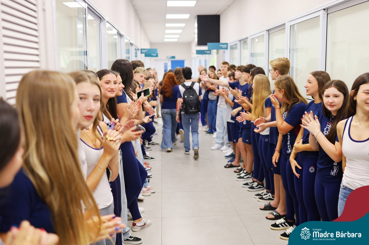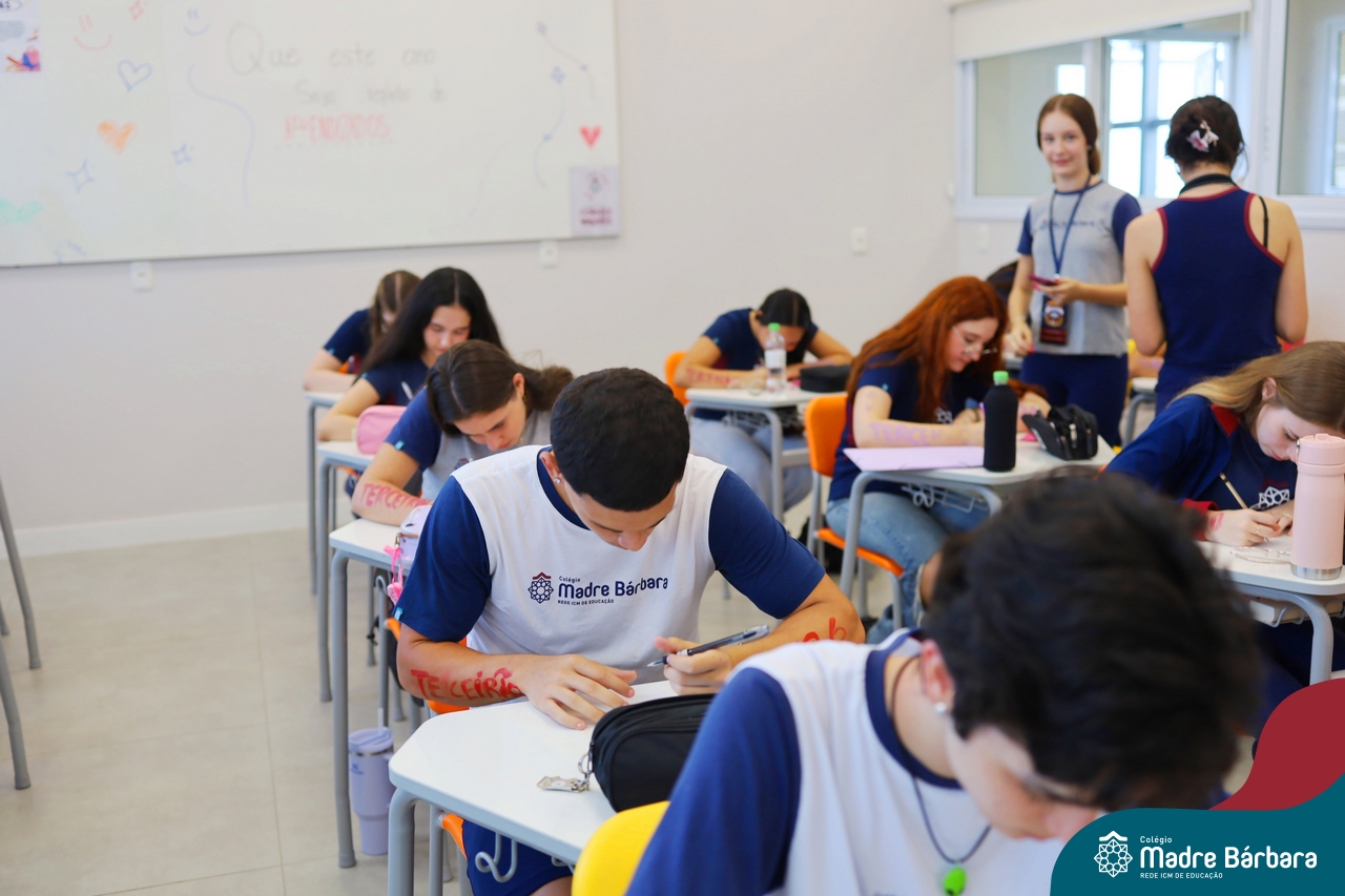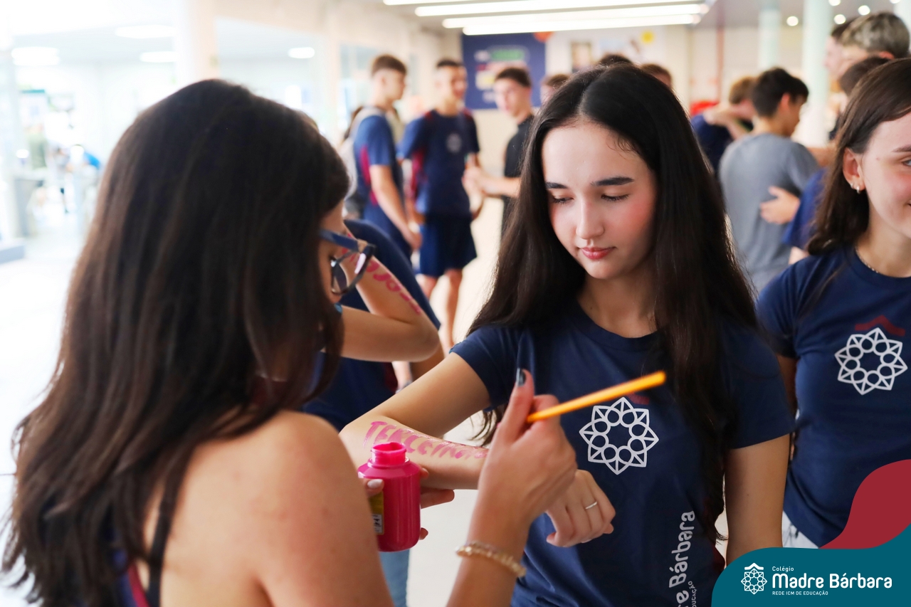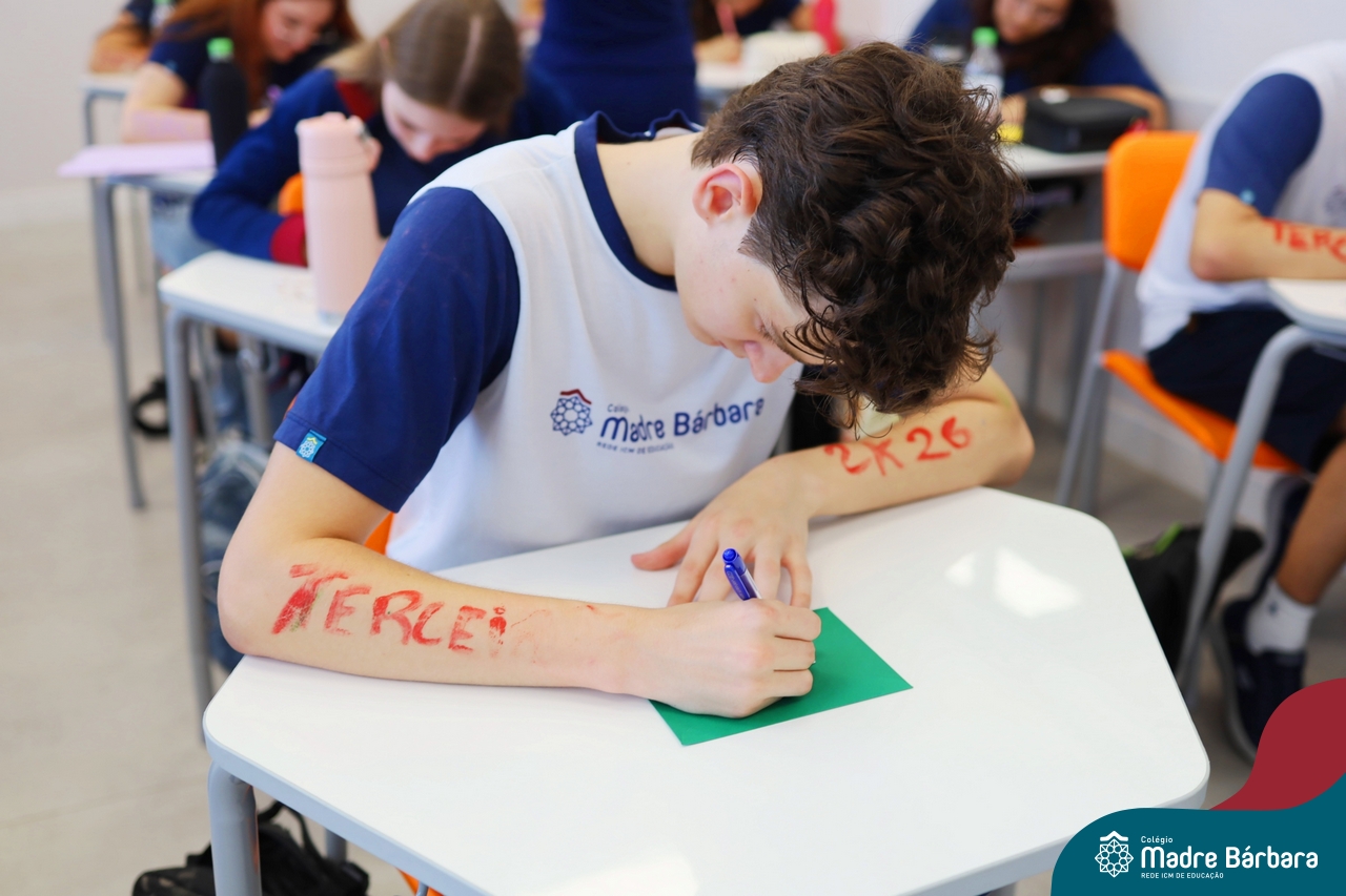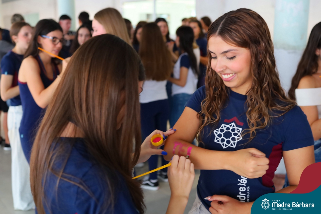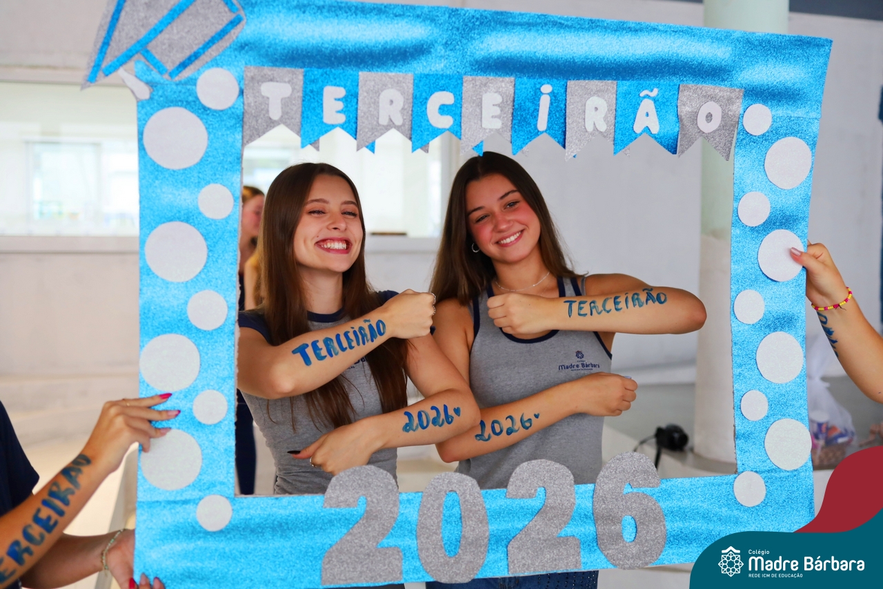 O Terceirão 2026 começou com uma programação de acolhida repleta de significado, integração e boas energias no Colégio Madre Bárbara – Rede ICM. Logo no início da manhã, as turmas 301 e 302 foram recebidas com entusiasmo pelo Grêmio Estudantil (Gembar) e por um grupo de estudantes que representou o Terceirão do ano passado. Em um gesto simbólico e cheio de carinho, mensagens de incentivo e boas energias foram escritas nos braços dos terceiranistas, marcando o começo de um ano que promete ser inesquecível.