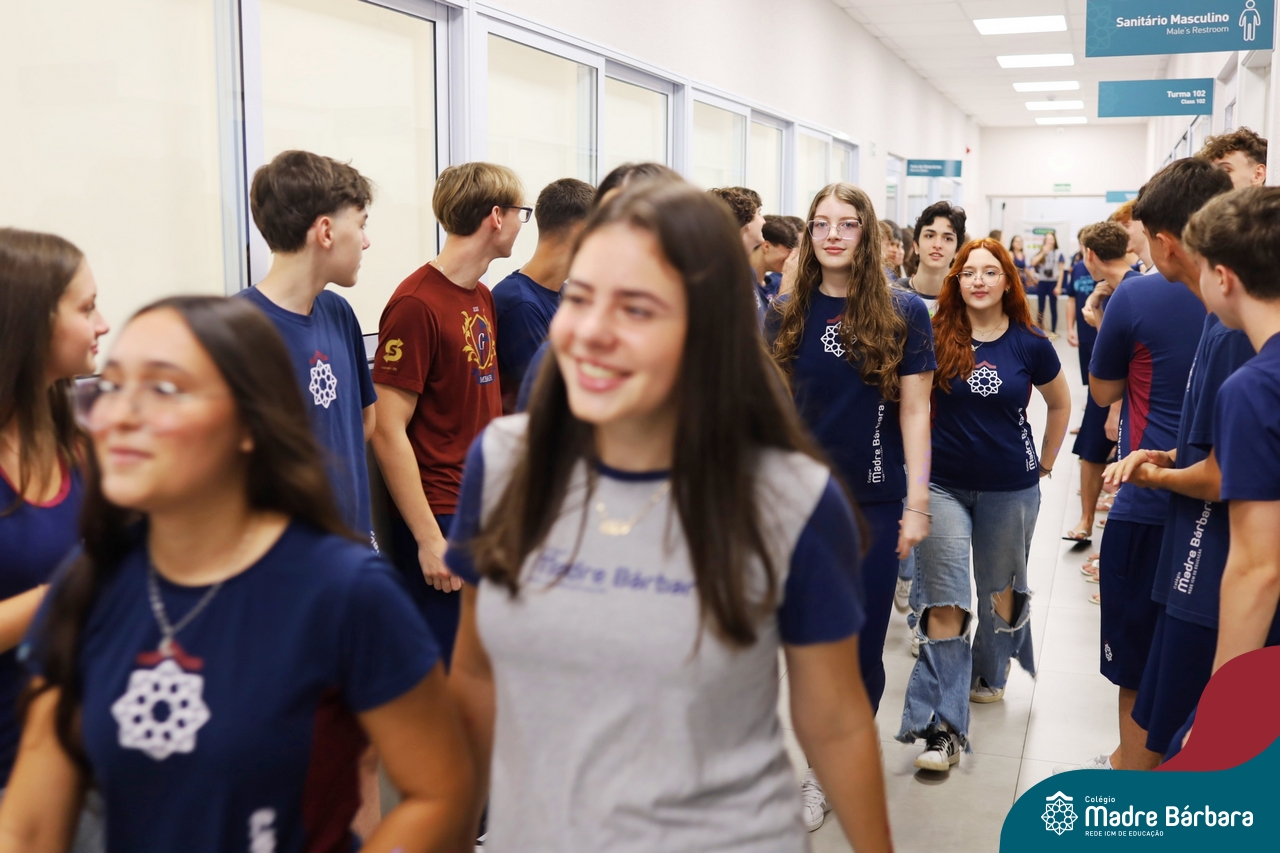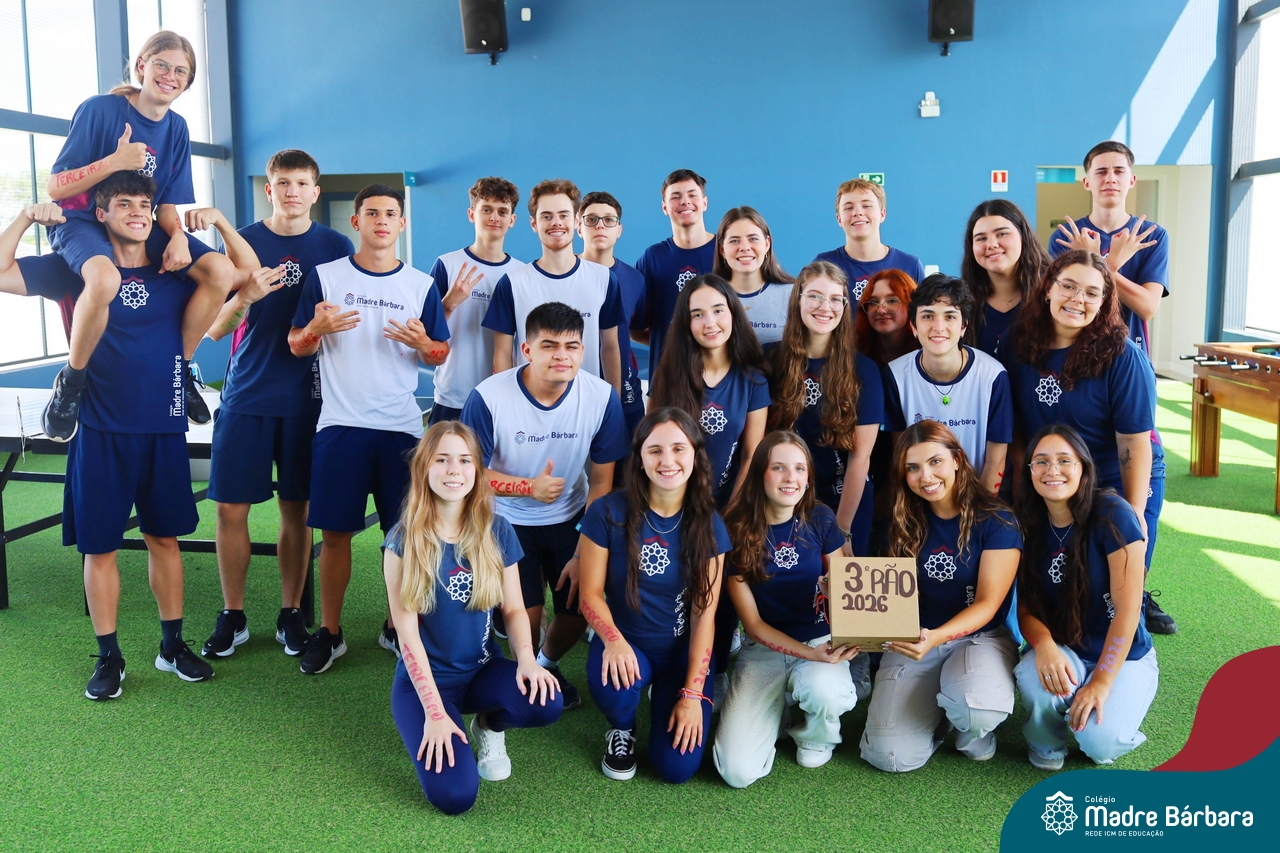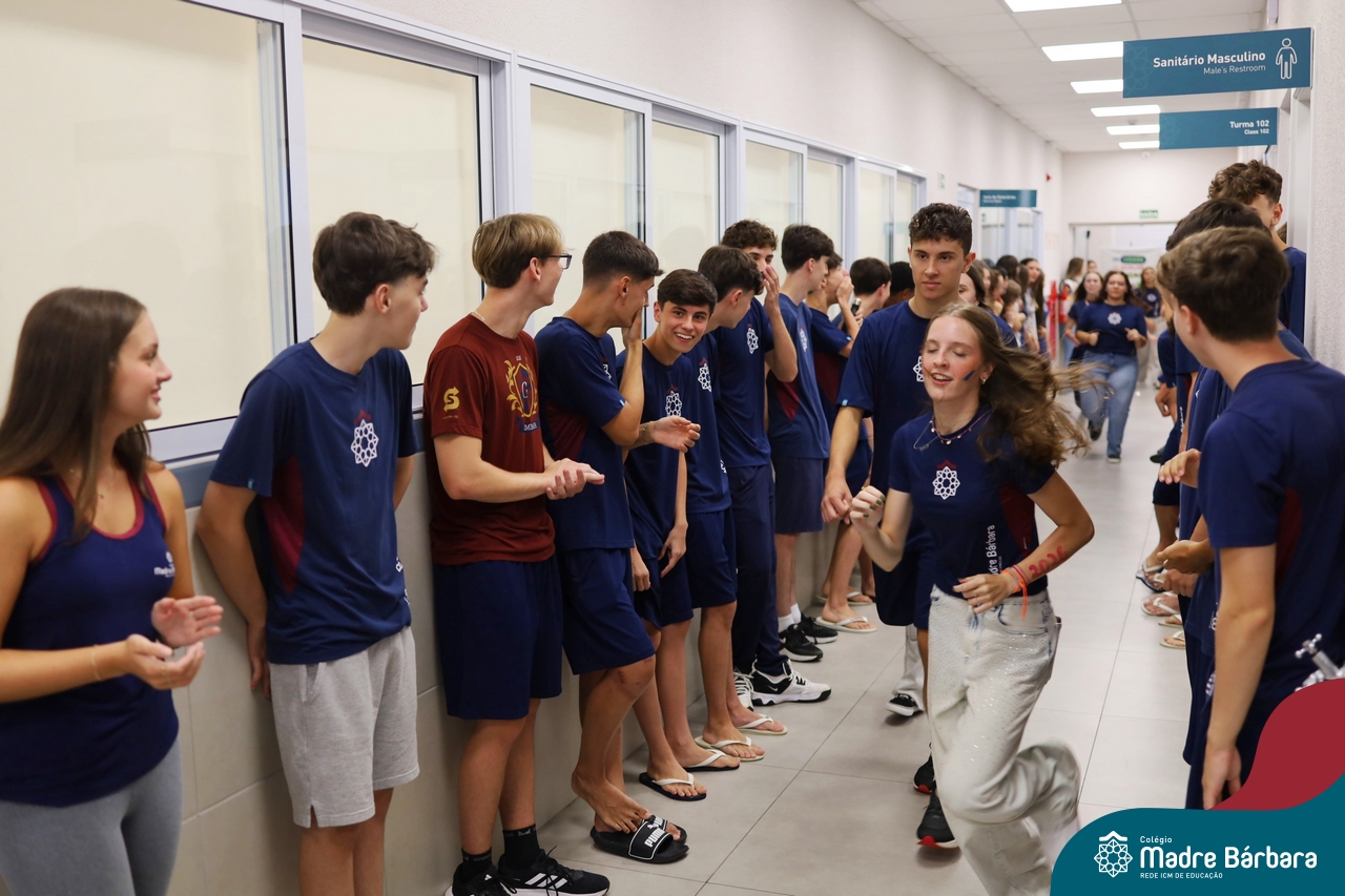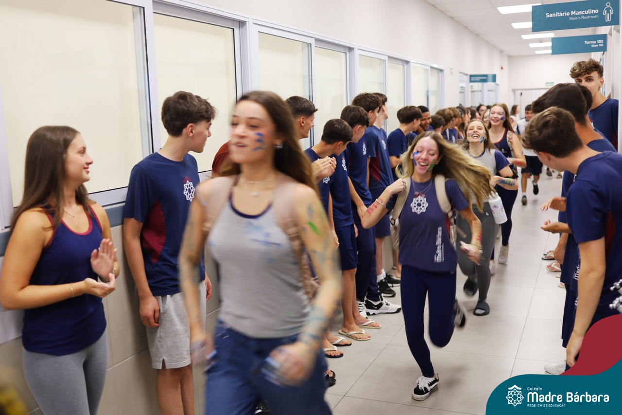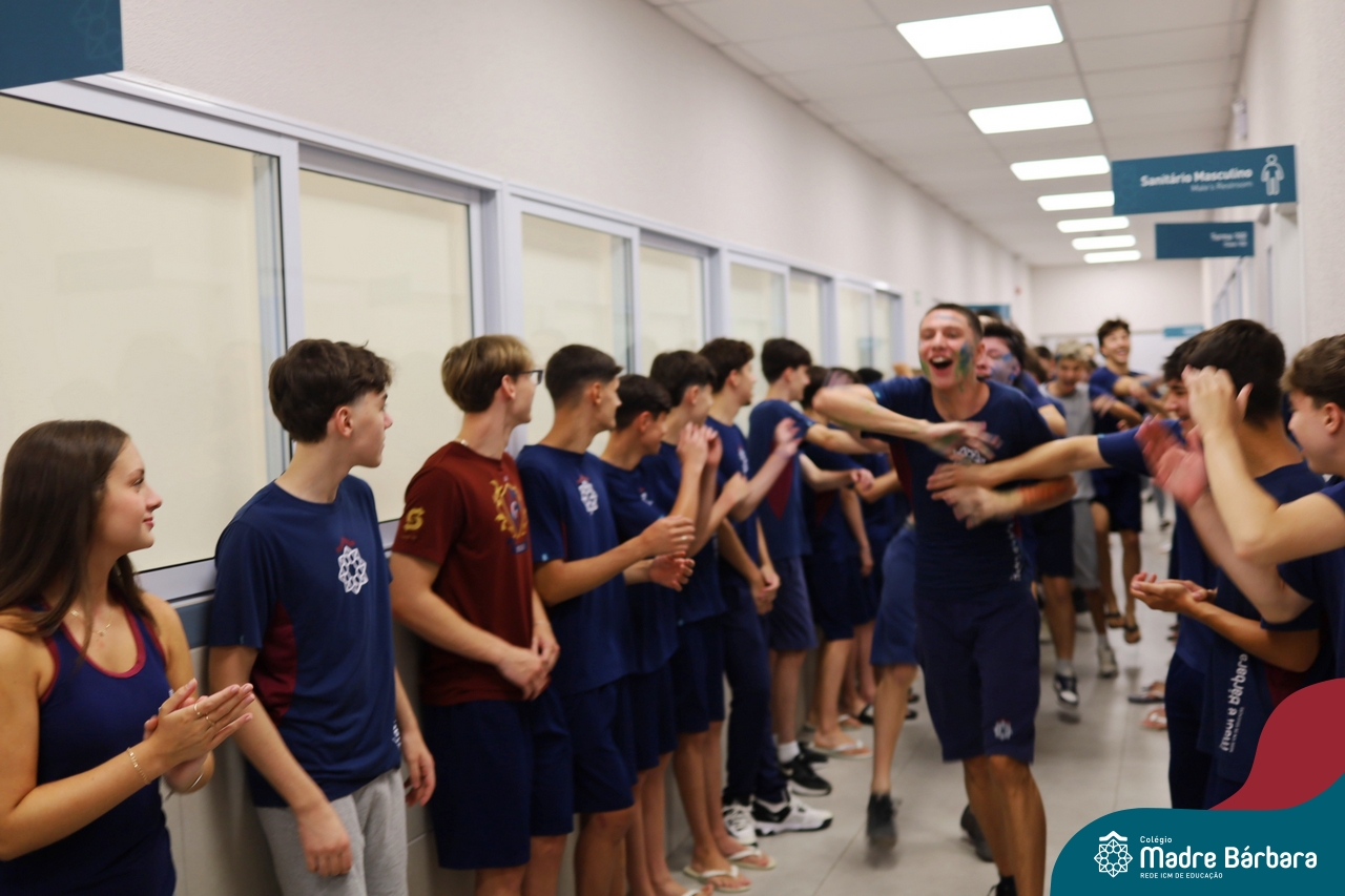 O Terceirão 2026 começou com uma programação de acolhida repleta de significado, integração e boas energias no Colégio Madre Bárbara – Rede ICM. Logo no início da manhã, as turmas 301 e 302 foram recebidas com entusiasmo pelo Grêmio Estudantil (Gembar) e por um grupo de estudantes que representou o Terceirão do ano passado. Em um gesto simbólico e cheio de carinho, mensagens de incentivo e boas energias foram escritas nos braços dos terceiranistas, marcando o começo de um ano que promete ser inesquecível.