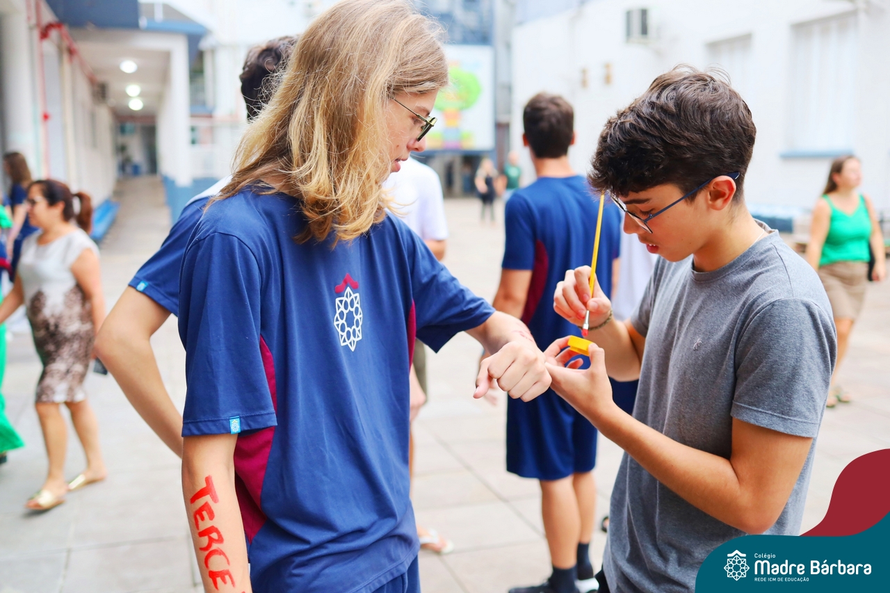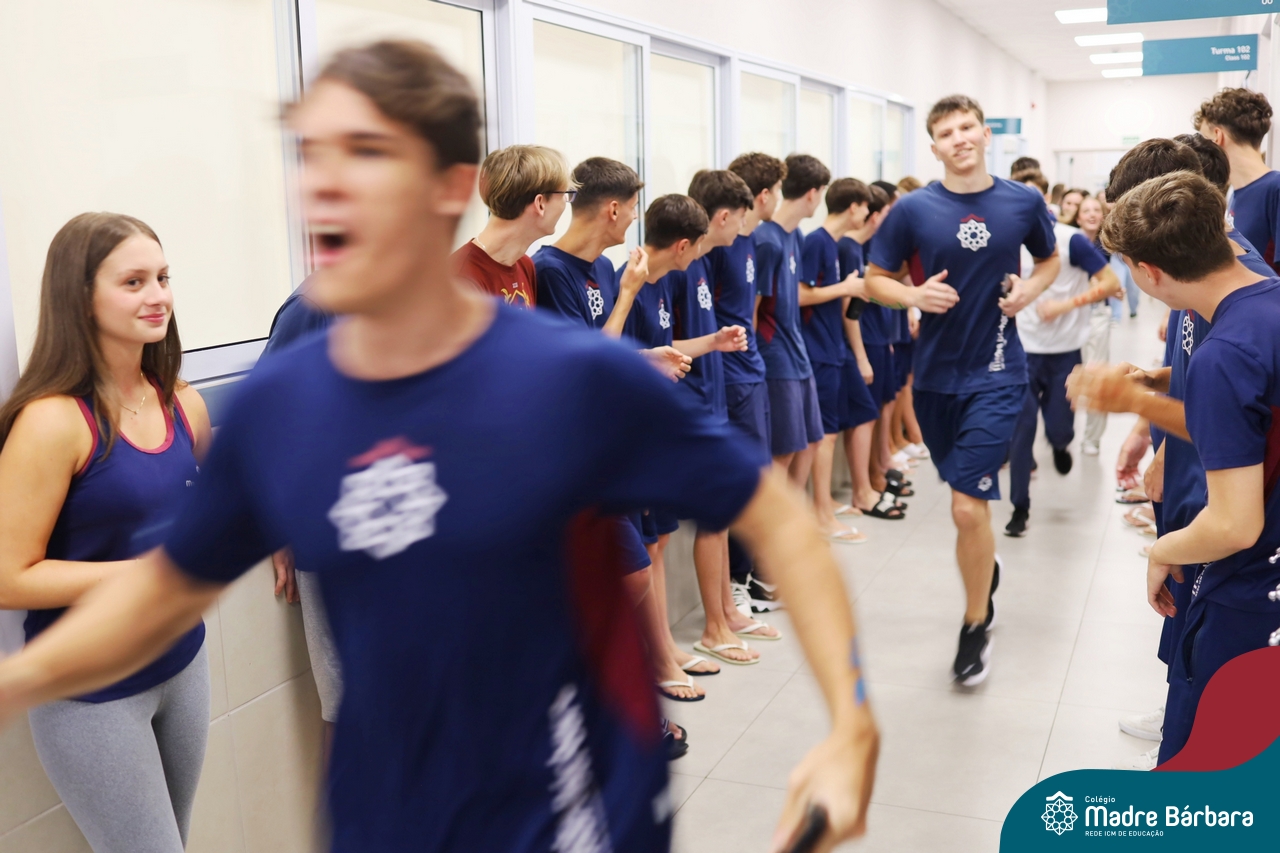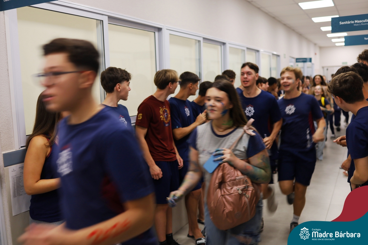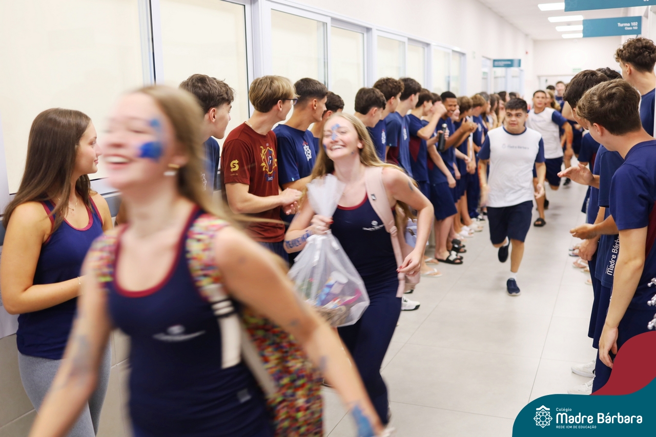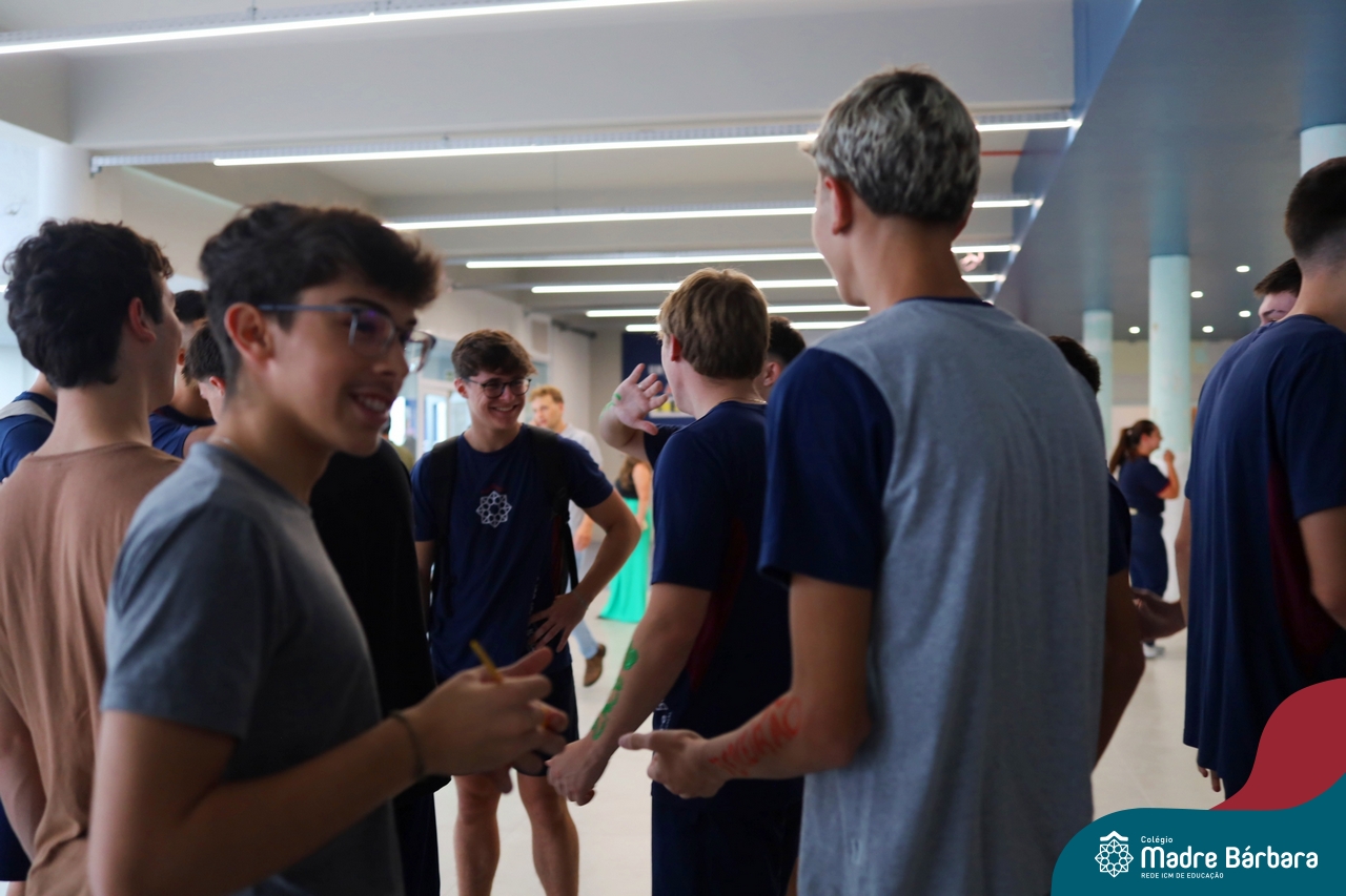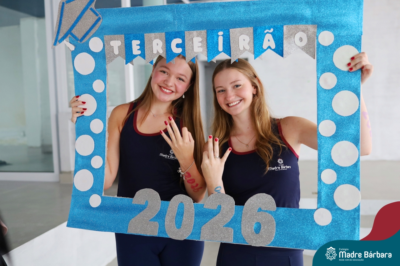 O Terceirão 2026 começou com uma programação de acolhida repleta de significado, integração e boas energias no Colégio Madre Bárbara – Rede ICM. Logo no início da manhã, as turmas 301 e 302 foram recebidas com entusiasmo pelo Grêmio Estudantil (Gembar) e por um grupo de estudantes que representou o Terceirão do ano passado. Em um gesto simbólico e cheio de carinho, mensagens de incentivo e boas energias foram escritas nos braços dos terceiranistas, marcando o começo de um ano que promete ser inesquecível.