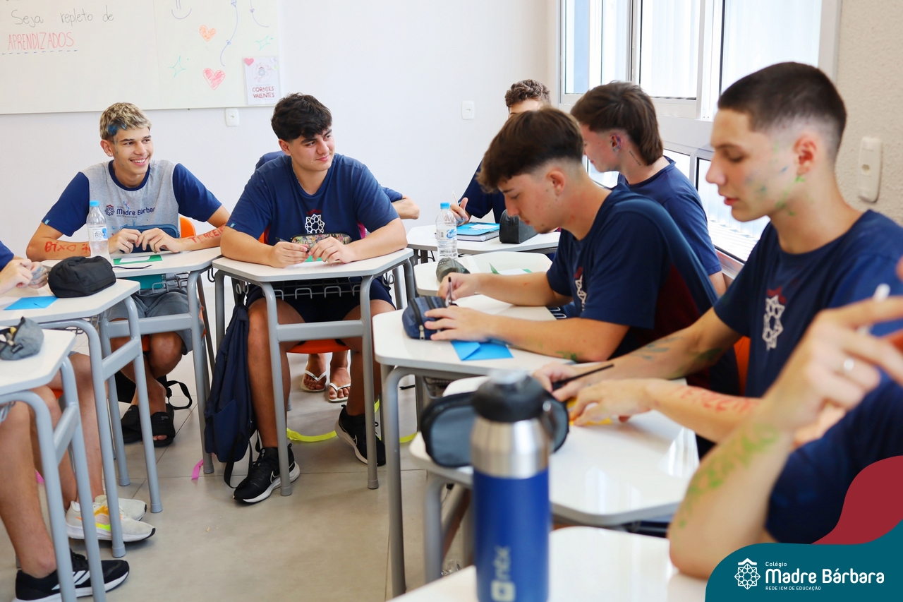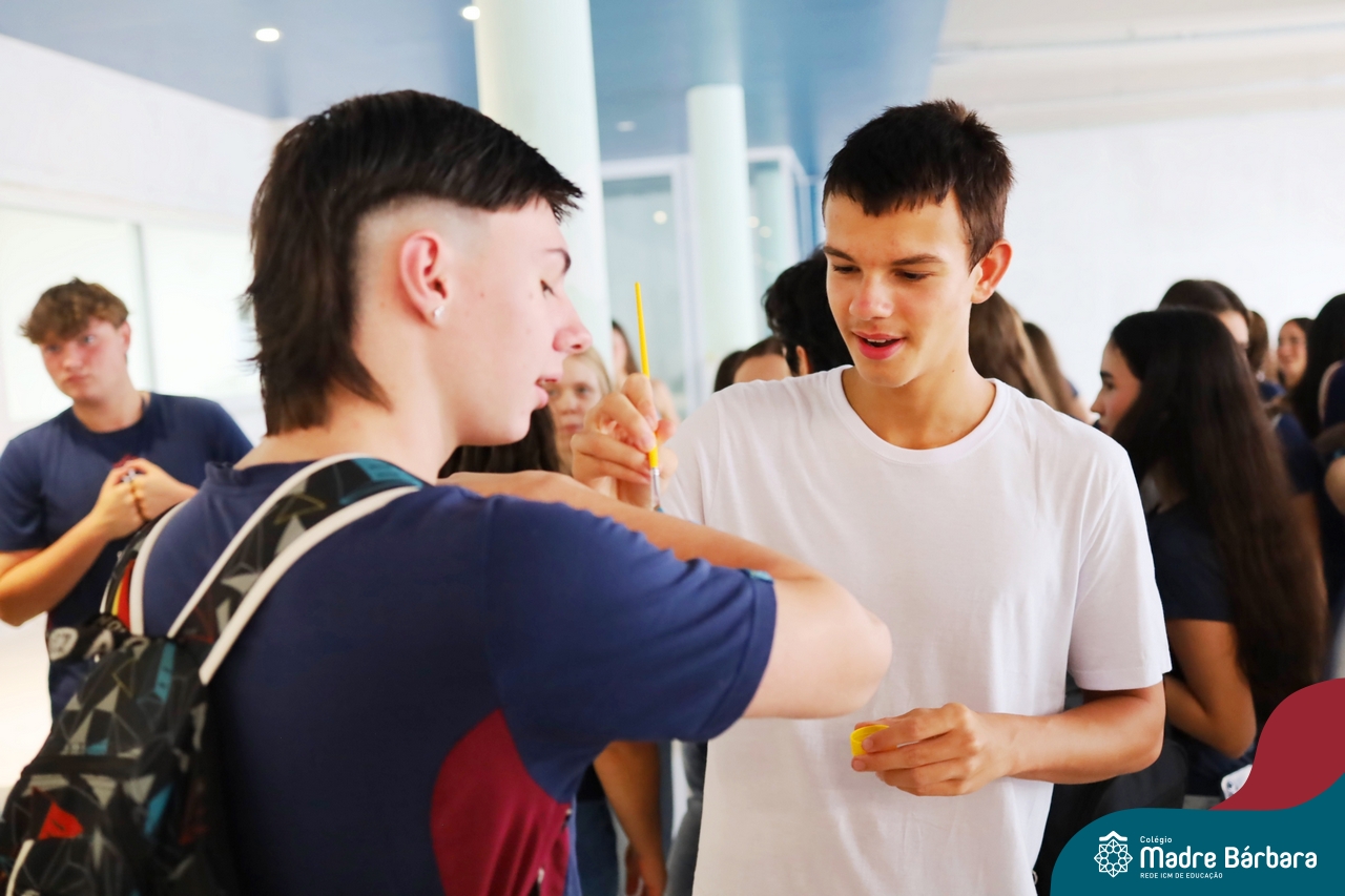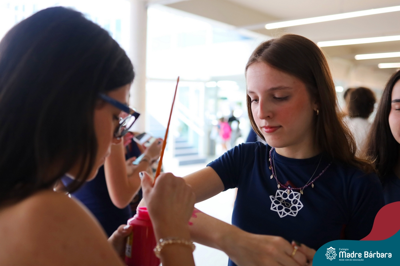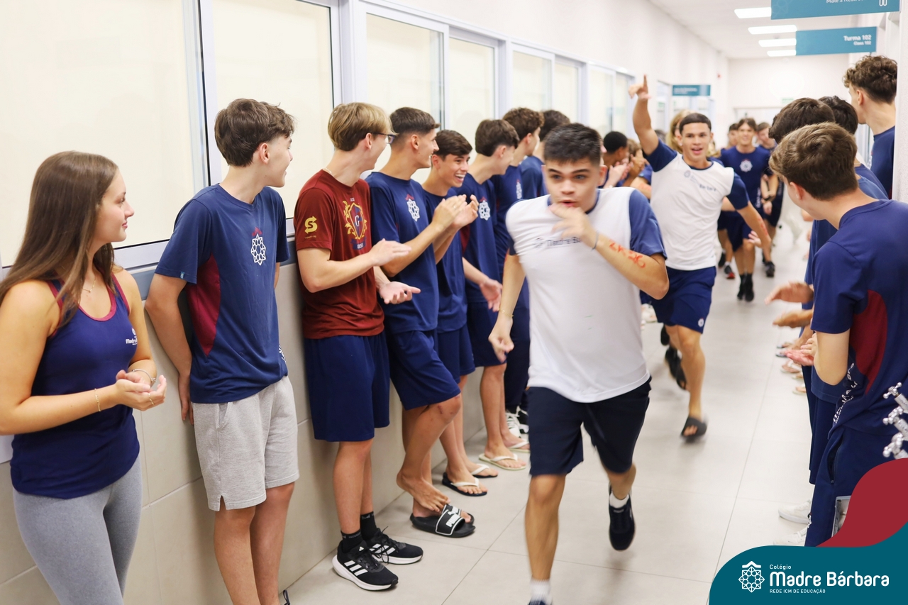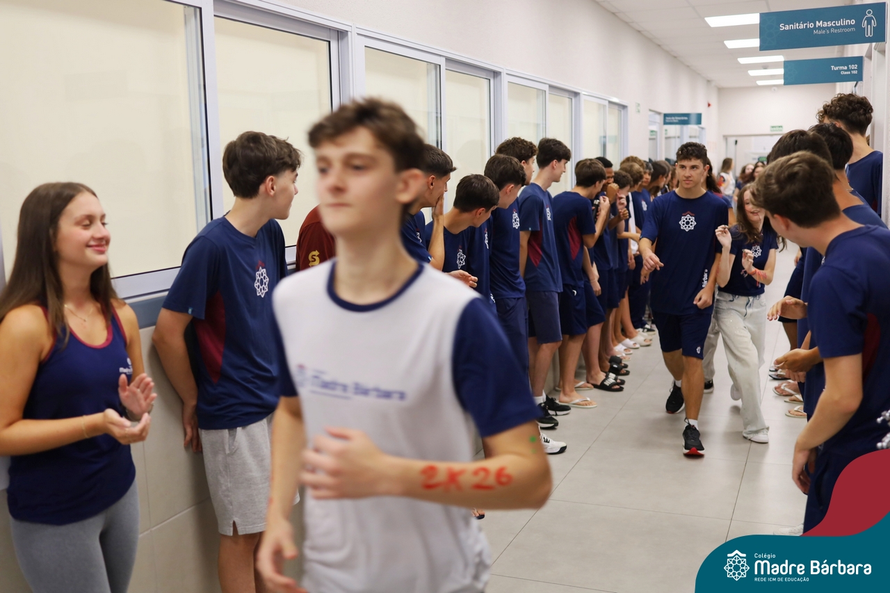 O Terceirão 2026 começou com uma programação de acolhida repleta de significado, integração e boas energias no Colégio Madre Bárbara – Rede ICM. Logo no início da manhã, as turmas 301 e 302 foram recebidas com entusiasmo pelo Grêmio Estudantil (Gembar) e por um grupo de estudantes que representou o Terceirão do ano passado. Em um gesto simbólico e cheio de carinho, mensagens de incentivo e boas energias foram escritas nos braços dos terceiranistas, marcando o começo de um ano que promete ser inesquecível.