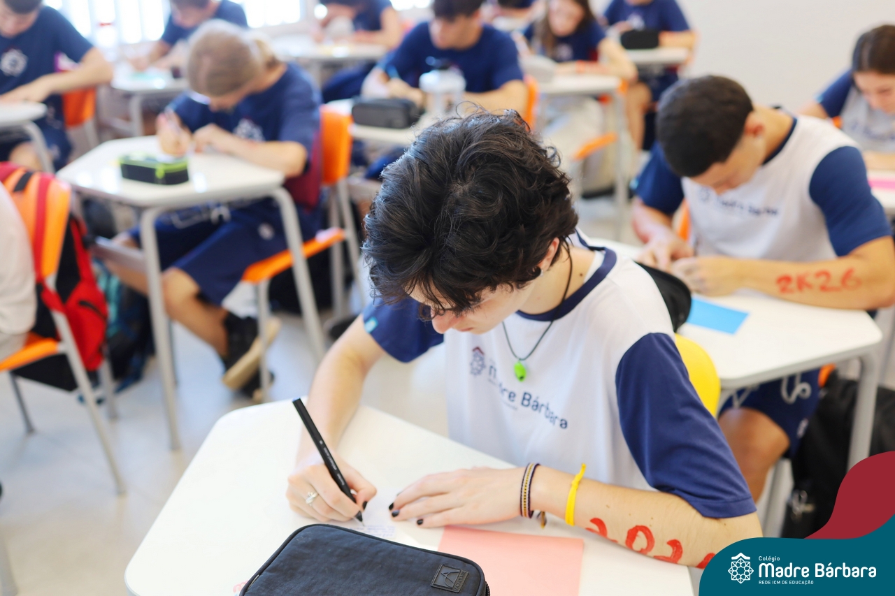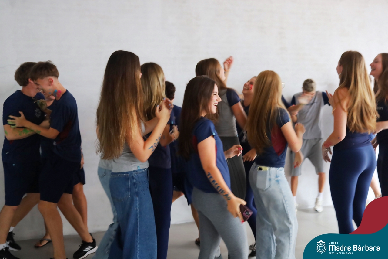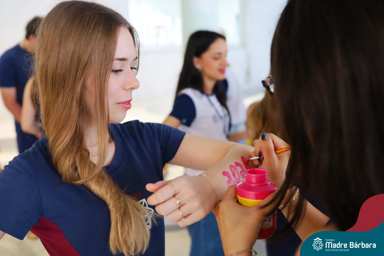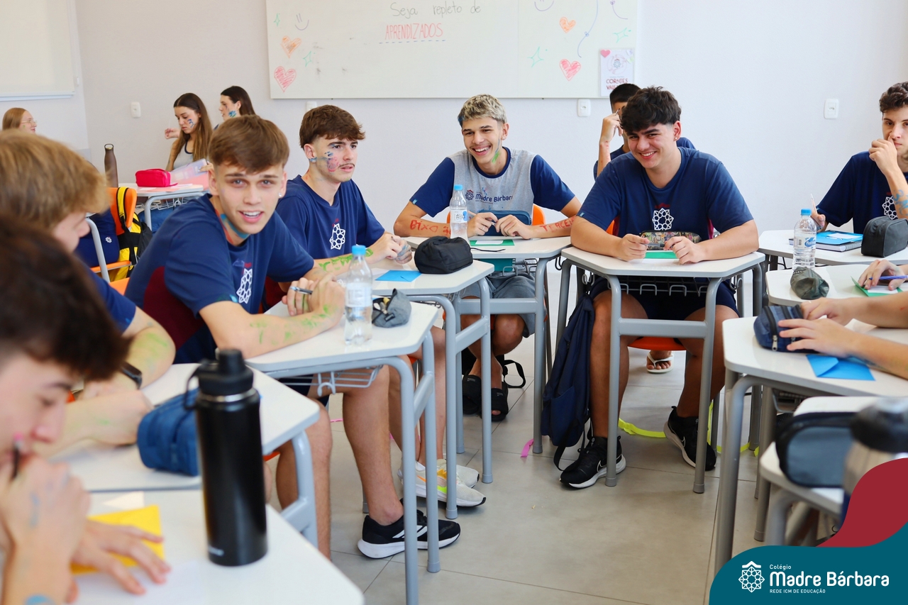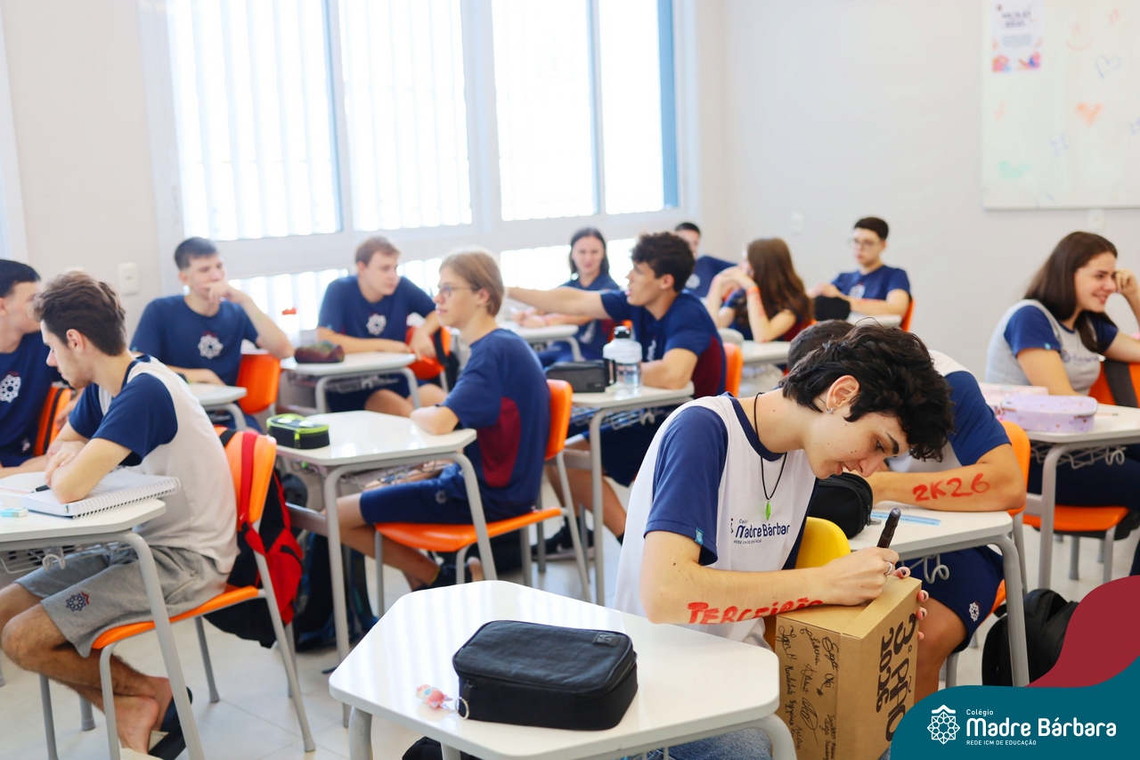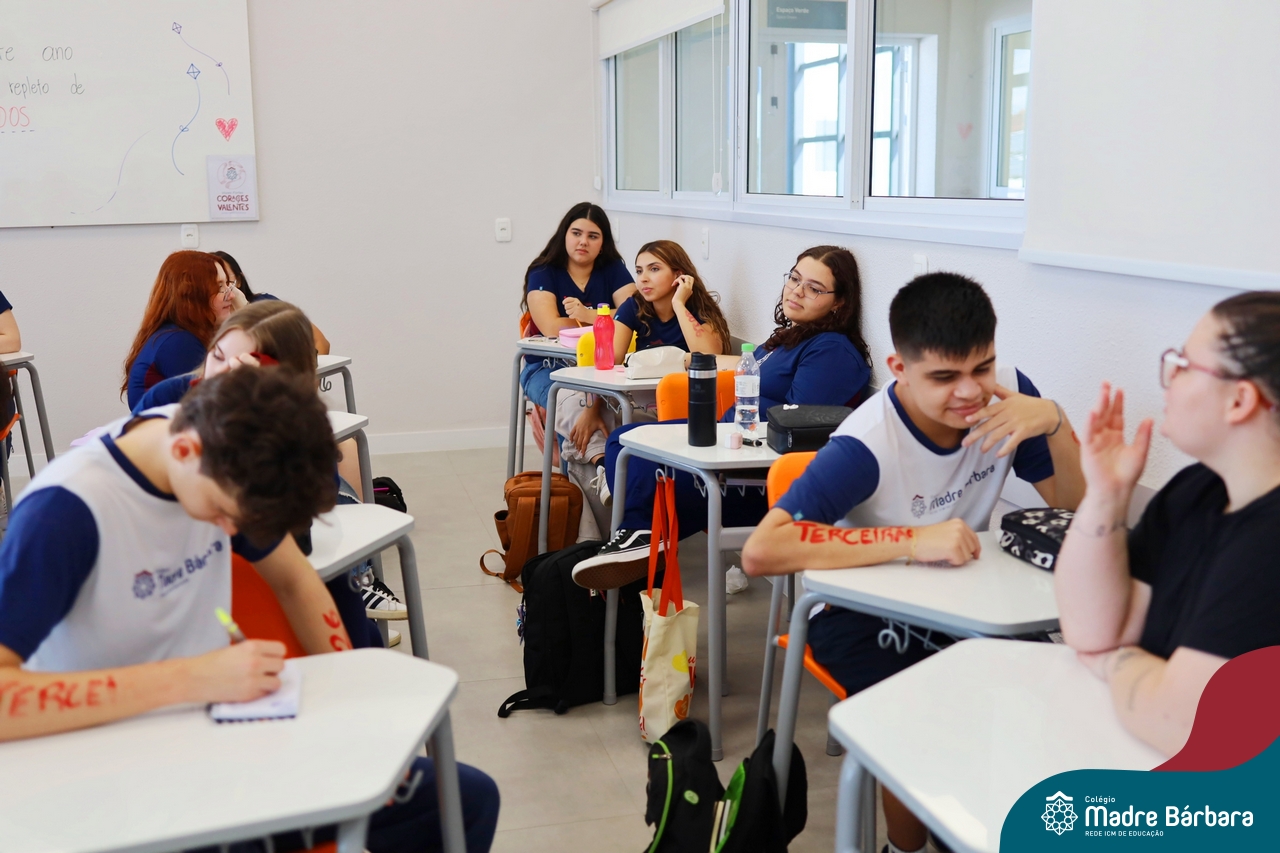 O Terceirão 2026 começou com uma programação de acolhida repleta de significado, integração e boas energias no Colégio Madre Bárbara – Rede ICM. Logo no início da manhã, as turmas 301 e 302 foram recebidas com entusiasmo pelo Grêmio Estudantil (Gembar) e por um grupo de estudantes que representou o Terceirão do ano passado. Em um gesto simbólico e cheio de carinho, mensagens de incentivo e boas energias foram escritas nos braços dos terceiranistas, marcando o começo de um ano que promete ser inesquecível.