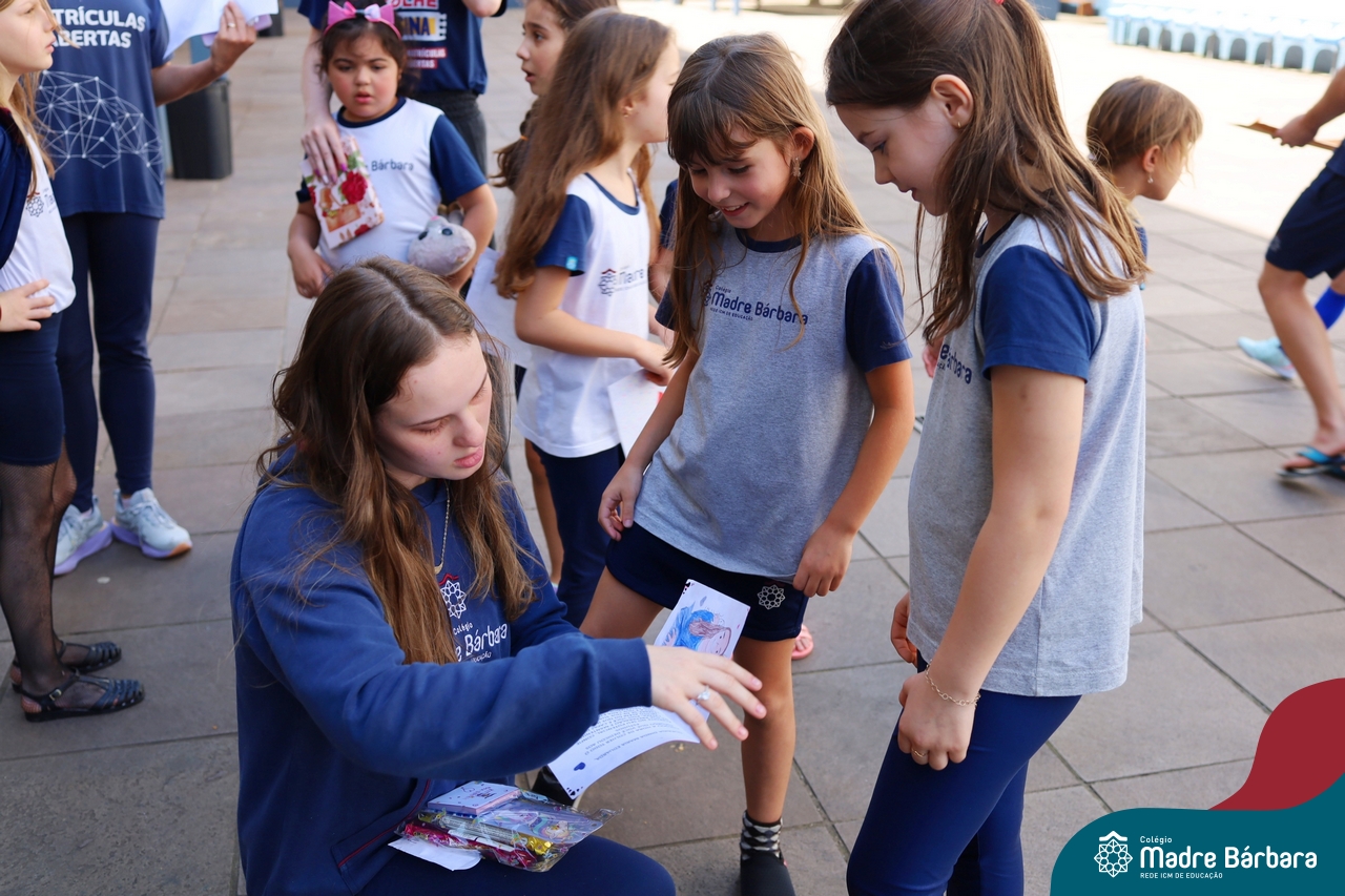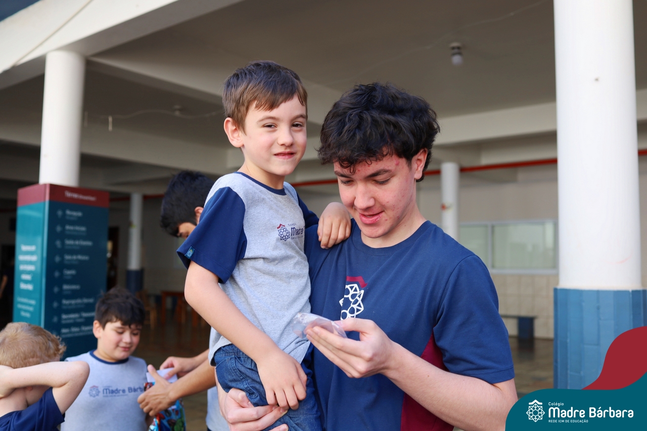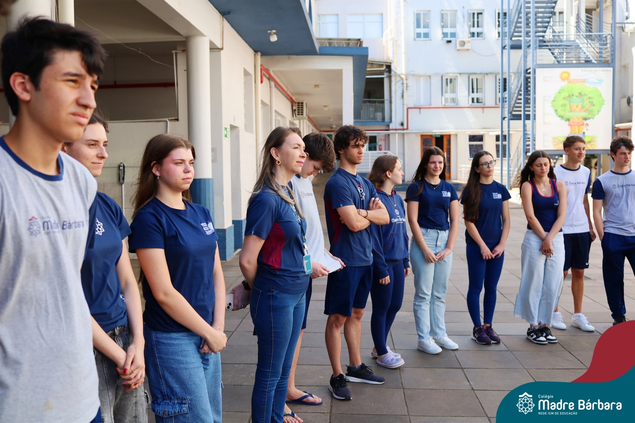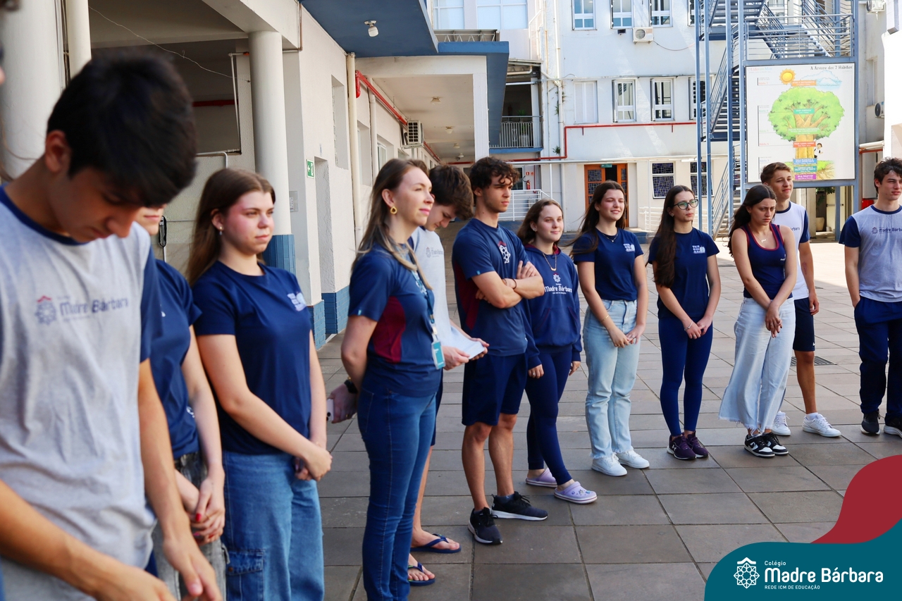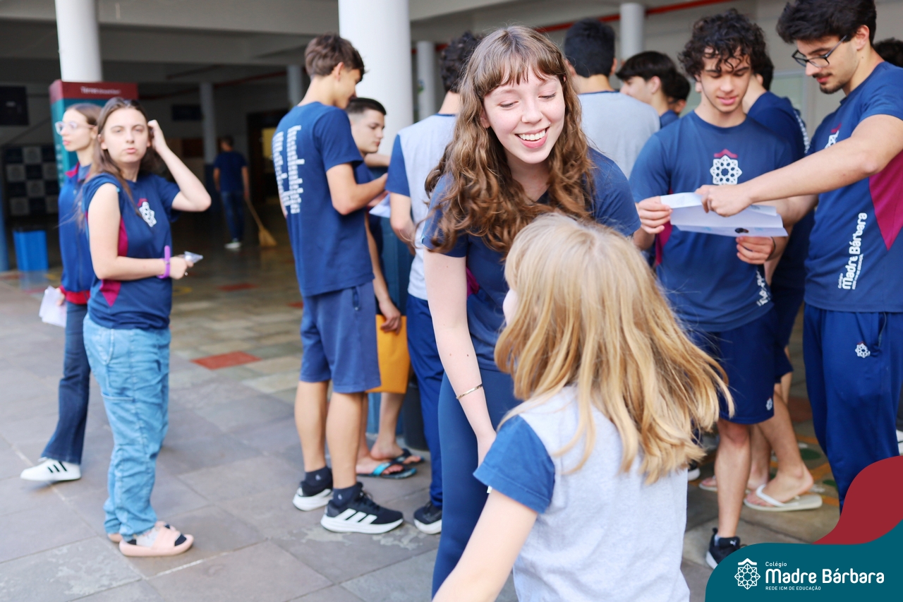 Nessa quarta-feira (05.11) os estudantes do Terceirão viveram um momento especial de acolhimento e preparação promovido pelo Serviço de Pastoral Escolar e pela Psicologia Escolar. Em clima de serenidade e esperança, partilharam palavras de carinho, conforto e fé, fortalecendo corações e mentes para os desafios do ENEM, prova que ocorre nos próximos finais de semana, dias 9 e 16. As crianças do Projeto Laços Afetivos, os afilhados, emocionaram a todos com uma linda homenagem musical, guiadas pela professora Tainá Dullius. Além do canto cheio de ternura, entregaram cartinhas repletas de boas energias, mimos, chocolates e canetas, acompanhados de gestos de incentivo e amor. O encontro também foi abençoado com a entrega de um terço, símbolo de proteção e luz, ofertado pela Pastoral e Psicologia, para acompanhar os estudantes durante as provas e em cada passo de sua caminhada. Também receberam sementes de girassol que simboliza o início de um caminho, o nascimento de sonhos e a capacidade de florescer mesmo diante dos desafios.