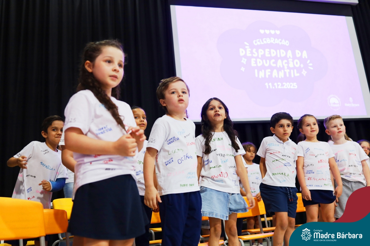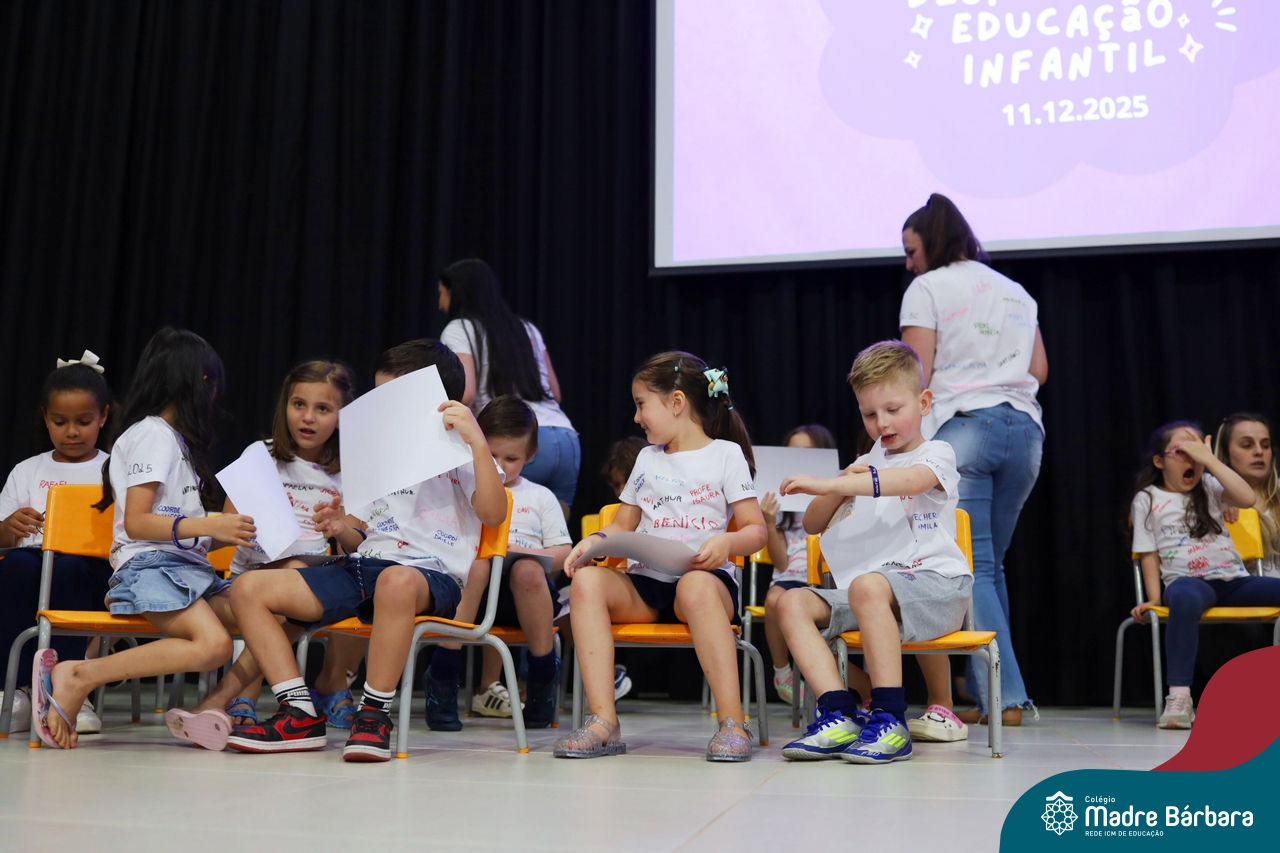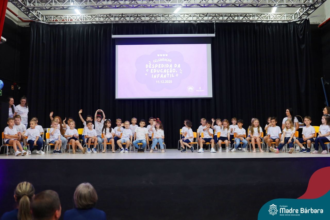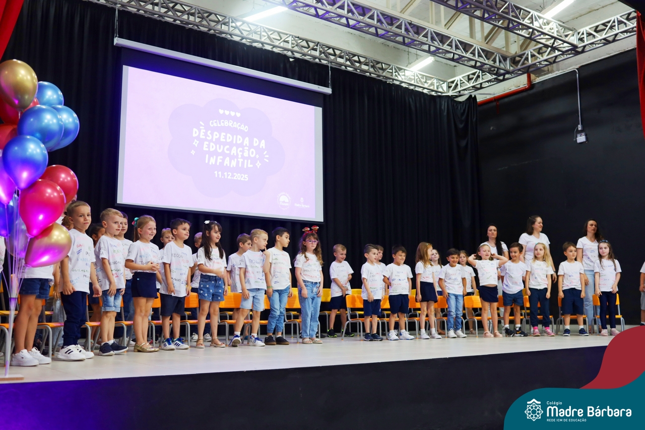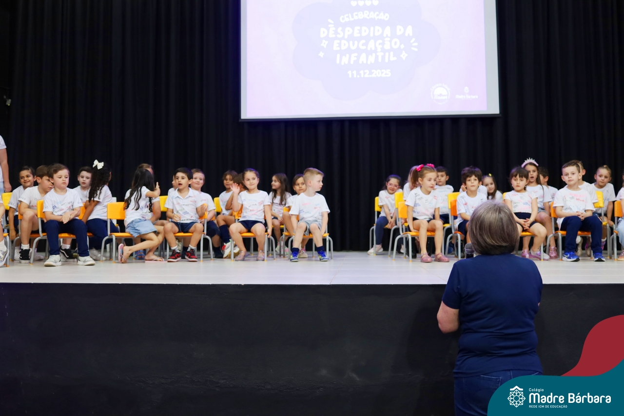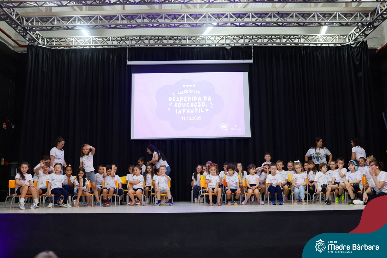 O Colégio Madre Bárbara viveu, na noite de quinta-feira (11/12), um momento de grande emoção e significado: o encerramento dos Níveis 5 da Educação Infantil. O evento, realizado no Salão de Eventos, reuniu famílias, professores e a equipe de coordenação para celebrar a trajetória das crianças e marcar a transição para uma nova etapa escolar. Durante a noite, as crianças encantaram a todos com lindas apresentações preparadas com carinho ao longo das últimas semanas. Foi um instante especial, em que cada gesto e sorriso revelava a alegria e o orgulho pelo caminho percorrido. Após as apresentações, os alunos receberam uma homenagem das professoras e da coordenação, que expressaram votos de felicidade e sucesso nessa nova jornada rumo aos 1ºs anos do Ensino Fundamental.