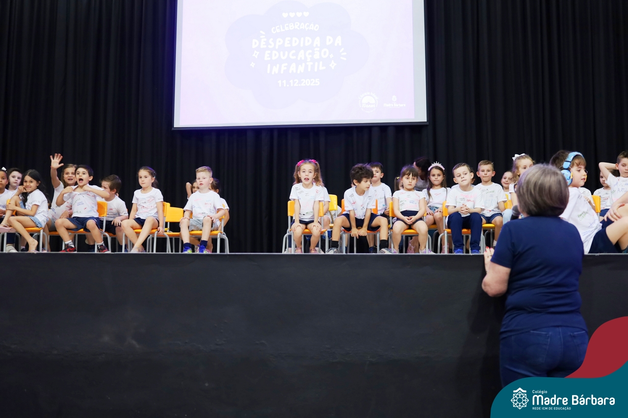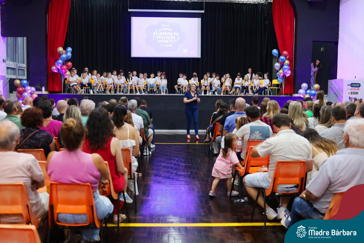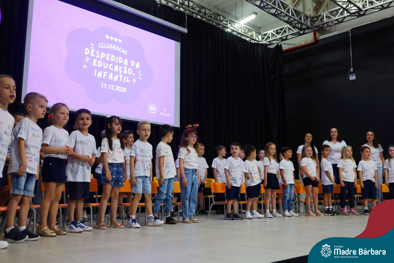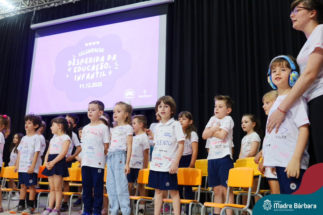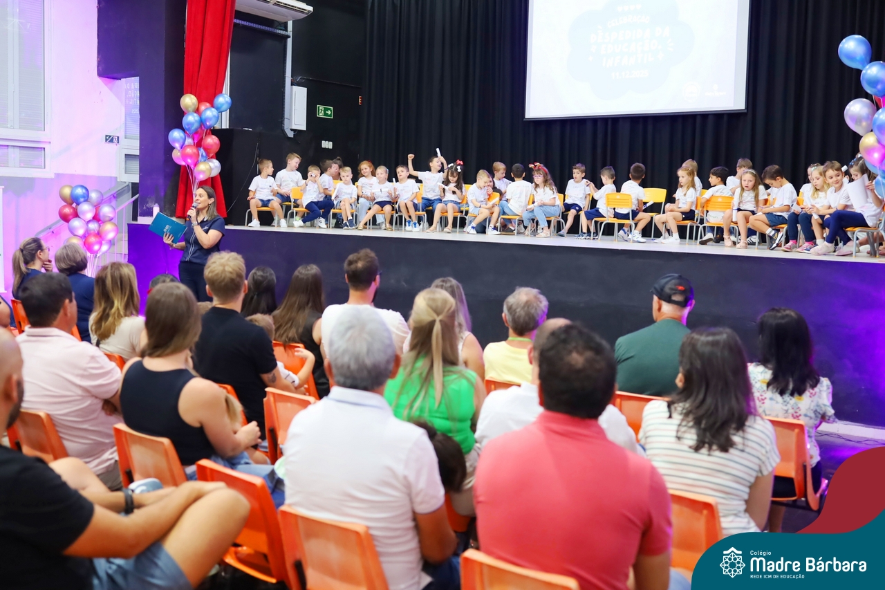 O Colégio Madre Bárbara viveu, na noite de quinta-feira (11/12), um momento de grande emoção e significado: o encerramento dos Níveis 5 da Educação Infantil. O evento, realizado no Salão de Eventos, reuniu famílias, professores e a equipe de coordenação para celebrar a trajetória das crianças e marcar a transição para uma nova etapa escolar. Durante a noite, as crianças encantaram a todos com lindas apresentações preparadas com carinho ao longo das últimas semanas. Foi um instante especial, em que cada gesto e sorriso revelava a alegria e o orgulho pelo caminho percorrido. Após as apresentações, os alunos receberam uma homenagem das professoras e da coordenação, que expressaram votos de felicidade e sucesso nessa nova jornada rumo aos 1ºs anos do Ensino Fundamental.
