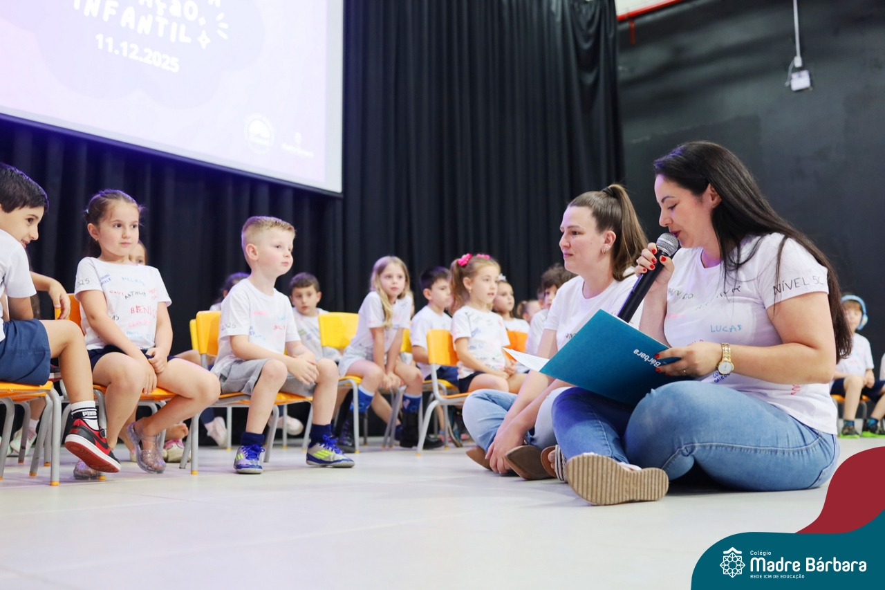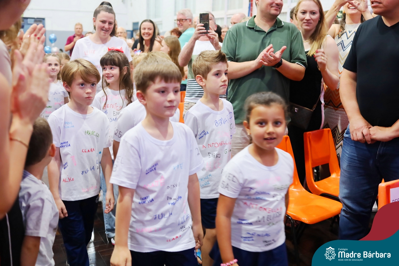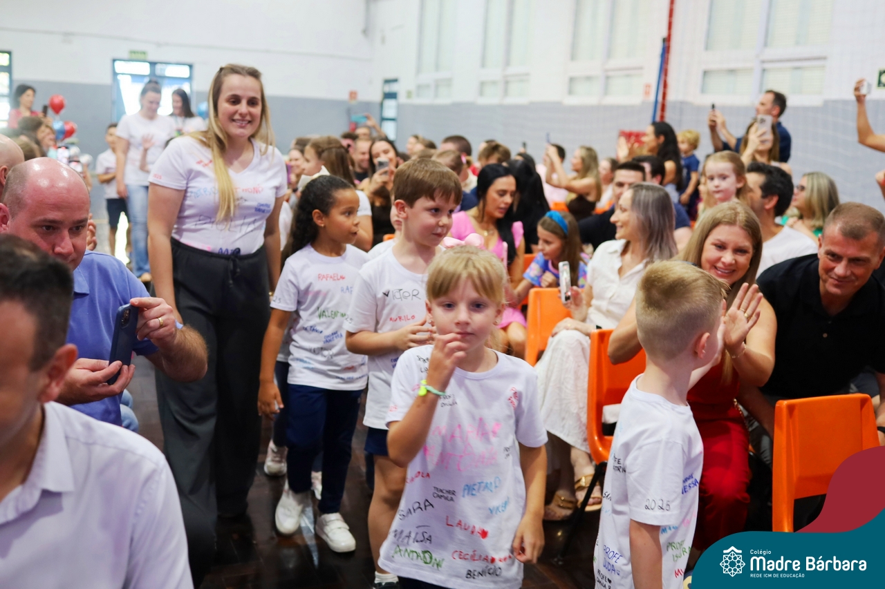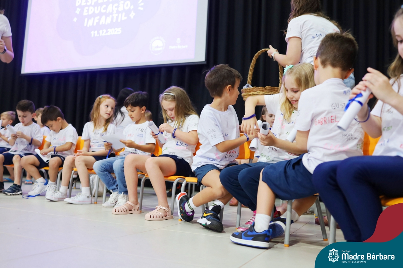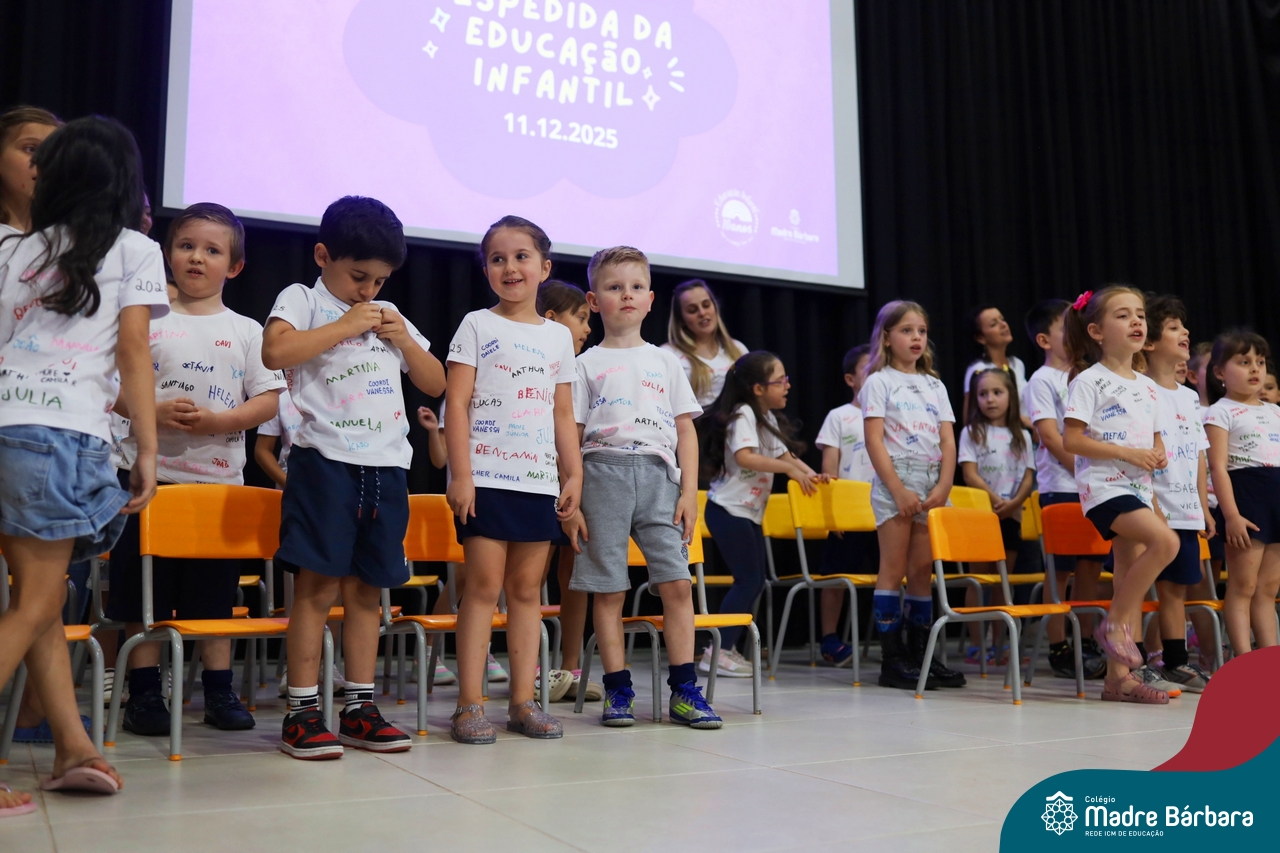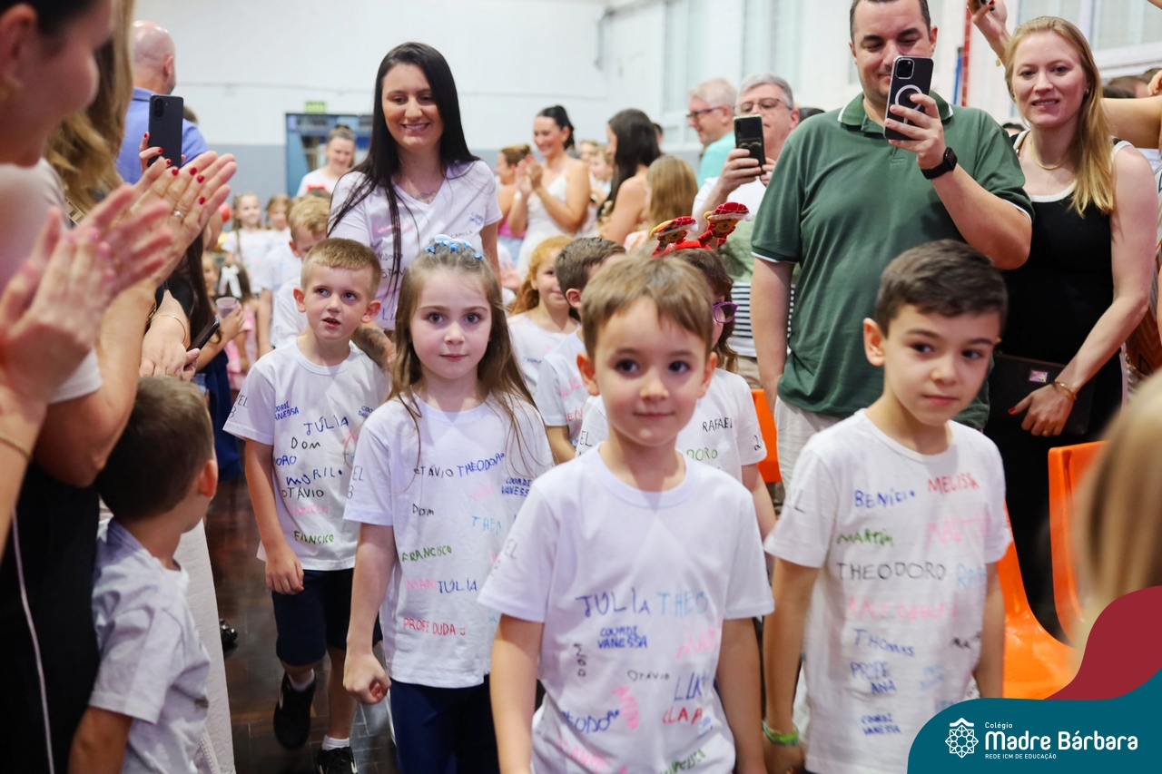O Colégio Madre Bárbara viveu, na noite de quinta-feira (11/12), um momento de grande emoção e significado: o encerramento dos Níveis 5 da Educação Infantil. O evento, realizado no Salão de Eventos, reuniu famílias, professores e a equipe de coordenação para celebrar a trajetória das crianças e marcar a transição para uma nova etapa escolar. Durante a noite, as crianças encantaram a todos com lindas apresentações preparadas com carinho ao longo das últimas semanas. Foi um instante especial, em que cada gesto e sorriso revelava a alegria e o orgulho pelo caminho percorrido. Após as apresentações, os alunos receberam uma homenagem das professoras e da coordenação, que expressaram votos de felicidade e sucesso nessa nova jornada rumo aos 1ºs anos do Ensino Fundamental.