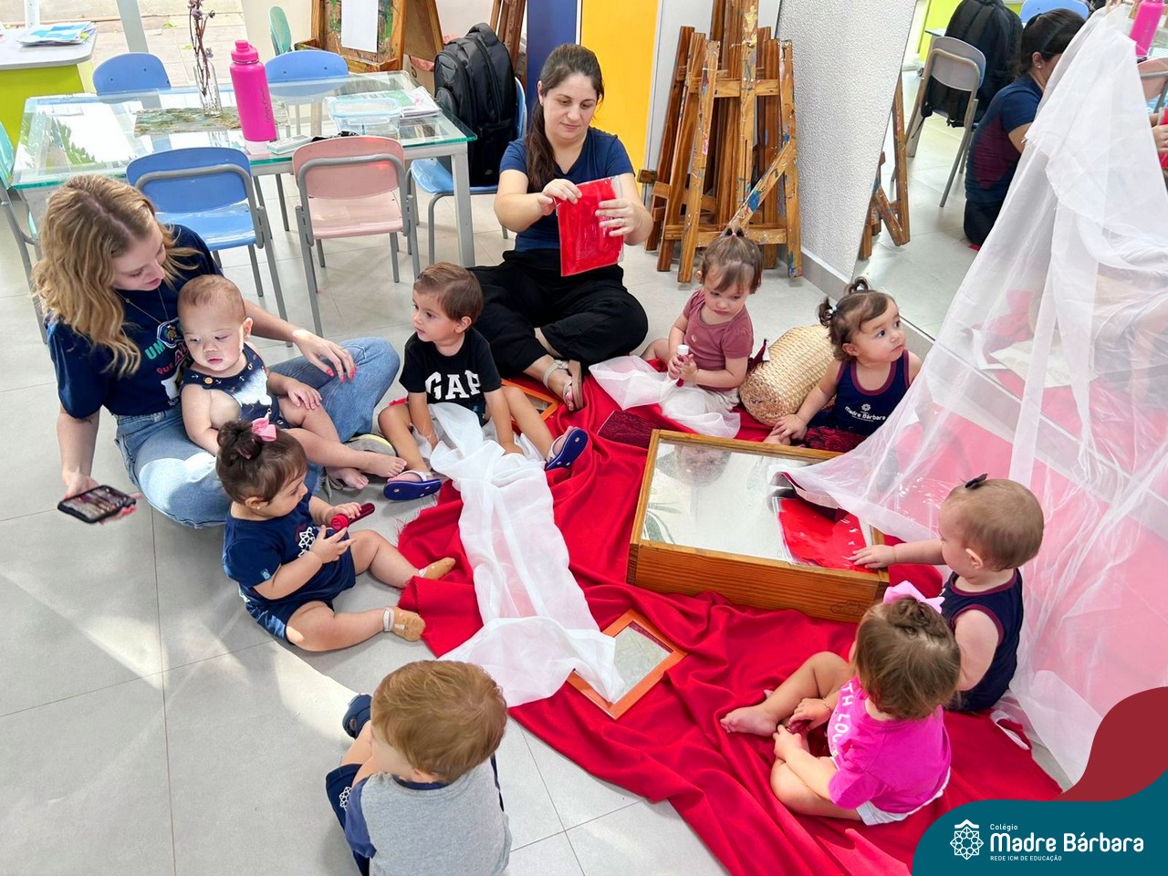 Na tarde do dia 16, as crianças do Nível 1B, acompanhadas das professoras e da atelierista Camila, tiveram a sua primeira vivência no Ateliê do colégio. Dentro do projeto da educação infantil: “Marcas na infância: memórias que ficam!” foi proposto um momento com tecidos, como primeiros indícios do grafismo. A sessão contou com tecidos de diferentes texturas, espelhos, tubos com líquidos e saquinhos zip lock com tinta dentro para marcar os gestos.