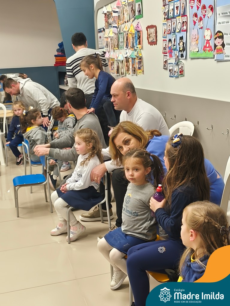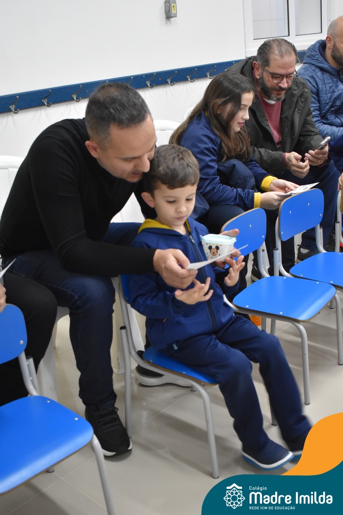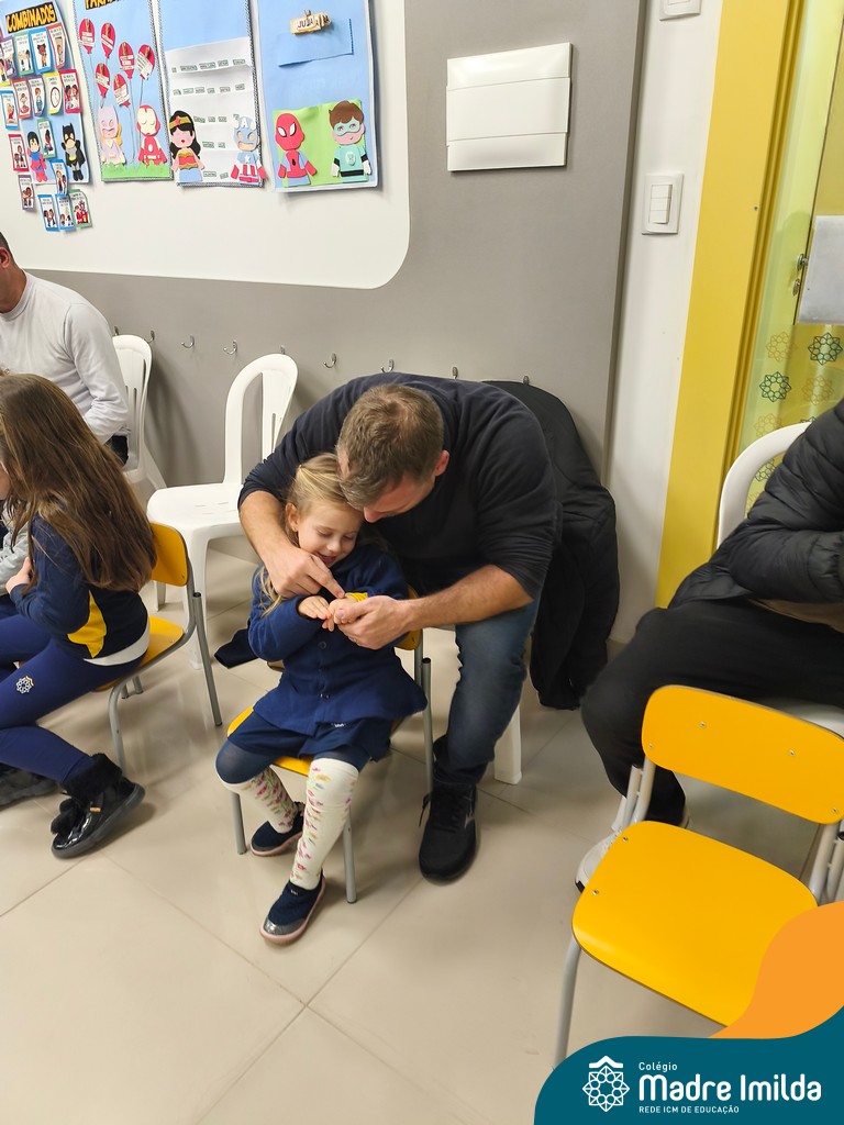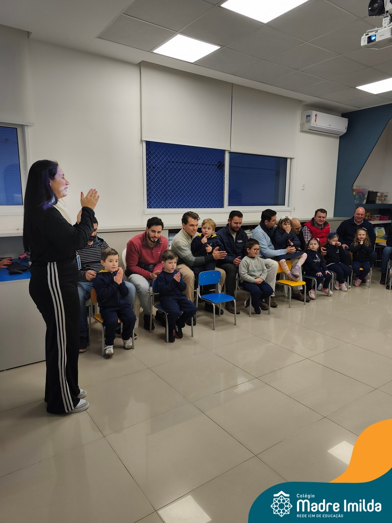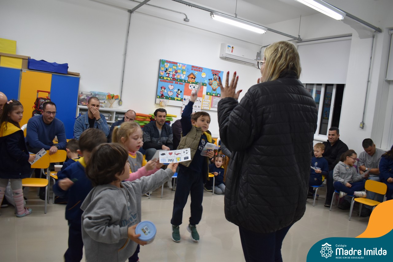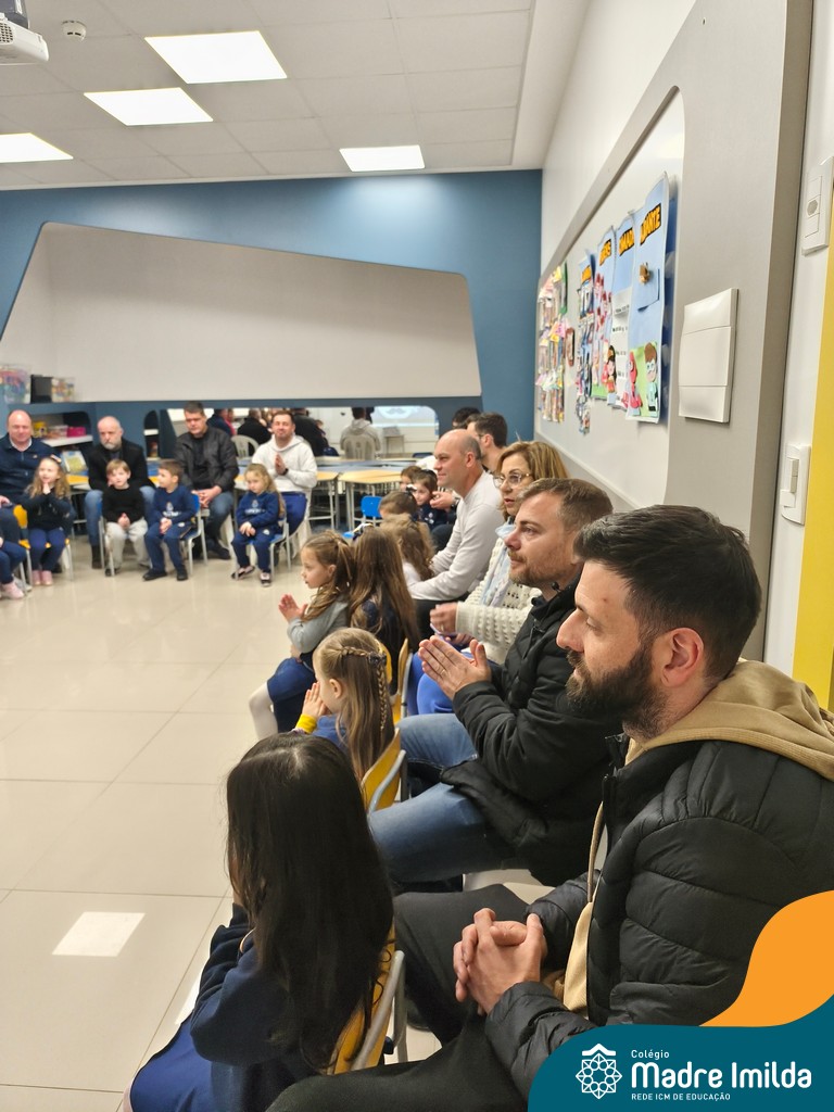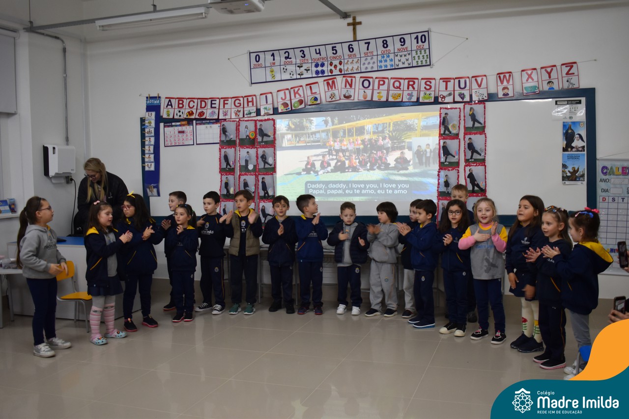 A celebração teve início com apresentações musicais em português e inglês, nas quais os alunos emocionaram os pais com canções repletas de ternura. Em seguida, os pequenos participaram de uma contação de história conduzida pela professora, despertando a imaginação e criando um clima de escuta e encantamento.