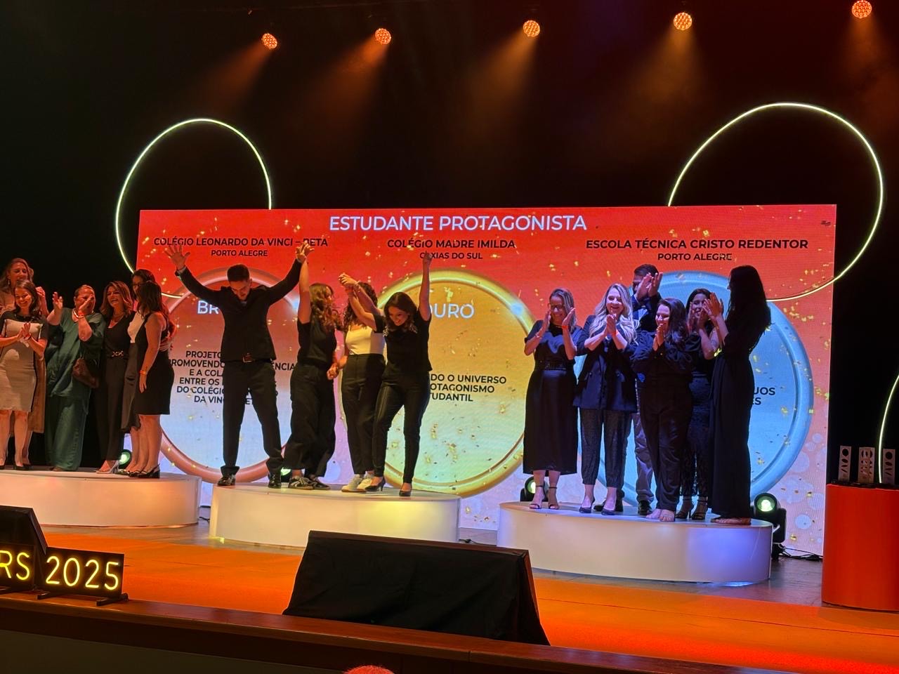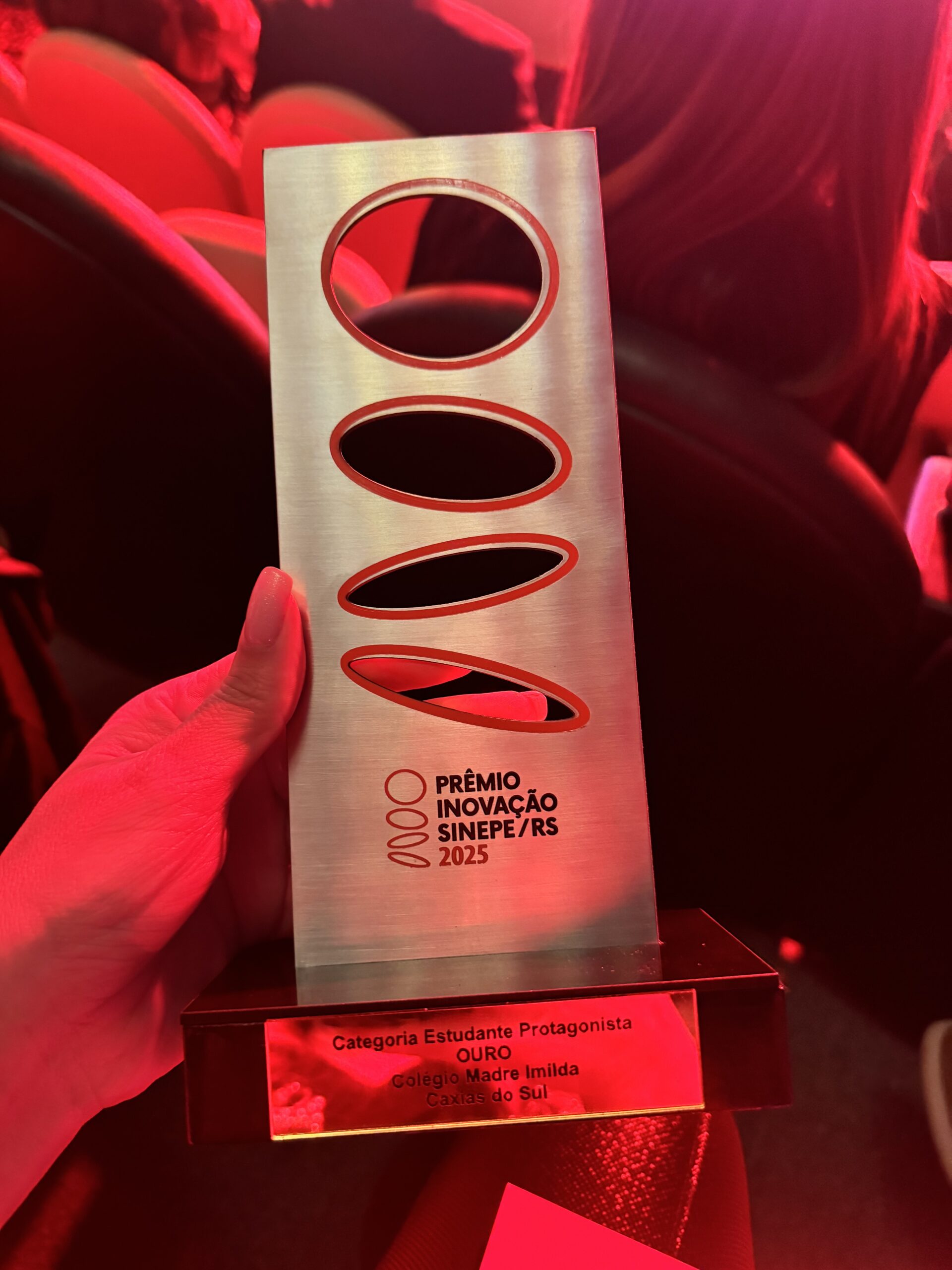 O Colégio Madre Imilda, de Caxias do Sul, conquistou o Troféu Ouro na categoria Estudante Protagonista do Prêmio Inovação SINEPE/RS 2025, promovido pelo Sindicato do Ensino Privado do Rio Grande do Sul. O resultado foi anunciado na noite desta sexta-feira (05/12), durante cerimônia realizada no Teatro do Prédio 40 da PUCRS, em Porto Alegre. A instituição caxiense garantiu o primeiro lugar com o projeto “Explorando o universo com protagonismo estudantil”, que disputou a categoria ao lado dos projetos Transformação de resíduos pesqueiros em soluções sustentáveis (Prata), da Escola Técnica Cristo Redentor (Porto Alegre), e Mediação: Promovendo a convivência e a colaboração entre os estudantes do Colégio Leonardo Da Vinci Beta (Bronze), de Porto Alegre.