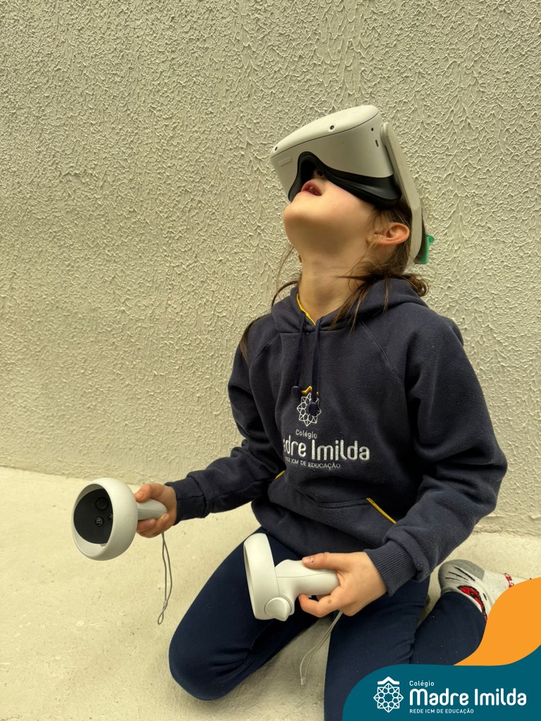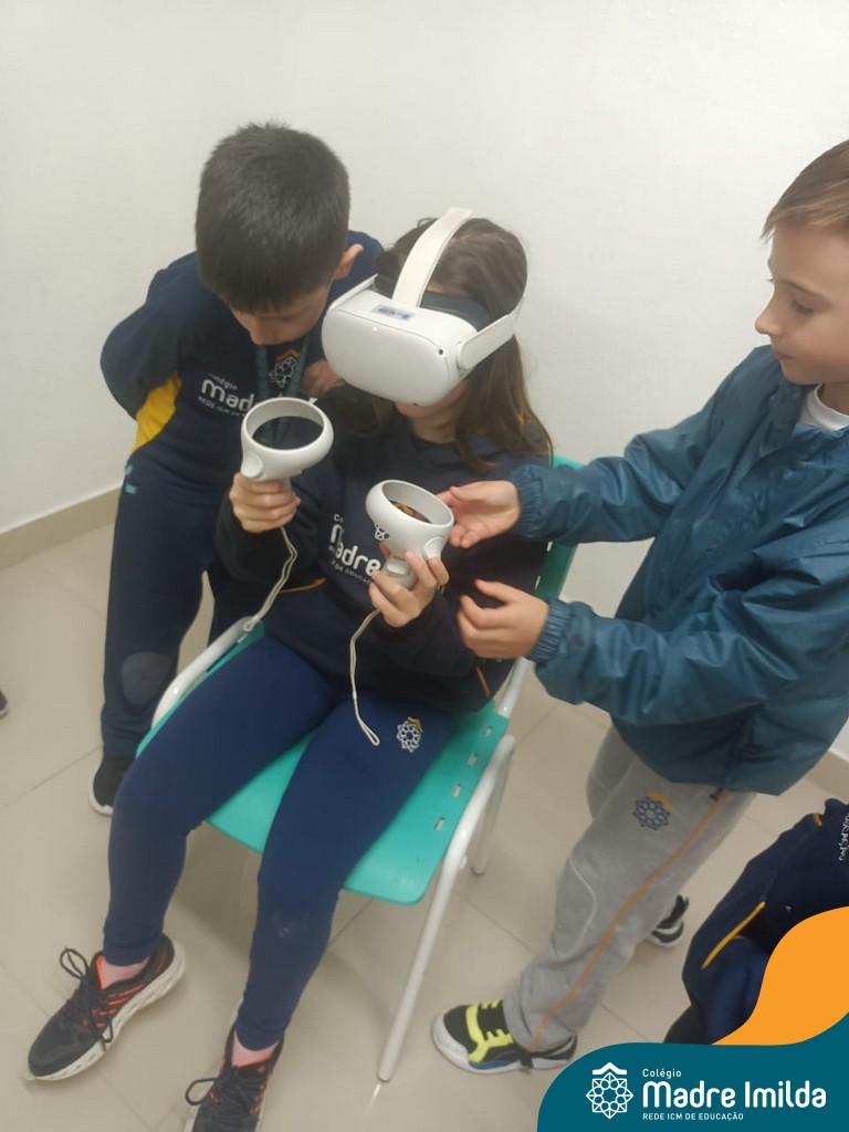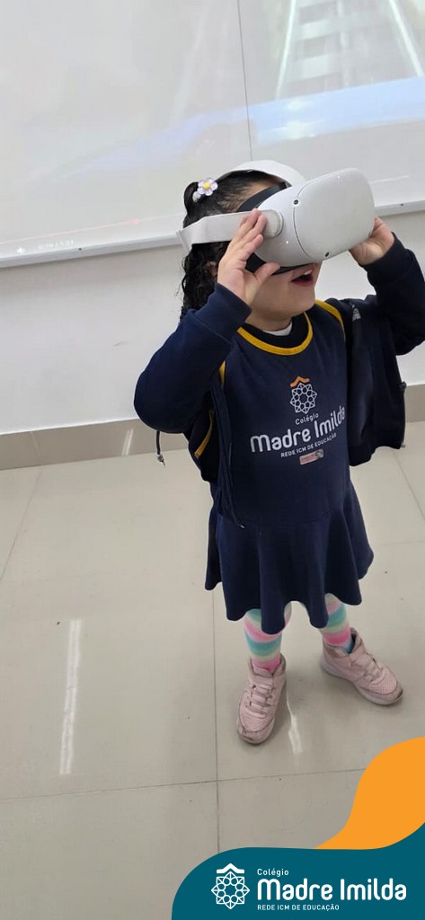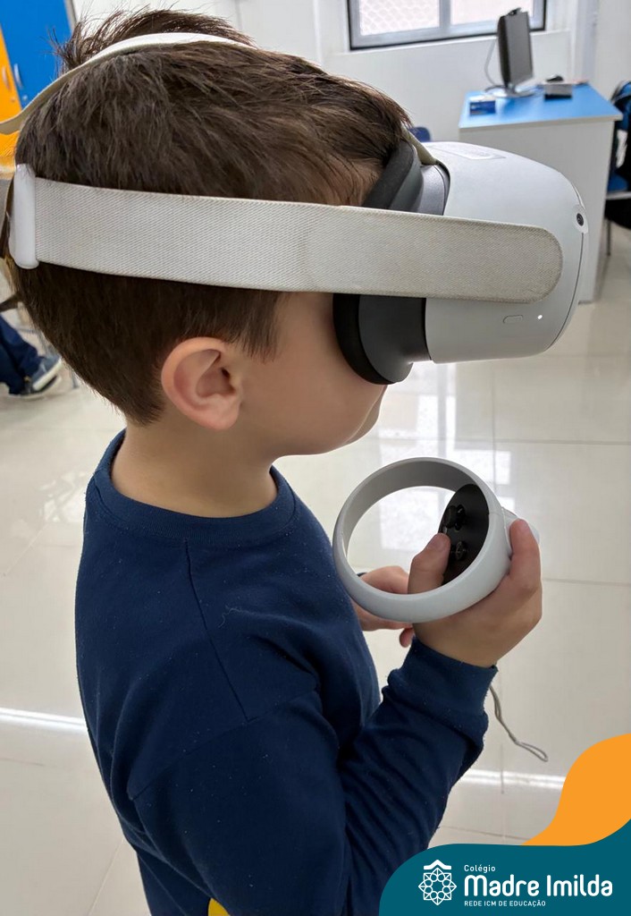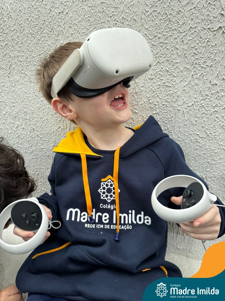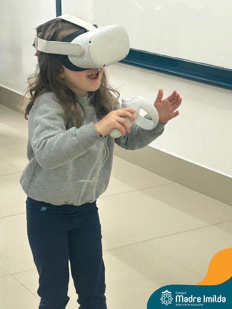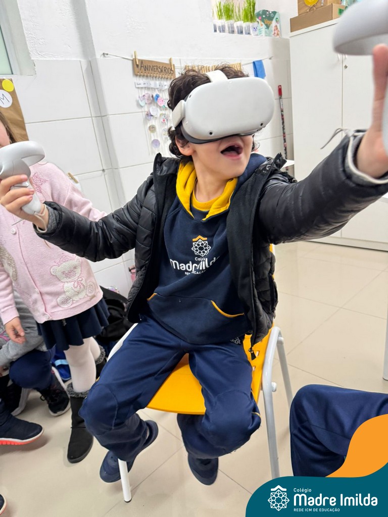 As atividades de Inglês, vôlei e brincadeiras coletivas fortalecem a comunicação, o trabalho em equipe e a coordenação motora. Já no Laboratório de Ciências, as experiências despertam a curiosidade natural das crianças: o “Dedo mágico”, o “Leite psicodélico”, a Areia Cinética, as reações químicas que formam gases e até o uso dos óculos de Realidade Virtual (VR) tornam o aprendizado algo vivo e encantador.