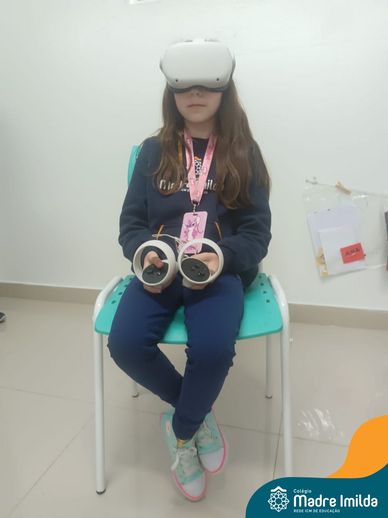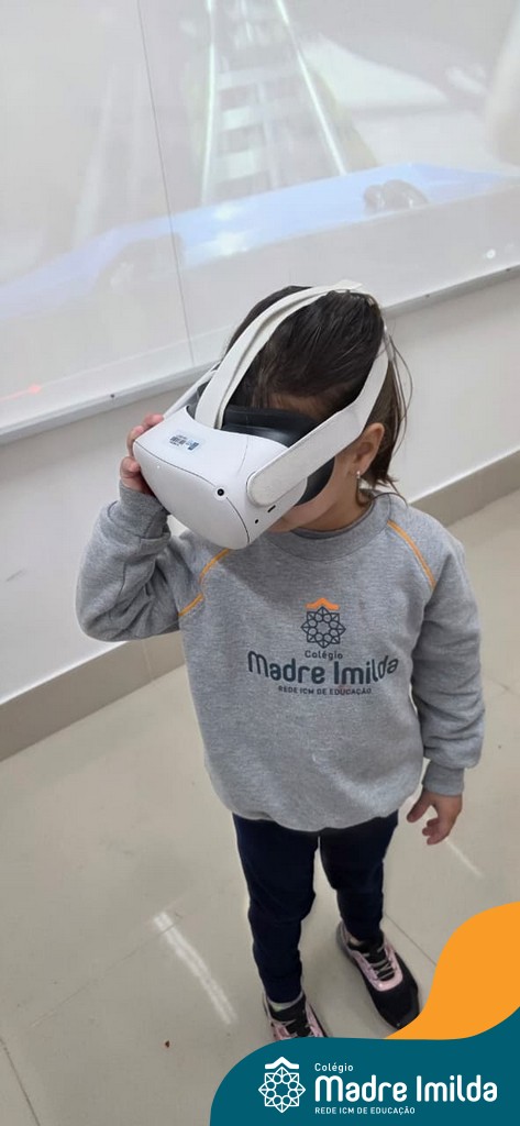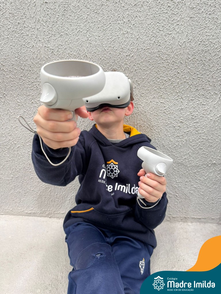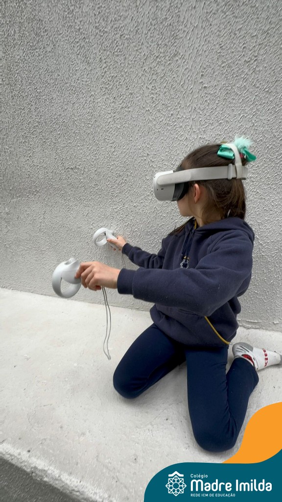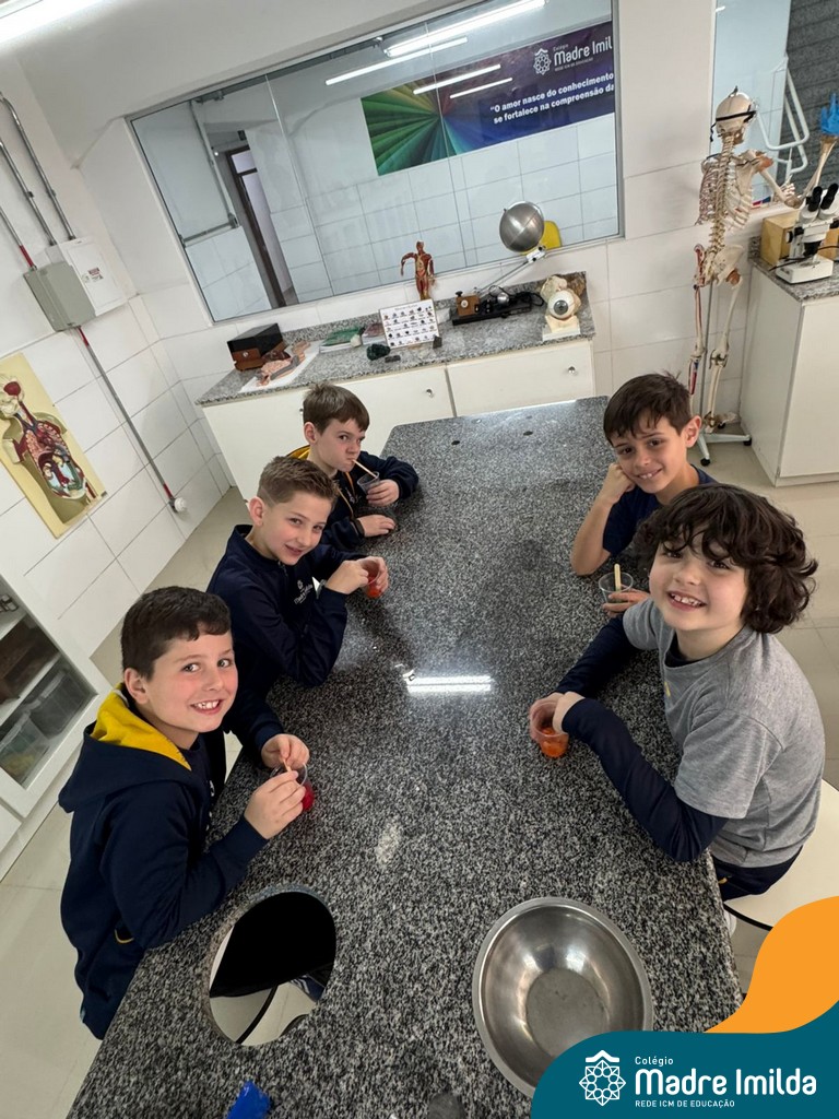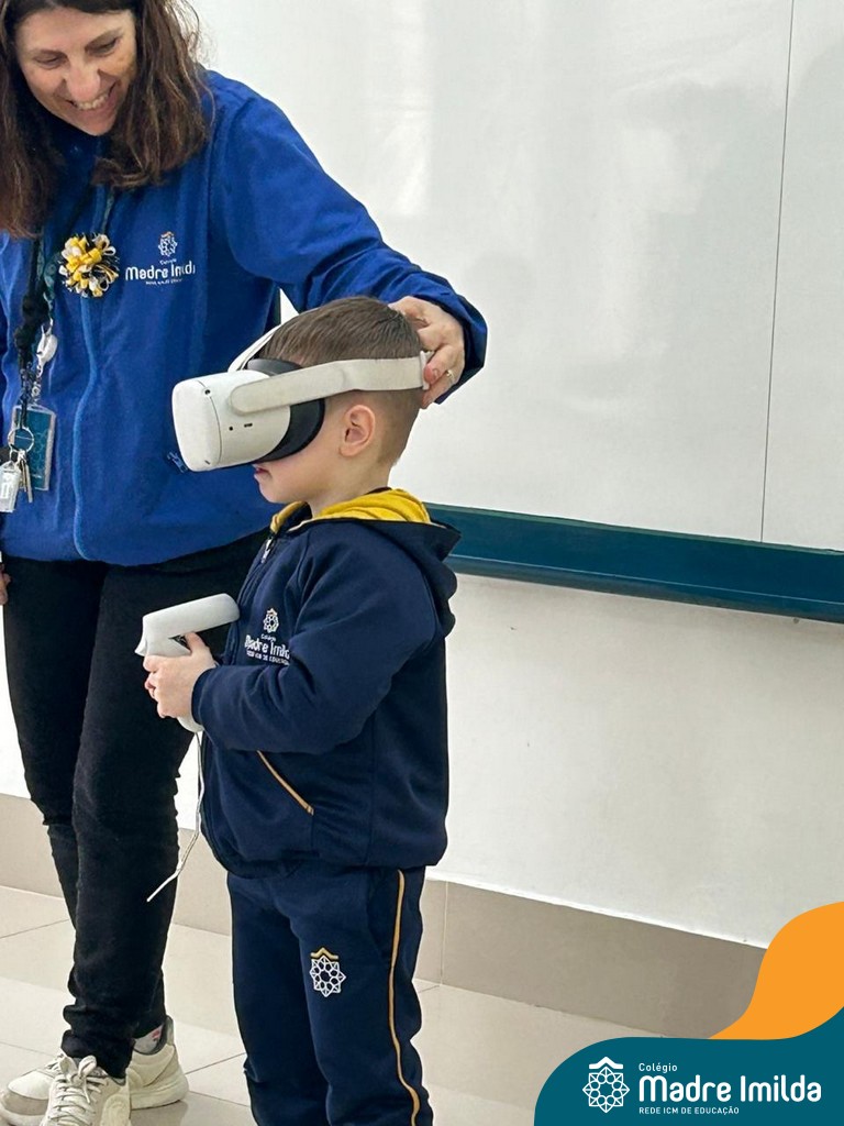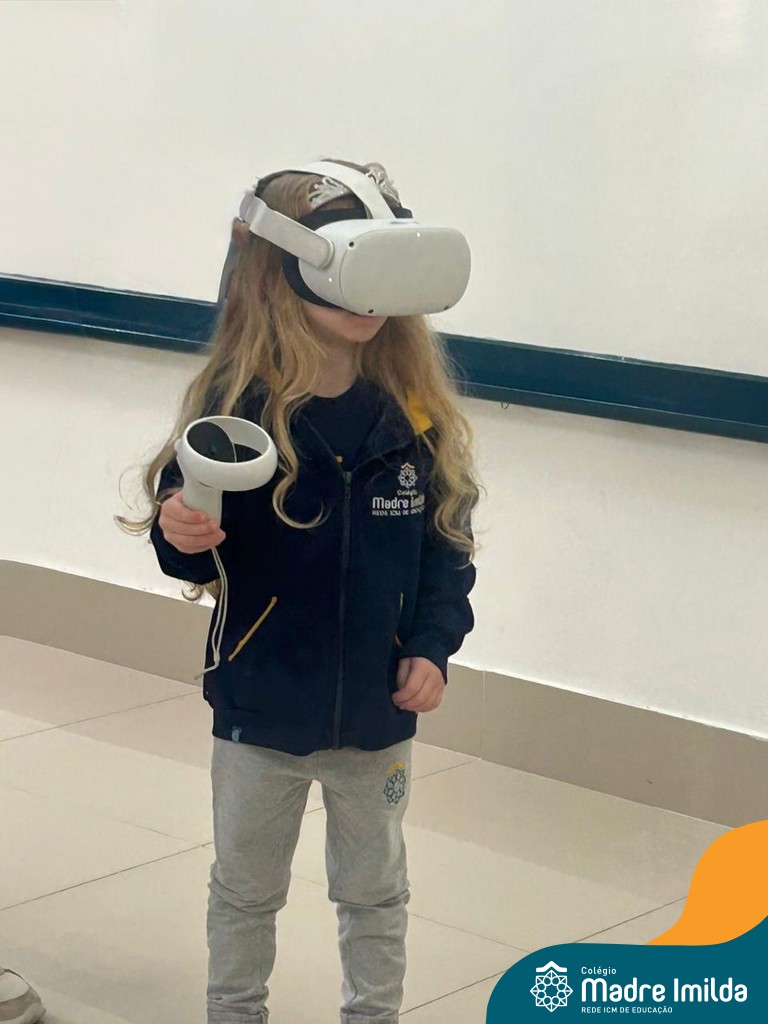 As atividades de Inglês, vôlei e brincadeiras coletivas fortalecem a comunicação, o trabalho em equipe e a coordenação motora. Já no Laboratório de Ciências, as experiências despertam a curiosidade natural das crianças: o “Dedo mágico”, o “Leite psicodélico”, a Areia Cinética, as reações químicas que formam gases e até o uso dos óculos de Realidade Virtual (VR) tornam o aprendizado algo vivo e encantador.