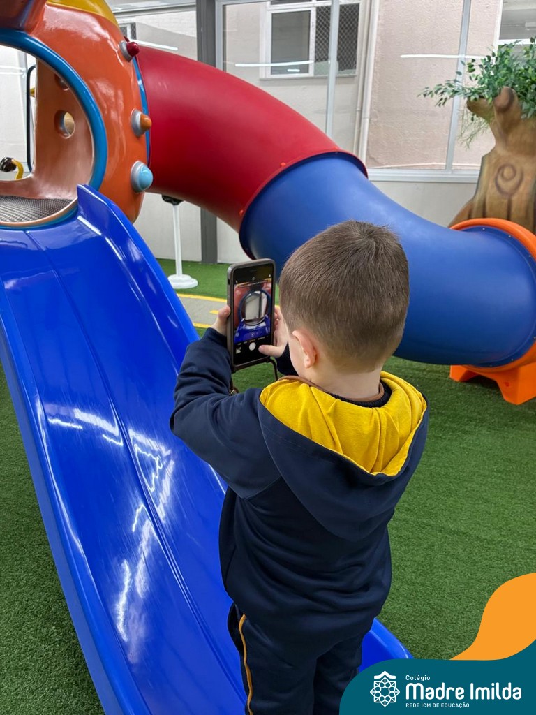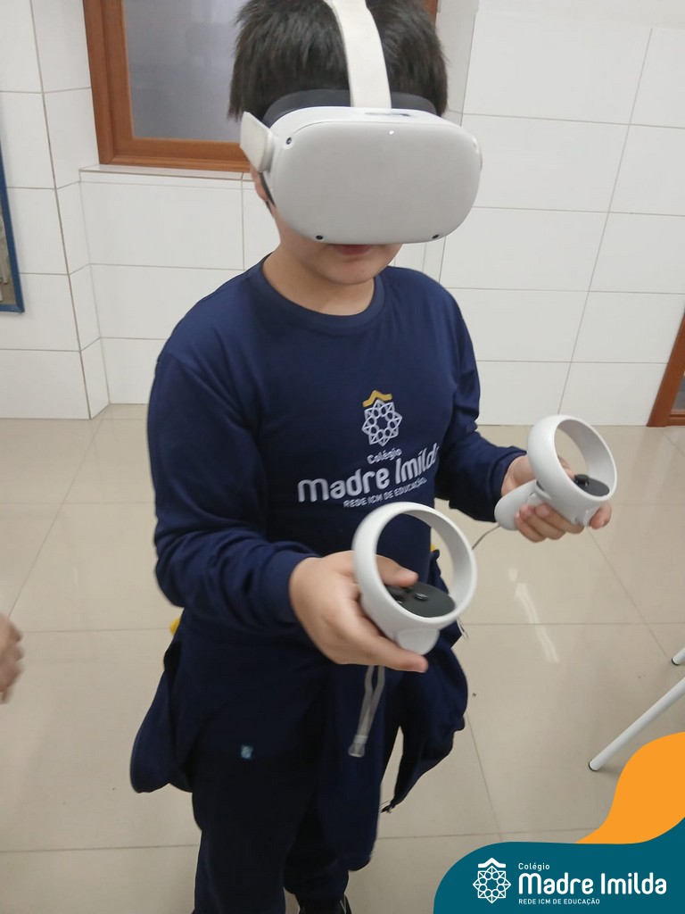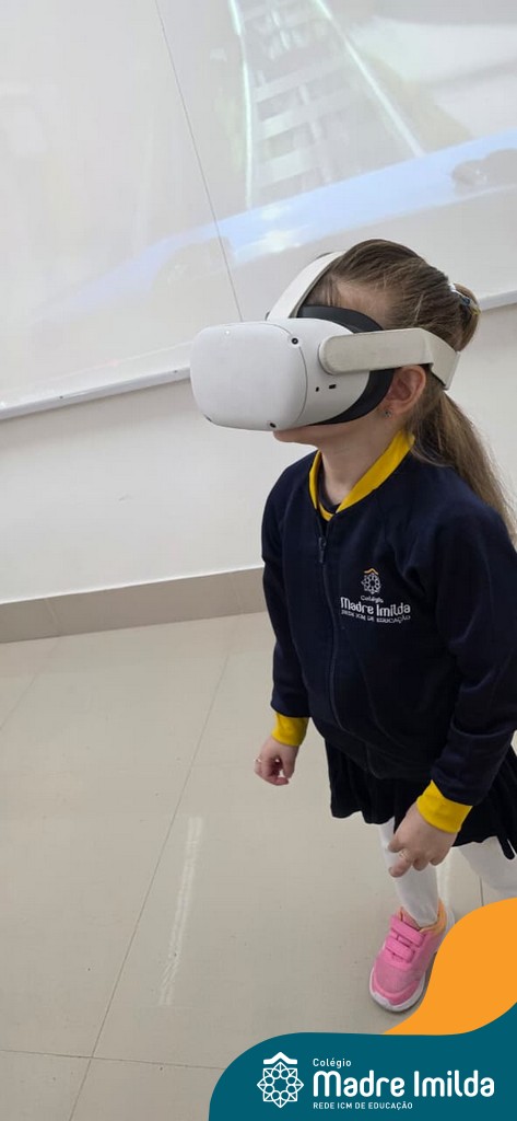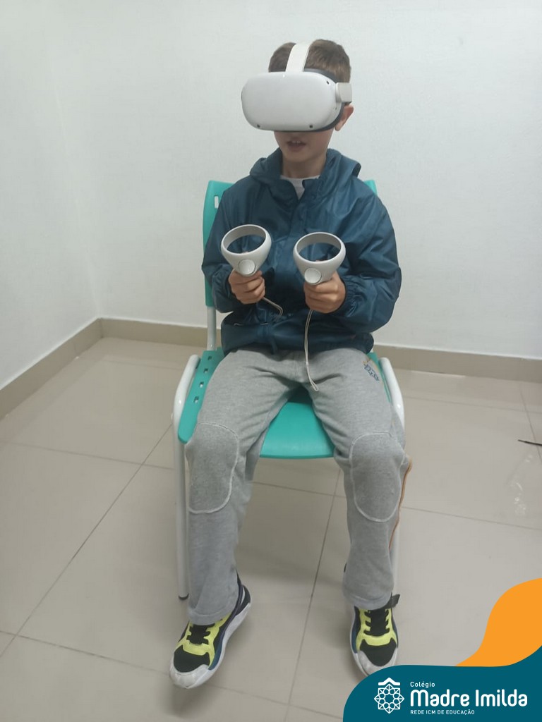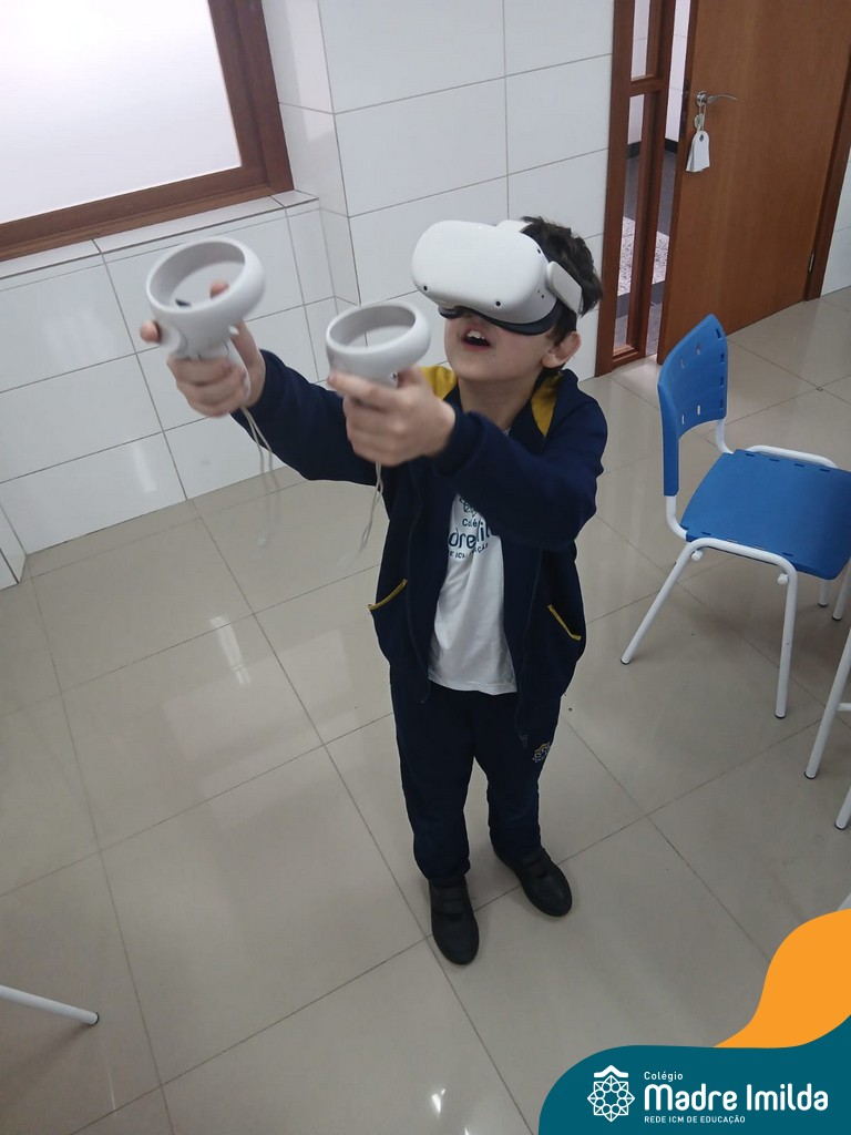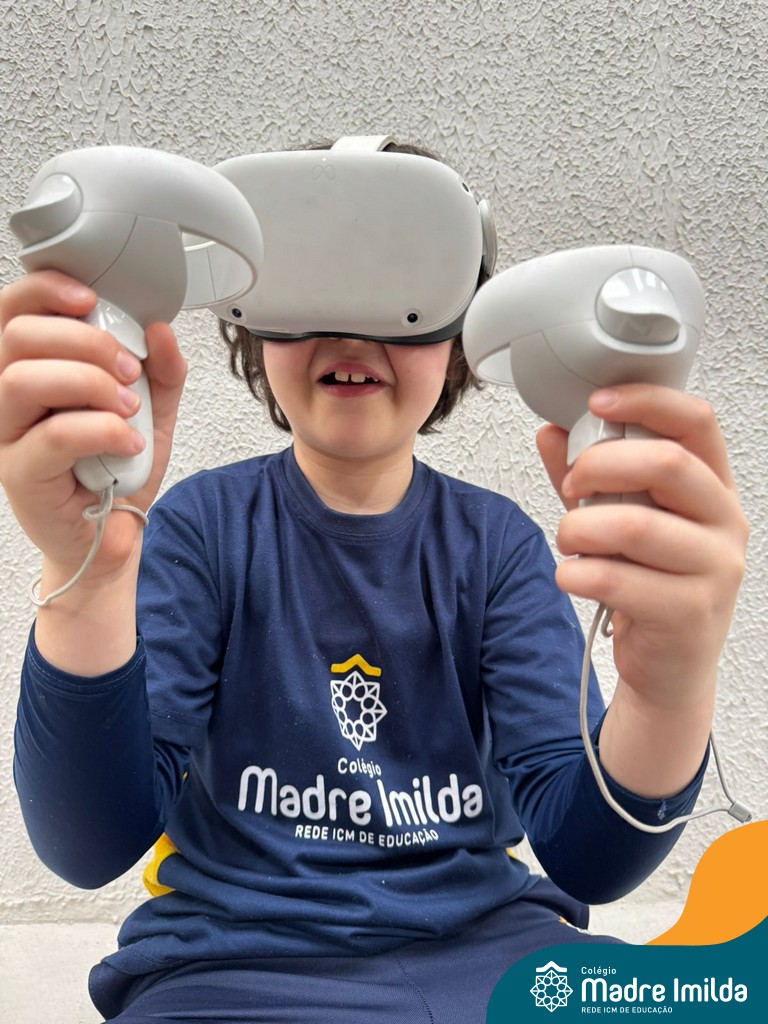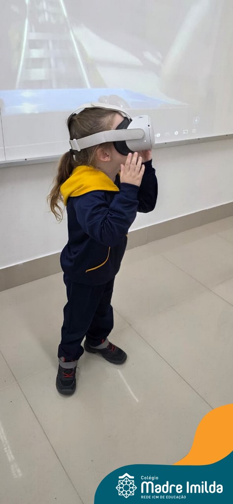 As atividades de Inglês, vôlei e brincadeiras coletivas fortalecem a comunicação, o trabalho em equipe e a coordenação motora. Já no Laboratório de Ciências, as experiências despertam a curiosidade natural das crianças: o “Dedo mágico”, o “Leite psicodélico”, a Areia Cinética, as reações químicas que formam gases e até o uso dos óculos de Realidade Virtual (VR) tornam o aprendizado algo vivo e encantador.