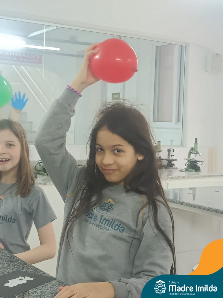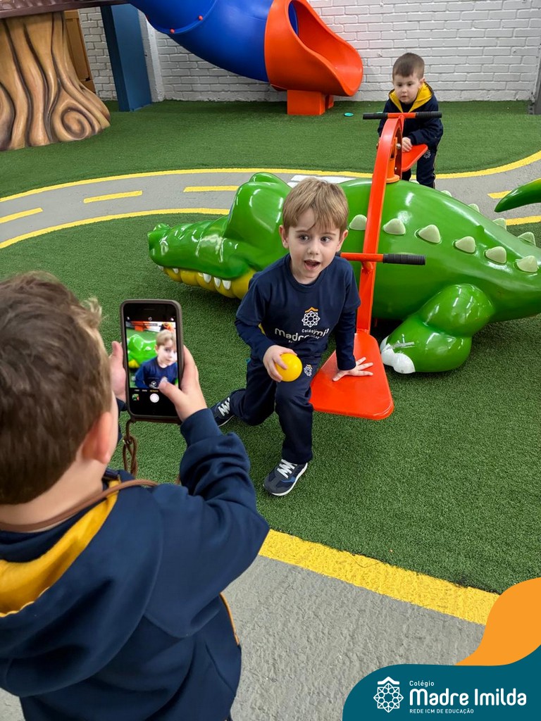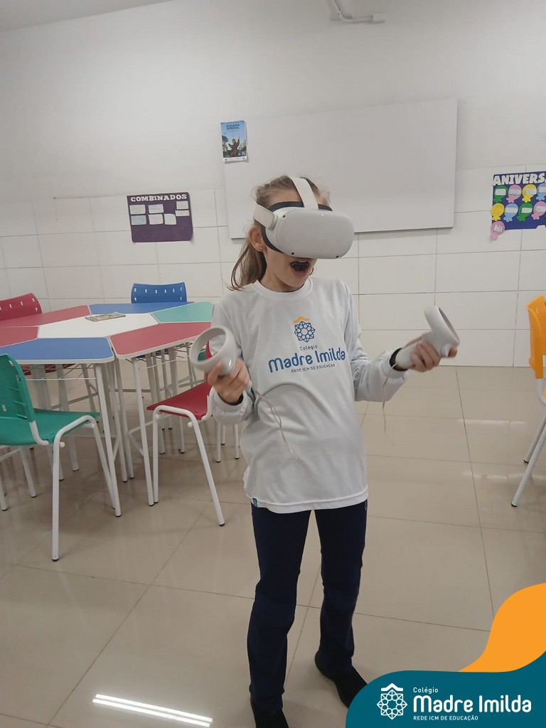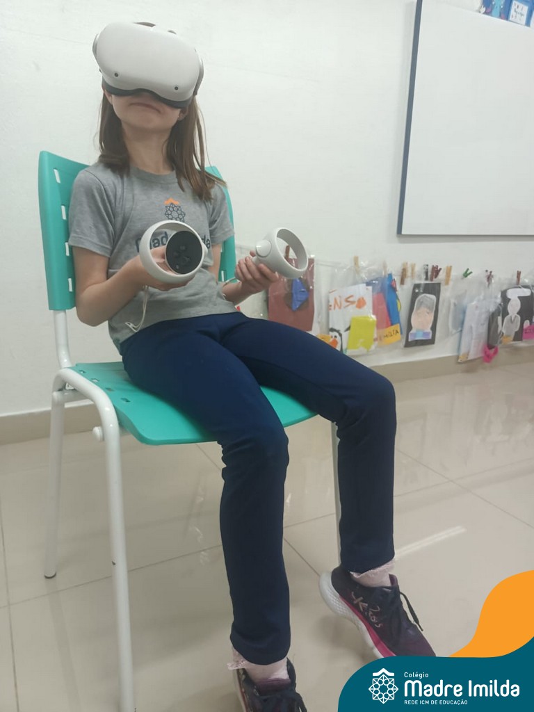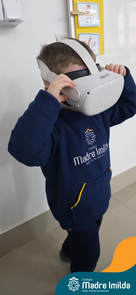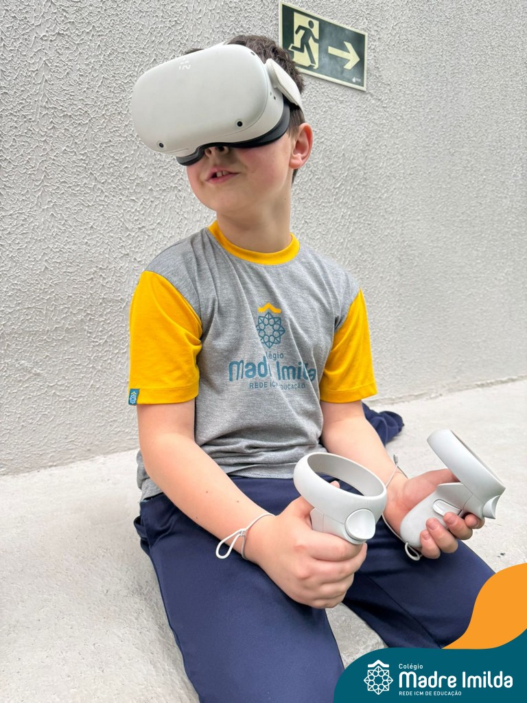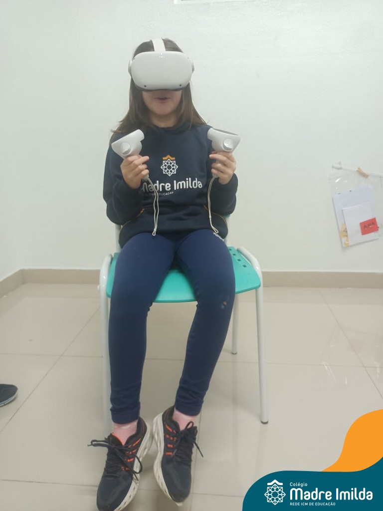 As atividades de Inglês, vôlei e brincadeiras coletivas fortalecem a comunicação, o trabalho em equipe e a coordenação motora. Já no Laboratório de Ciências, as experiências despertam a curiosidade natural das crianças: o “Dedo mágico”, o “Leite psicodélico”, a Areia Cinética, as reações químicas que formam gases e até o uso dos óculos de Realidade Virtual (VR) tornam o aprendizado algo vivo e encantador.